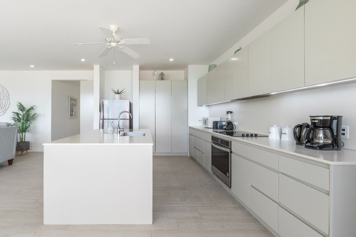 The interior of No. 10 Westmoreland Hills is designed to encourage easy, comfortable living. The open-plan layout connects the kitchen, dining area and living room, creating a welcoming space for socialising and spending time together. Large sliding glass doors allow natural light to fill the room and open directly onto the patio, ensuring that the ocean views can be enjoyed from inside the villa as well.
