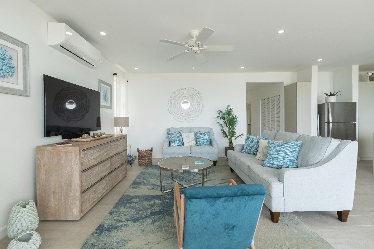 Outdoor living is central to the experience at this villa. The private pool, set against the backdrop of the Caribbean Sea, is the perfect place to cool off or unwind. The surrounding deck offers numerous seating and lounging options, allowing guests to enjoy the sunshine throughout the day.