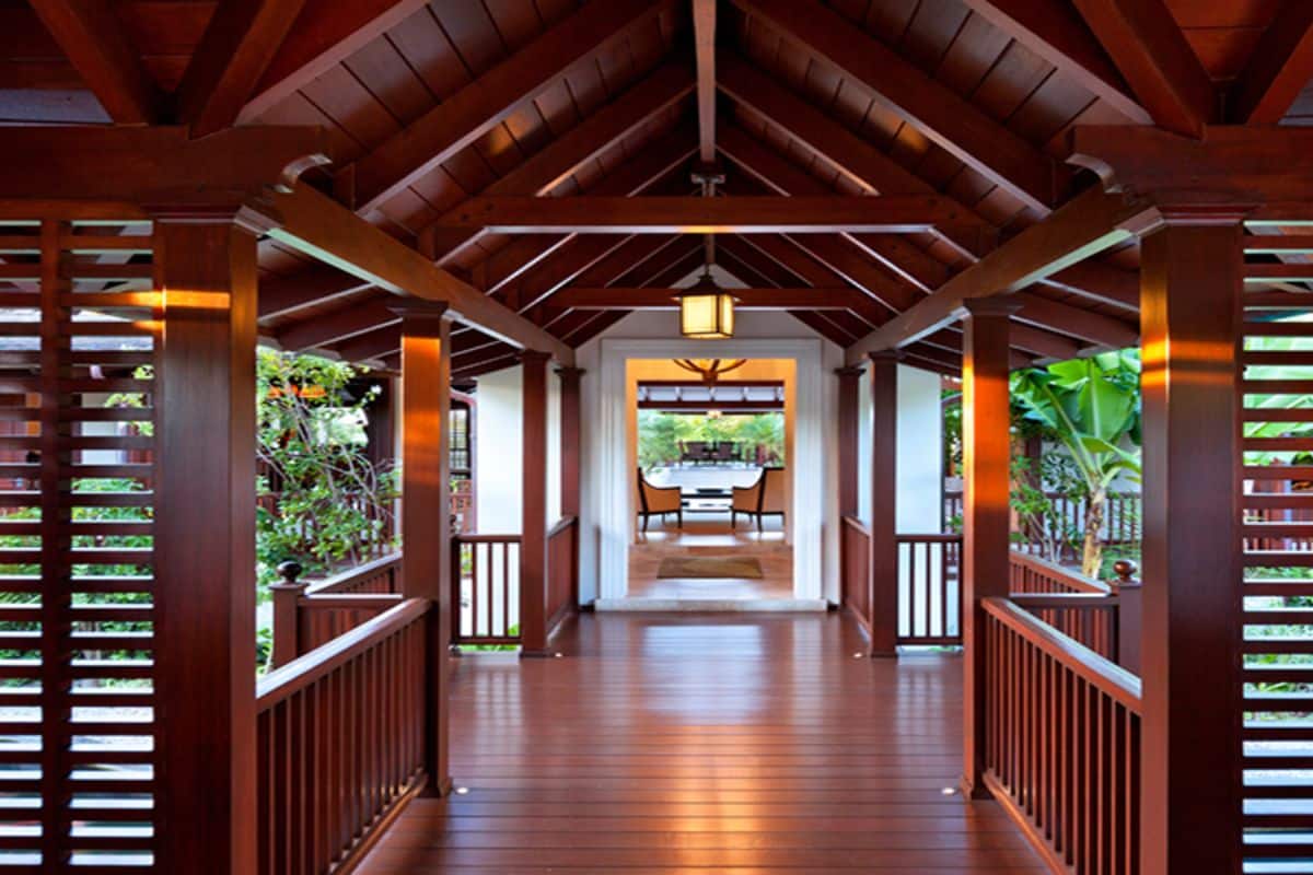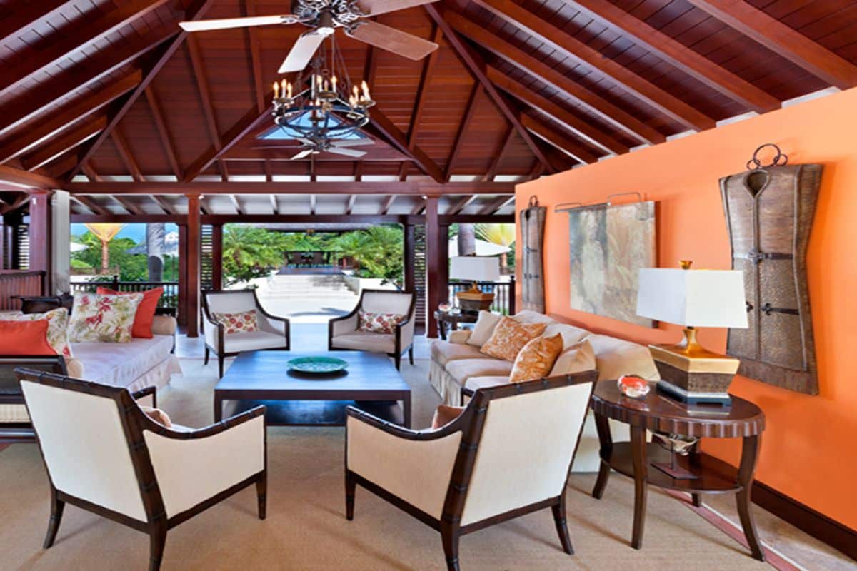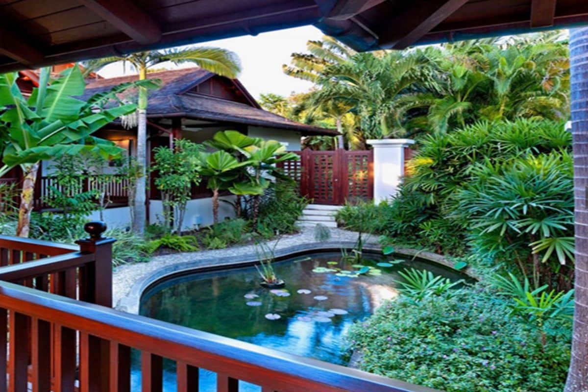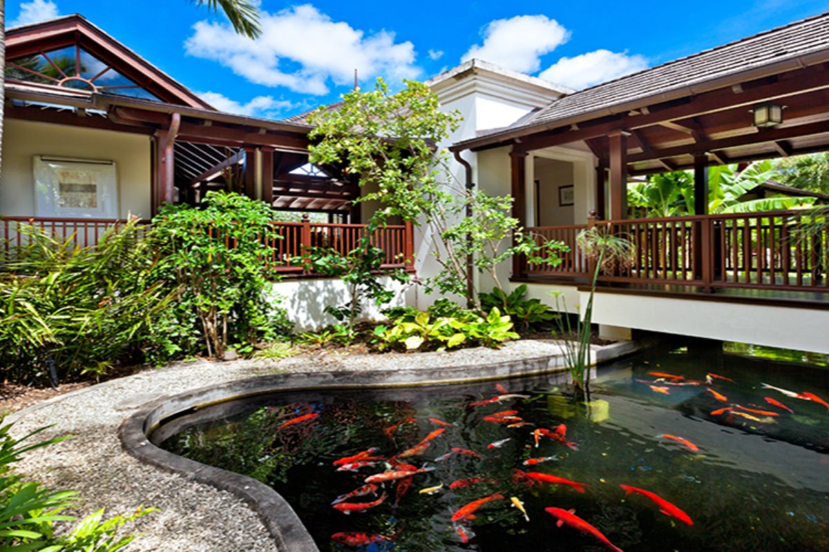 A dark wood walkway leads across an Oriental-style koi pond into the central courtyard, where a breezy lounge and elevated dining area create inviting spaces for relaxation and entertaining. The dining area comfortably seats eight to ten guests and is perfectly positioned for meals prepared by a private chef.