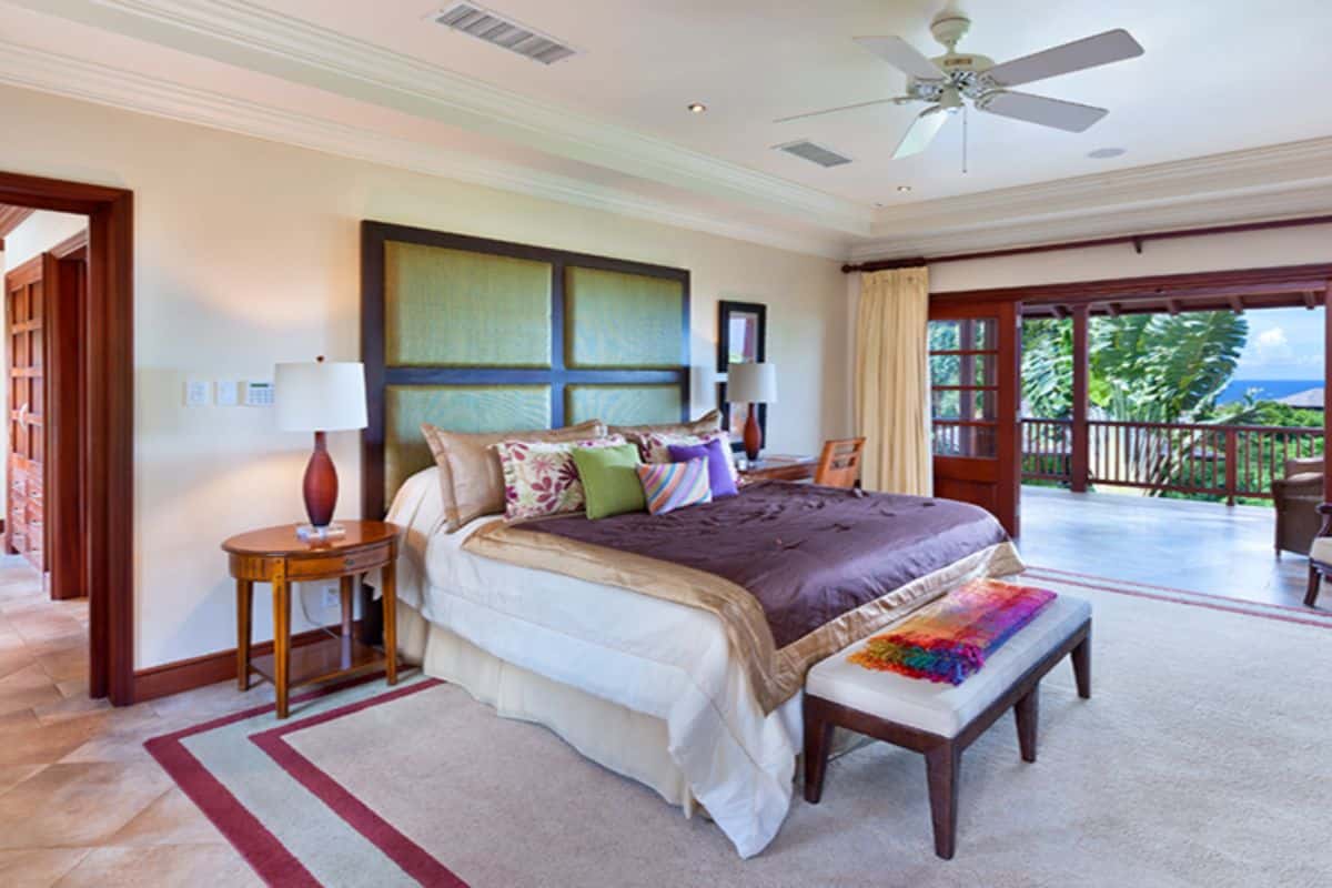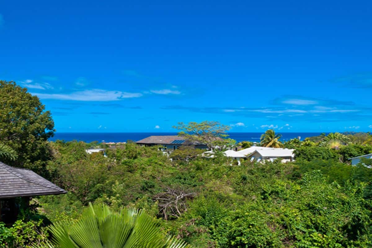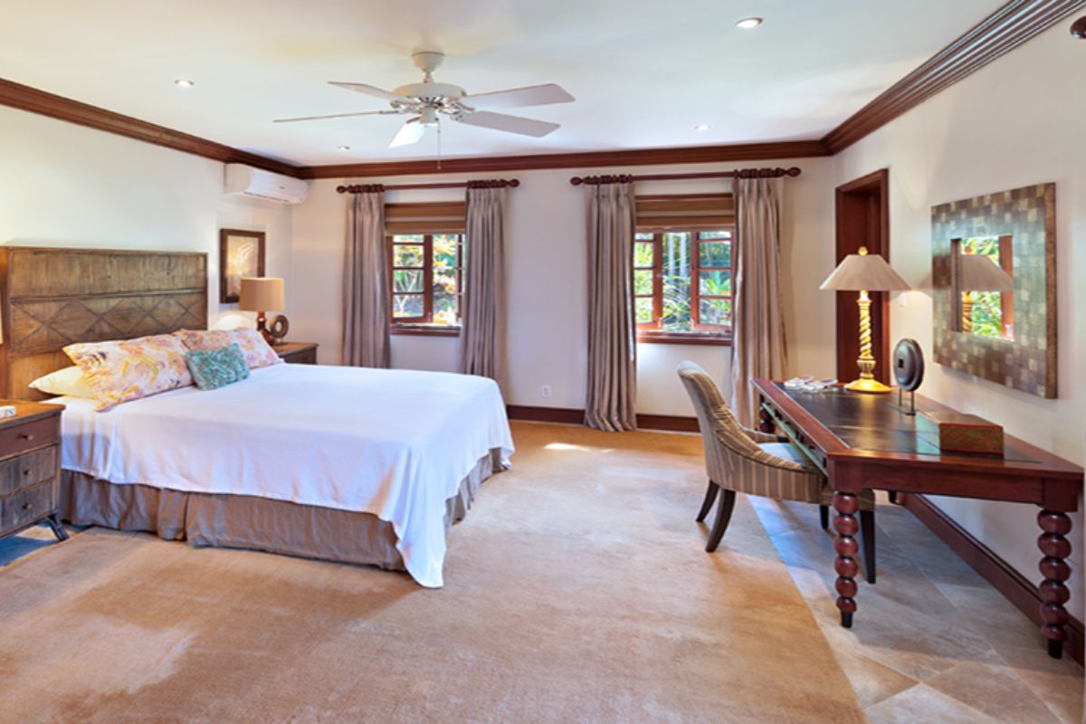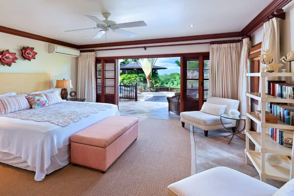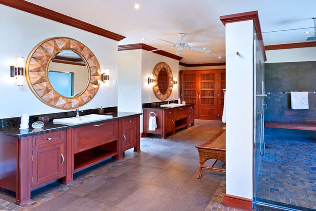 The entire upper level is dedicated to the impressive primary suite. This expansive retreat includes his-and-hers dressing rooms, double vanity washbasins, a rain shower wet room, and a vintage freestanding outdoor bathtub set within a private terrace. From the master terrace, guests can enjoy sweeping views of the gardens and glimpses of the Caribbean Sea in the distance.
