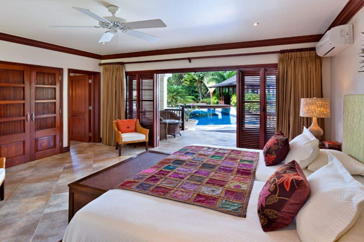 Three bedrooms are located on the ground floor, each air-conditioned and complete with its own en-suite bathroom. These rooms offer immediate access to the pool deck, making early morning swims or sunset relaxation effortless.