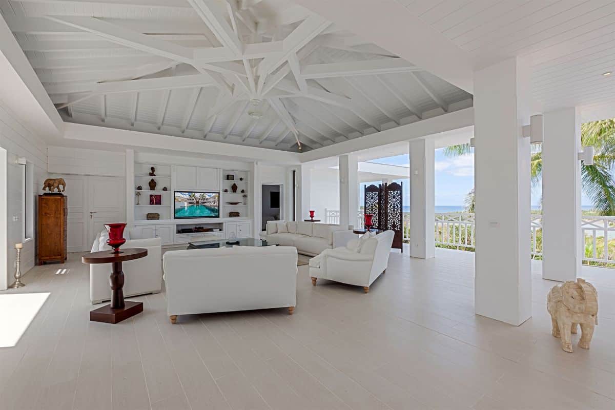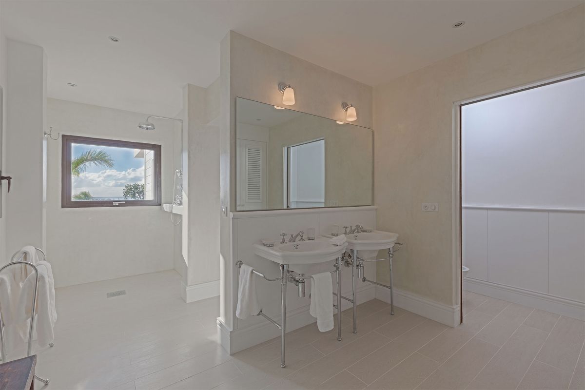 A grand staircase leads from the main level to an extensive terrace featuring a large infinity pool and a shaded gazebo. The outdoor dining and lounge areas are furnished with pieces by Paola Lenti and Tribu, offering the perfect setting for relaxing, entertaining, or enjoying the Caribbean sunset. The pool terrace also provides direct access to four of the villa’s bedroom suites, ensuring that every room has a close connection to the outdoors. With its combination of luxurious amenities, open-air spaces, and breathtaking views, Villa Always is an exceptional Caribbean retreat.