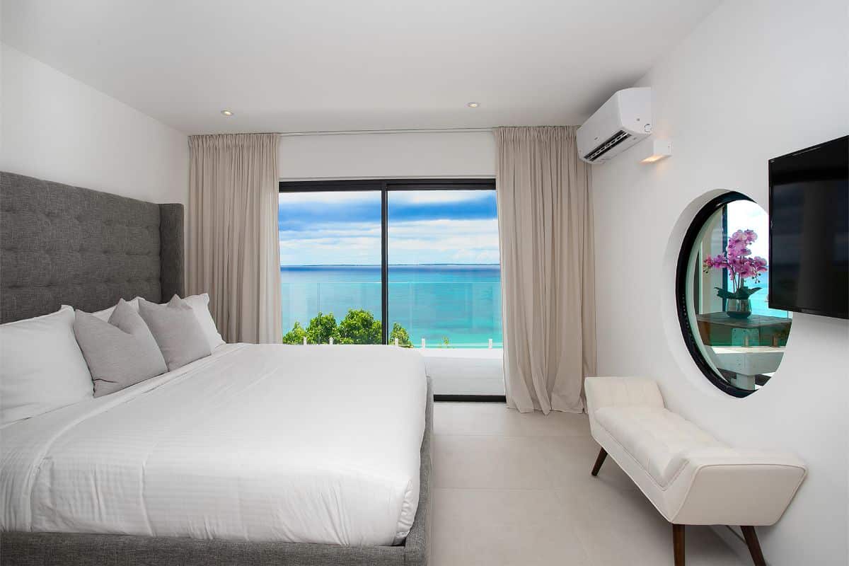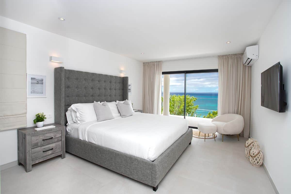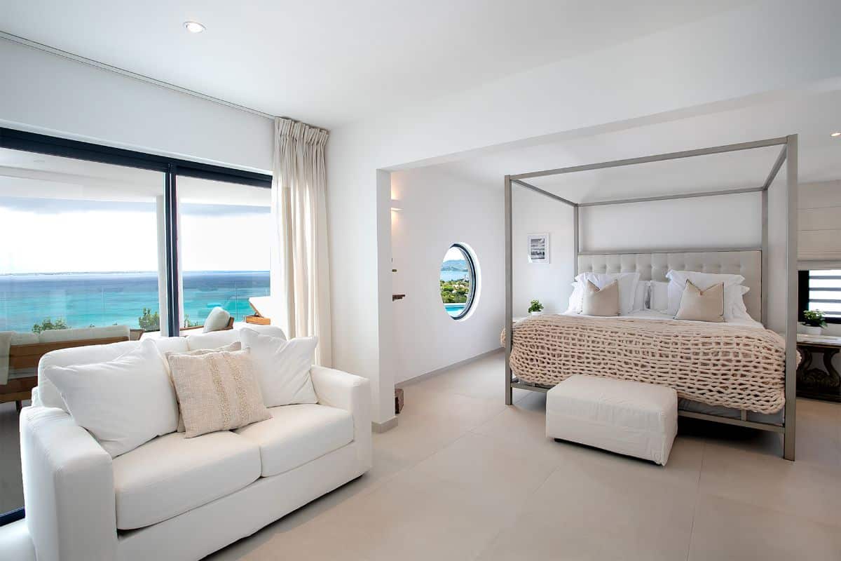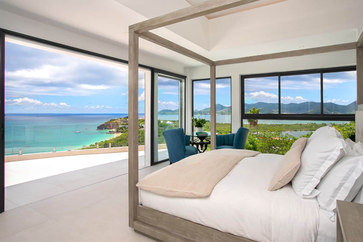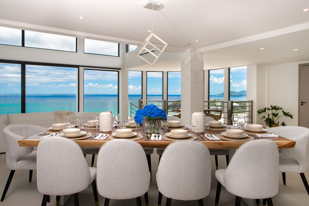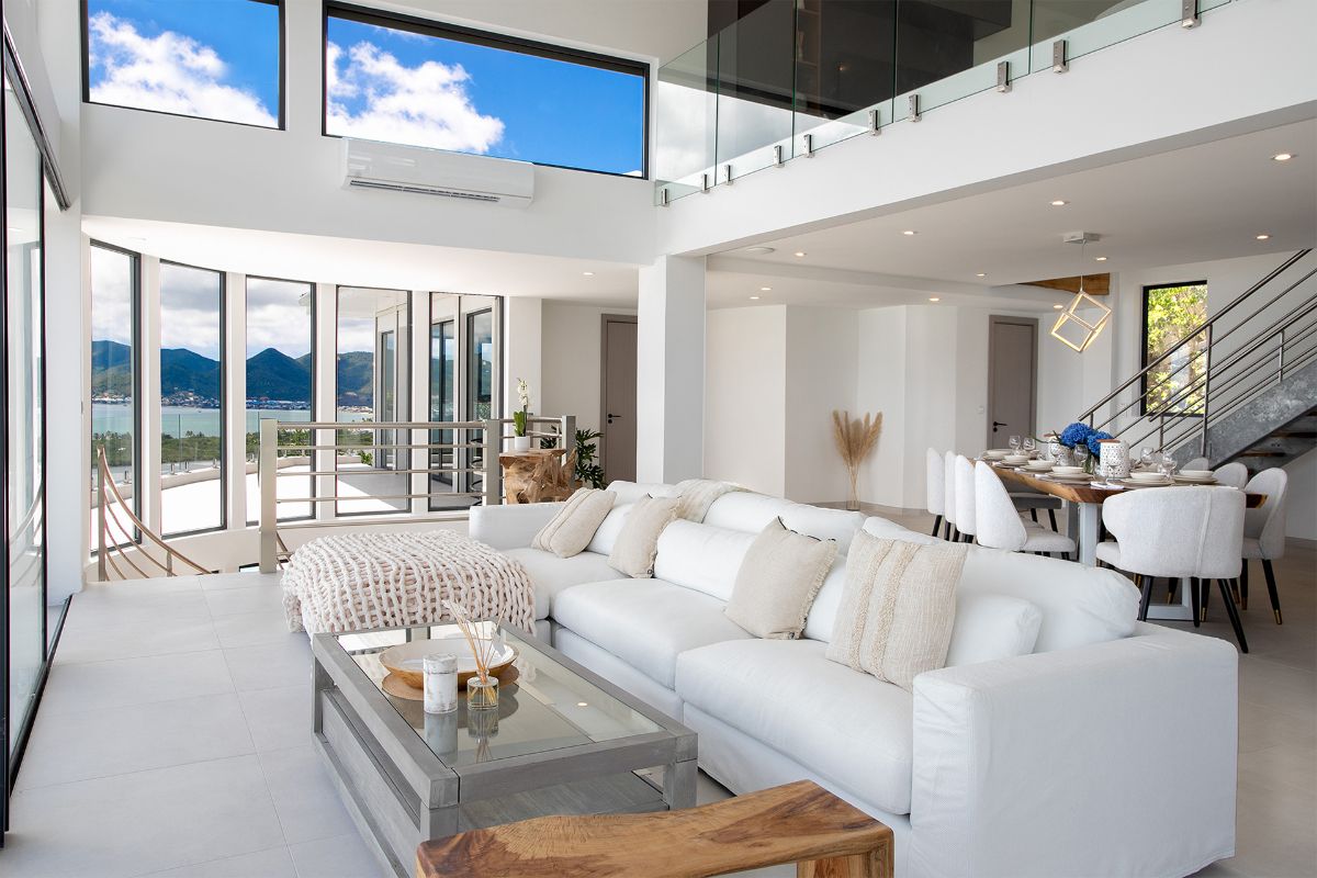 From the main seating area, guests can take in panoramic views of the sea and distant Anguilla—a view that transforms into a glittering spectacle after sunset. The home’s multi-level design and expansive windows ensure that the ocean remains the focal point, wherever you are.
