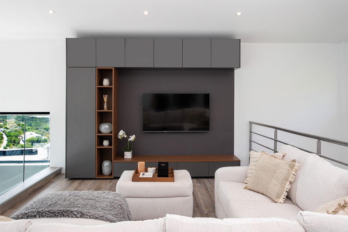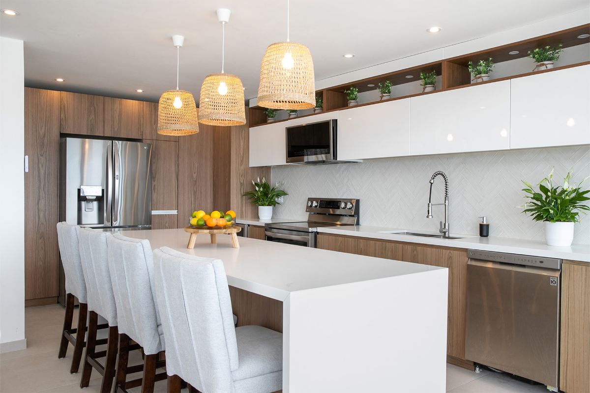 The central living room features a large L-shaped sofa and a state-of-the-art Bose sound system, ideal for entertainment or quiet evenings. A floating mezzanine-style lounge overlooks the main area, offering a cozy nook for movie nights or conversation. At the heart of the home sits a refined wooden dining table and a fully equipped modern kitchen, complete with a large island, double-door refrigerator, wine cooler, and Nespresso machine. Every detail has been thoughtfully curated to blend functionality with style.