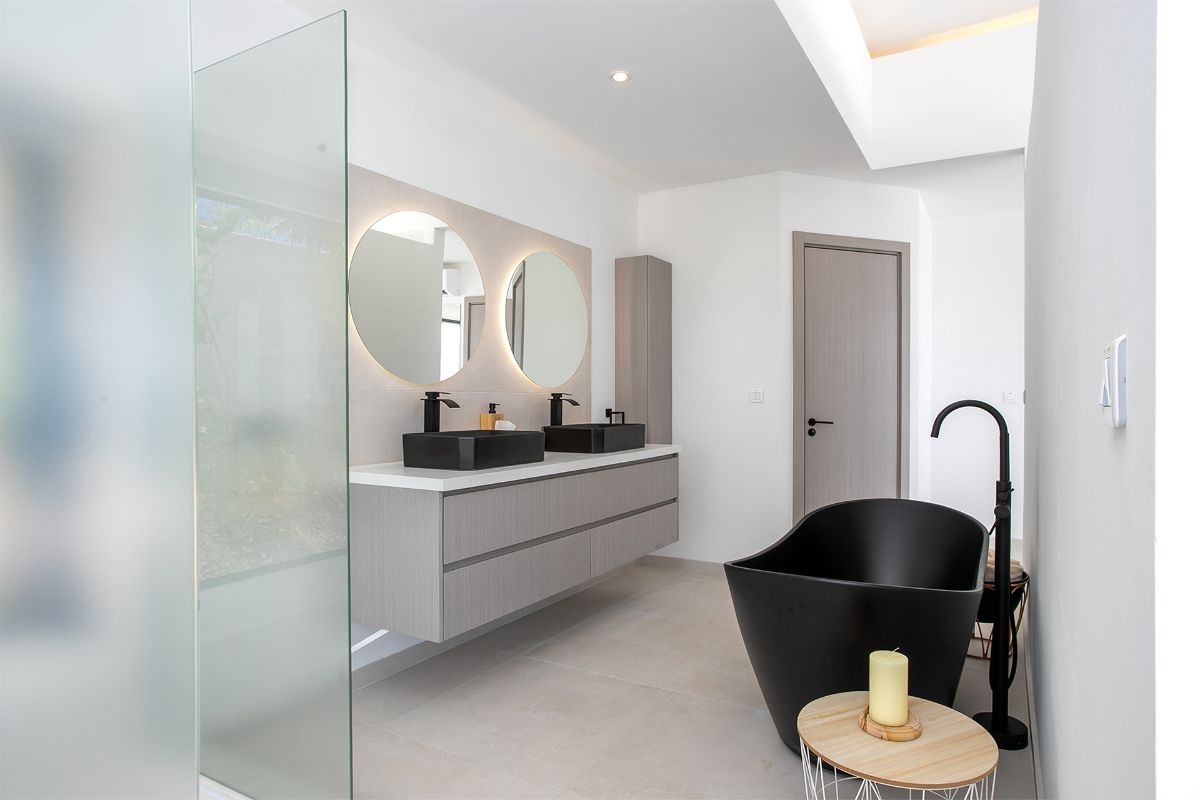 The three additional bedrooms are situated on the lower level, each with its own en-suite bathroom, generous closet space, and king-size bed. These rooms combine privacy with proximity, allowing guests to enjoy peaceful retreats while remaining close to the villa’s main living and social areas. Every bedroom blends natural textures and soft tones with modern finishes, ensuring a restful ambiance throughout.