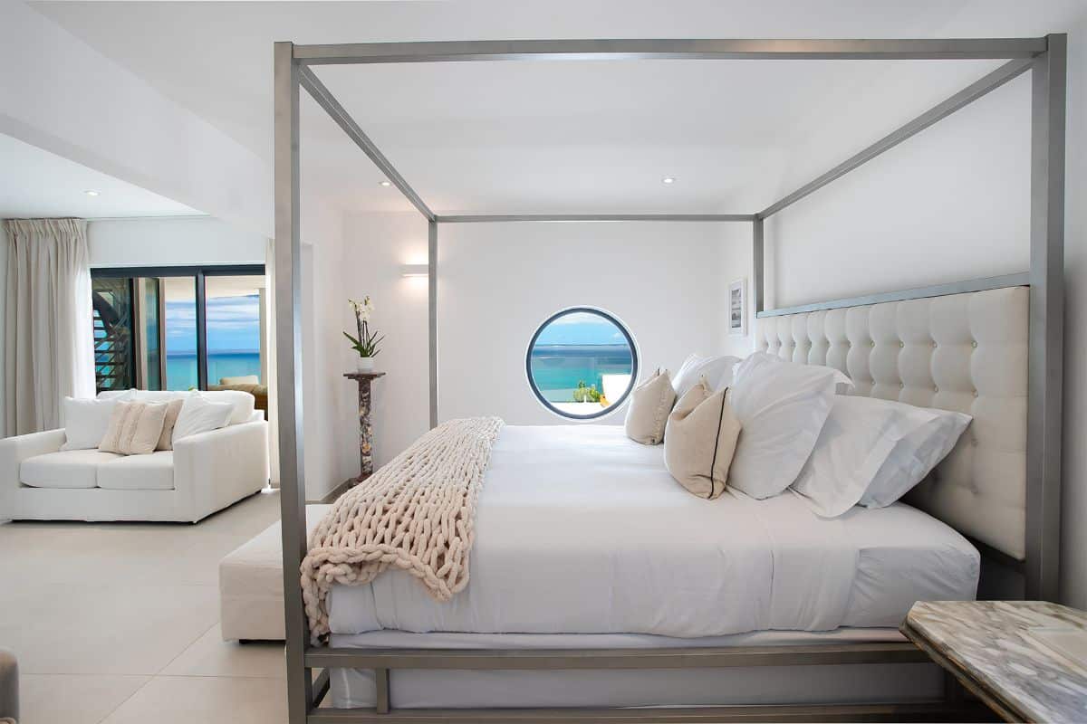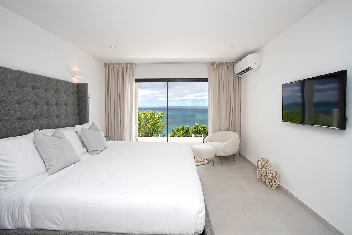 Villa Aqua Rock features four exquisite bedrooms, each designed as a private oasis of calm and comfort. The master suite, located on the main level, opens directly to breathtaking sea views, allowing guests to wake up to the sight and sound of the Caribbean. Behind the king-size bed lies a double vanity, walk-in closet, and a spacious en-suite bathroom featuring a large rain shower and a striking black soaking tub that looks out toward the sea—perfect for moments of complete relaxation.