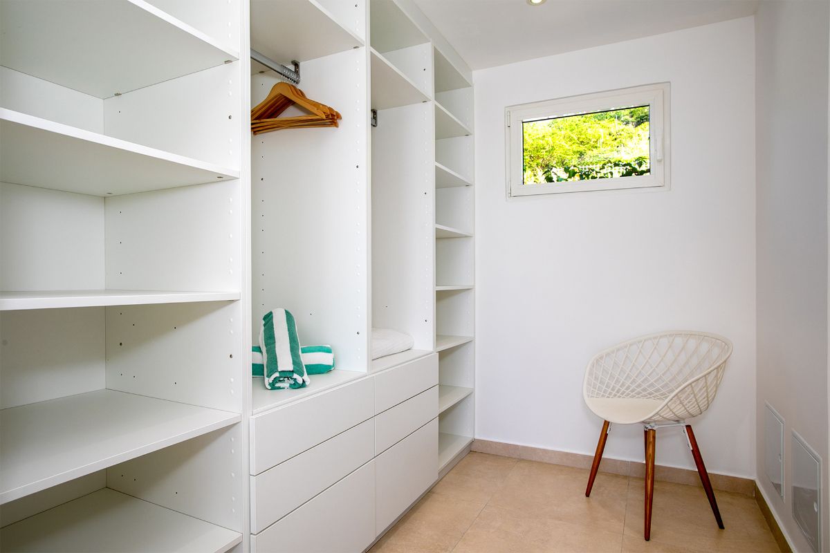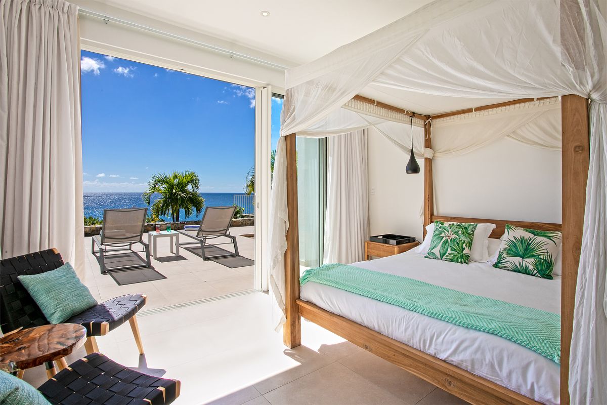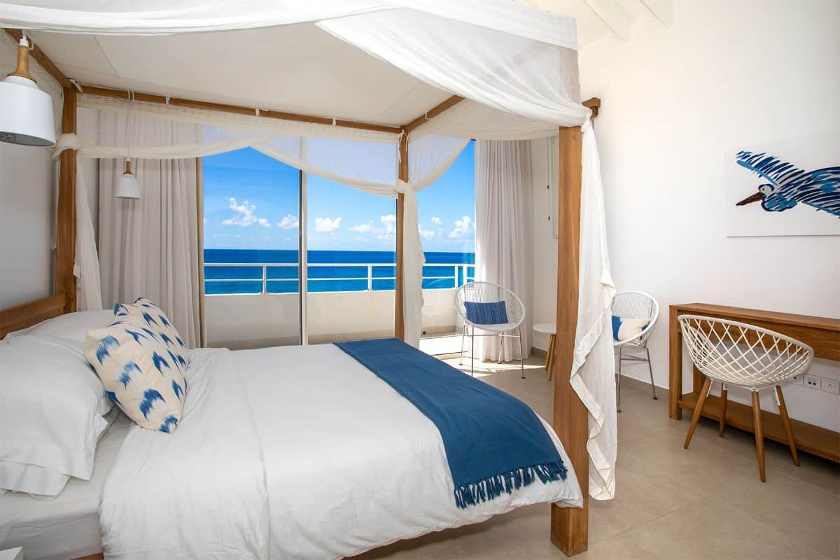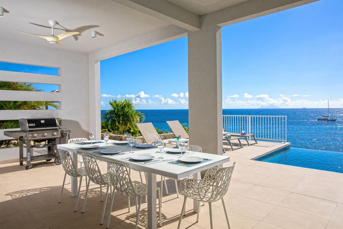 The terrace also includes an alfresco dining area with a large gas grill, making it easy to enjoy outdoor meals against the backdrop of golden sunsets over the Caribbean. Every element of the outdoor space—from the soft color palette to the natural flow between areas—has been designed to enhance the villa’s atmosphere of effortless luxury.