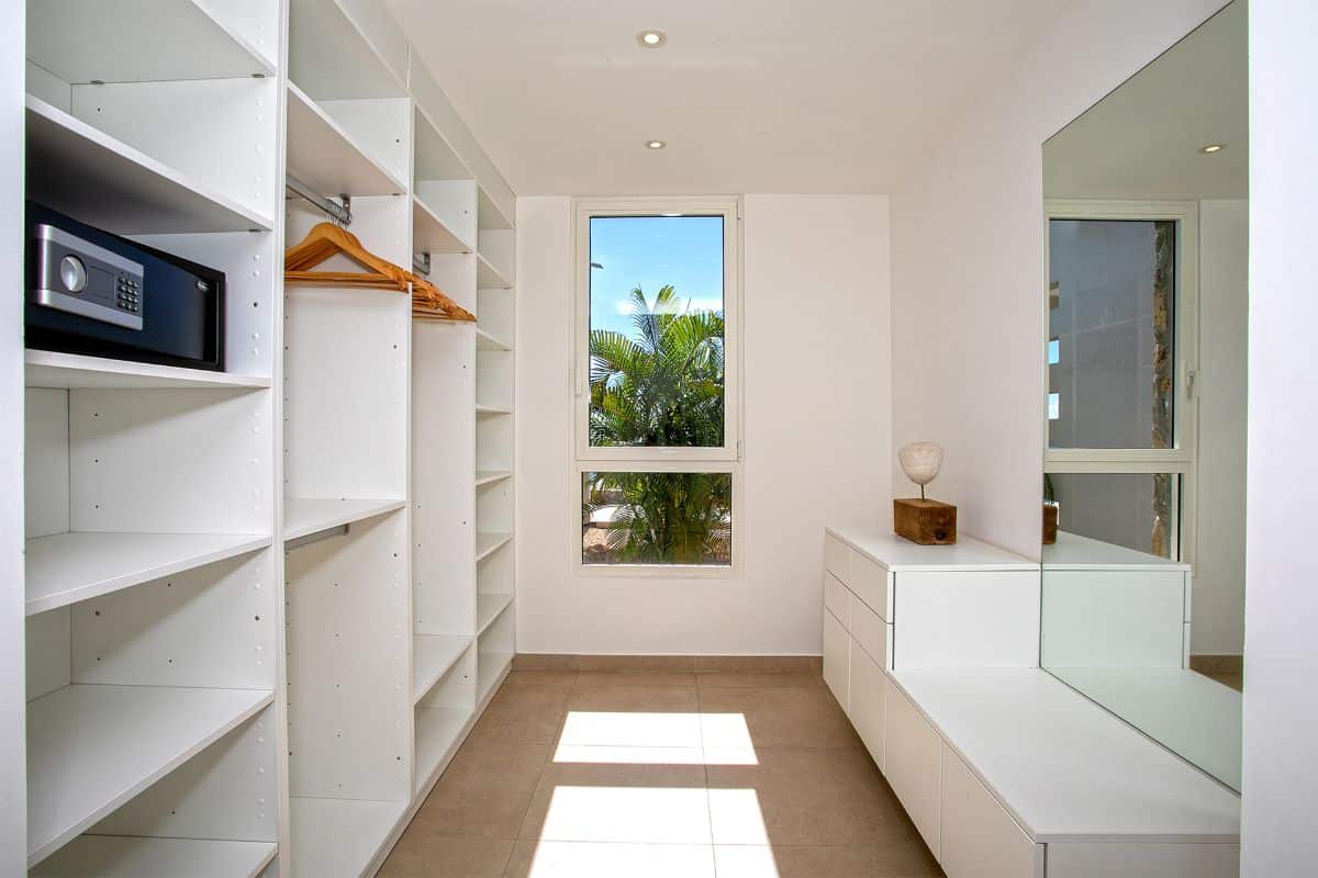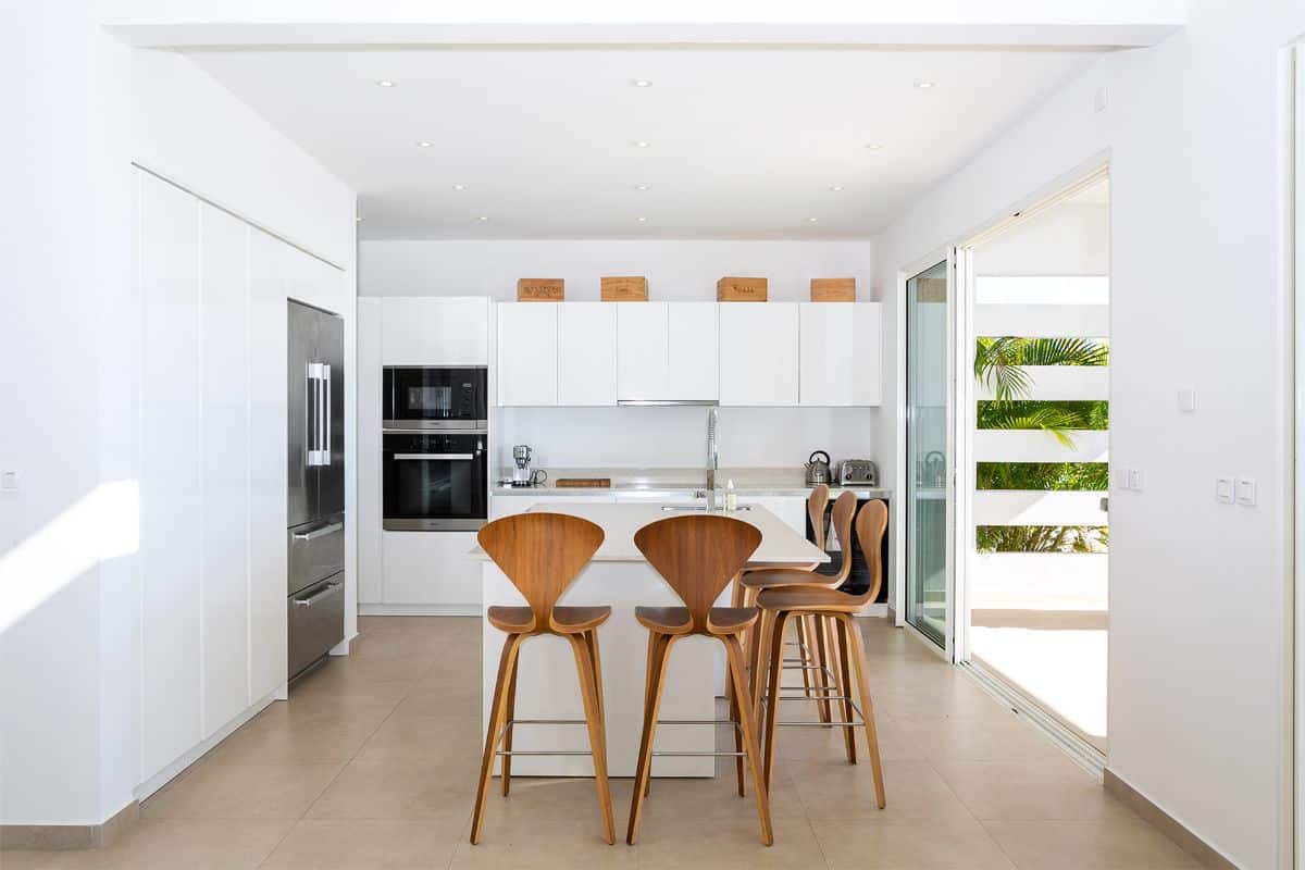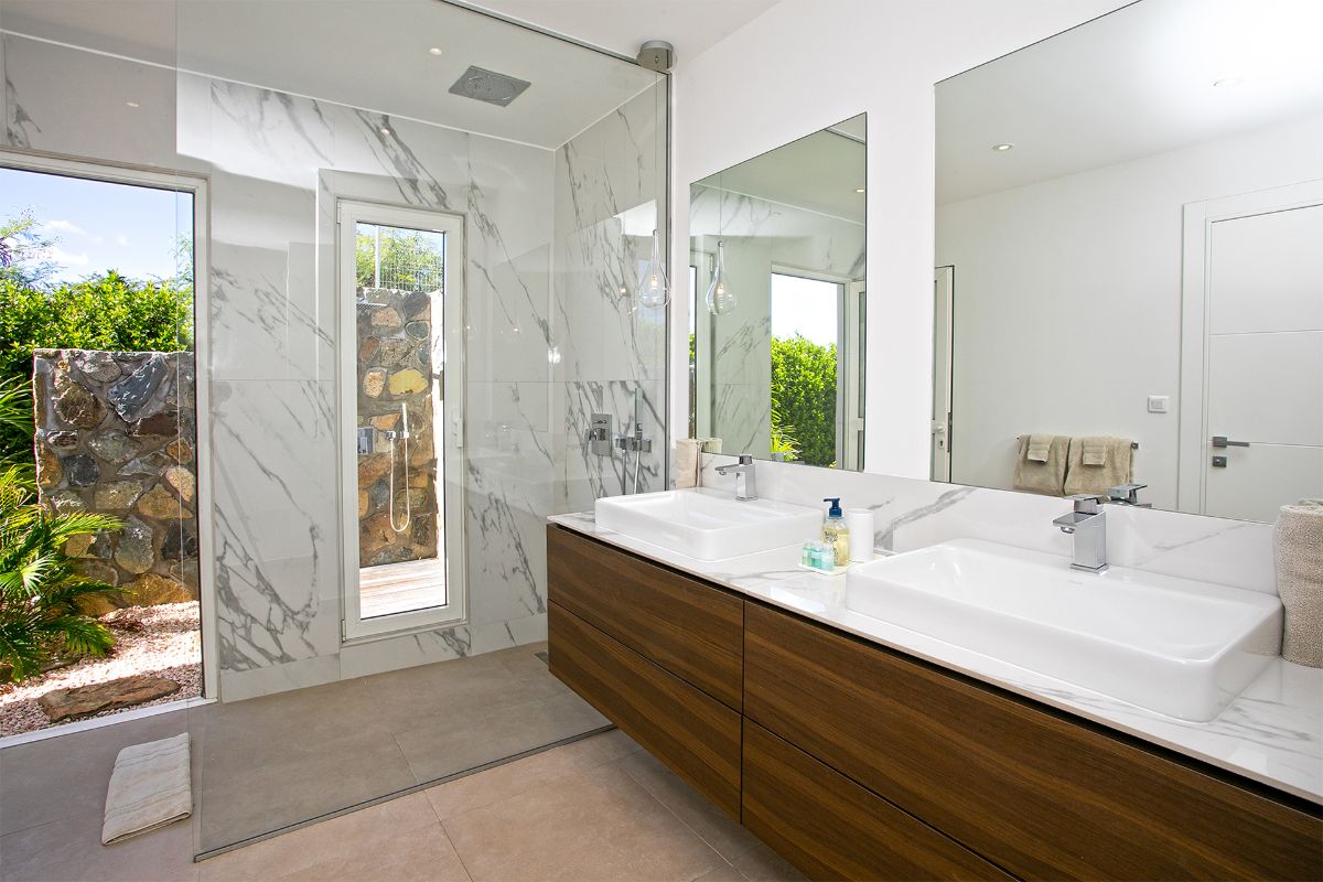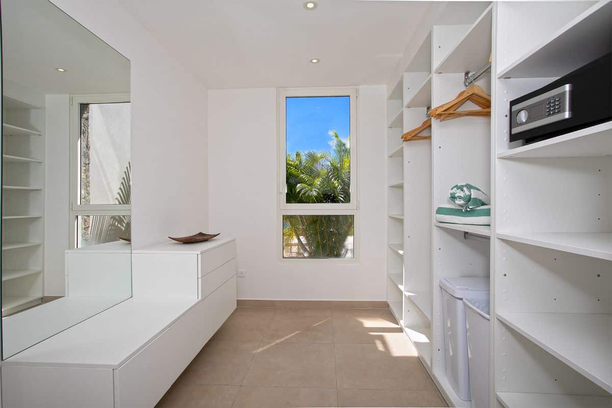 The terrace also includes an alfresco dining area with a large gas grill, making it easy to enjoy outdoor meals against the backdrop of golden sunsets over the Caribbean. Every element of the outdoor space—from the soft color palette to the natural flow between areas—has been designed to enhance the villa’s atmosphere of effortless luxury.