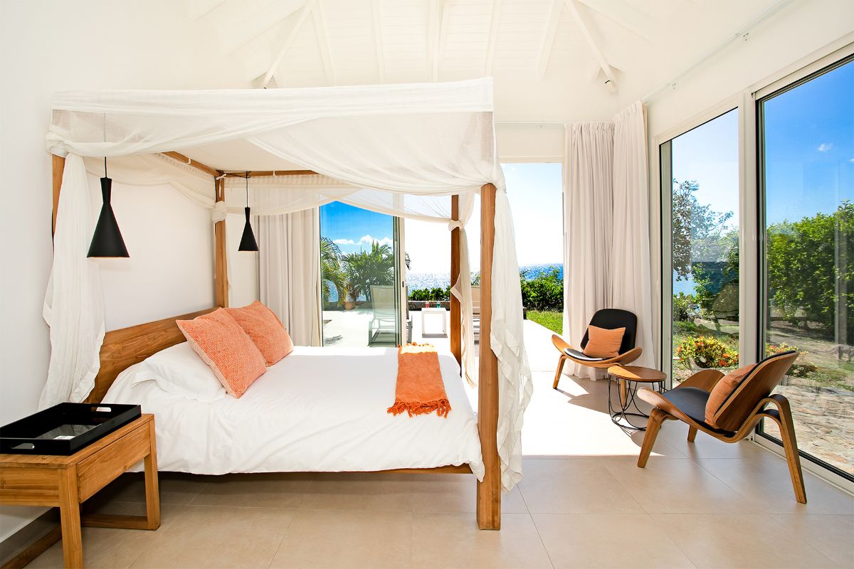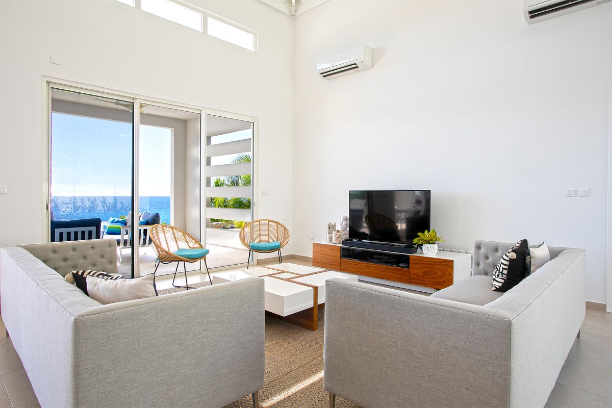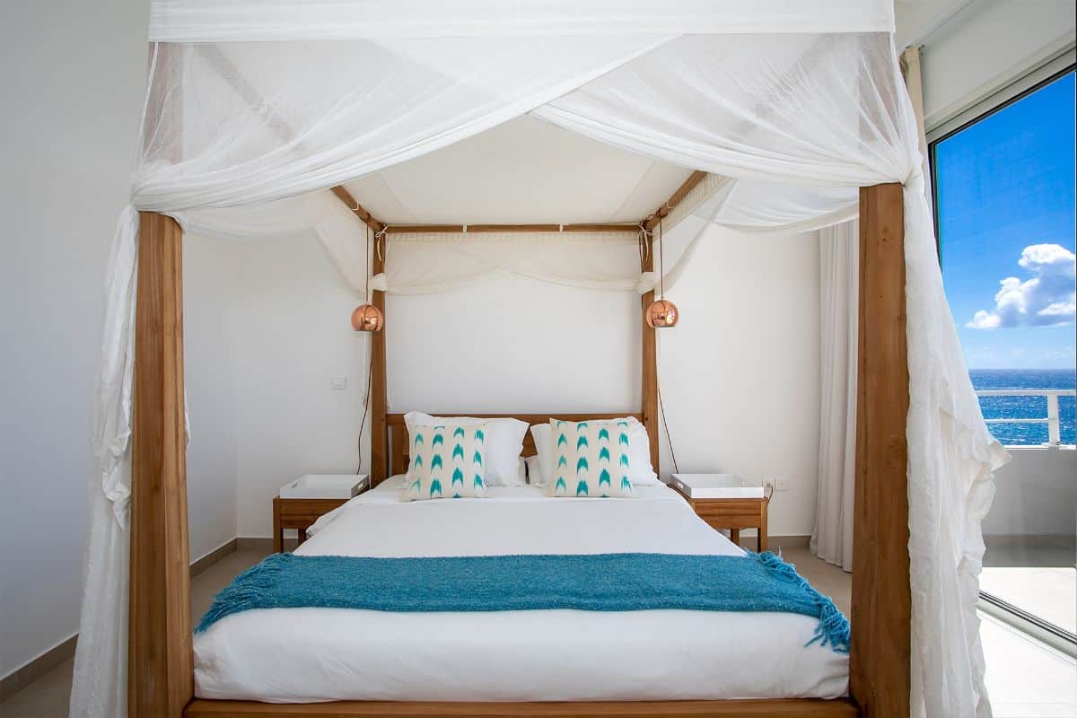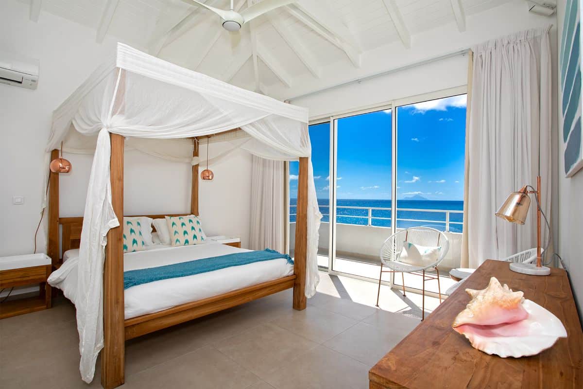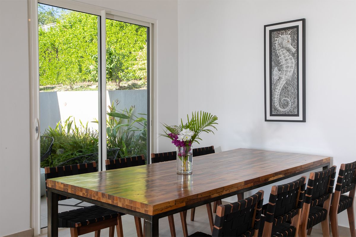 The interior of Villa Aqua is a study in refined simplicity. The luminous open-plan living area is filled with natural light from floor-to-ceiling glass doors, which open fully to the terrace and pool. The décor features crisp white walls complemented by touches of soft sea green, coral pink, and natural wood—subtle, sophisticated, and perfectly Caribbean.