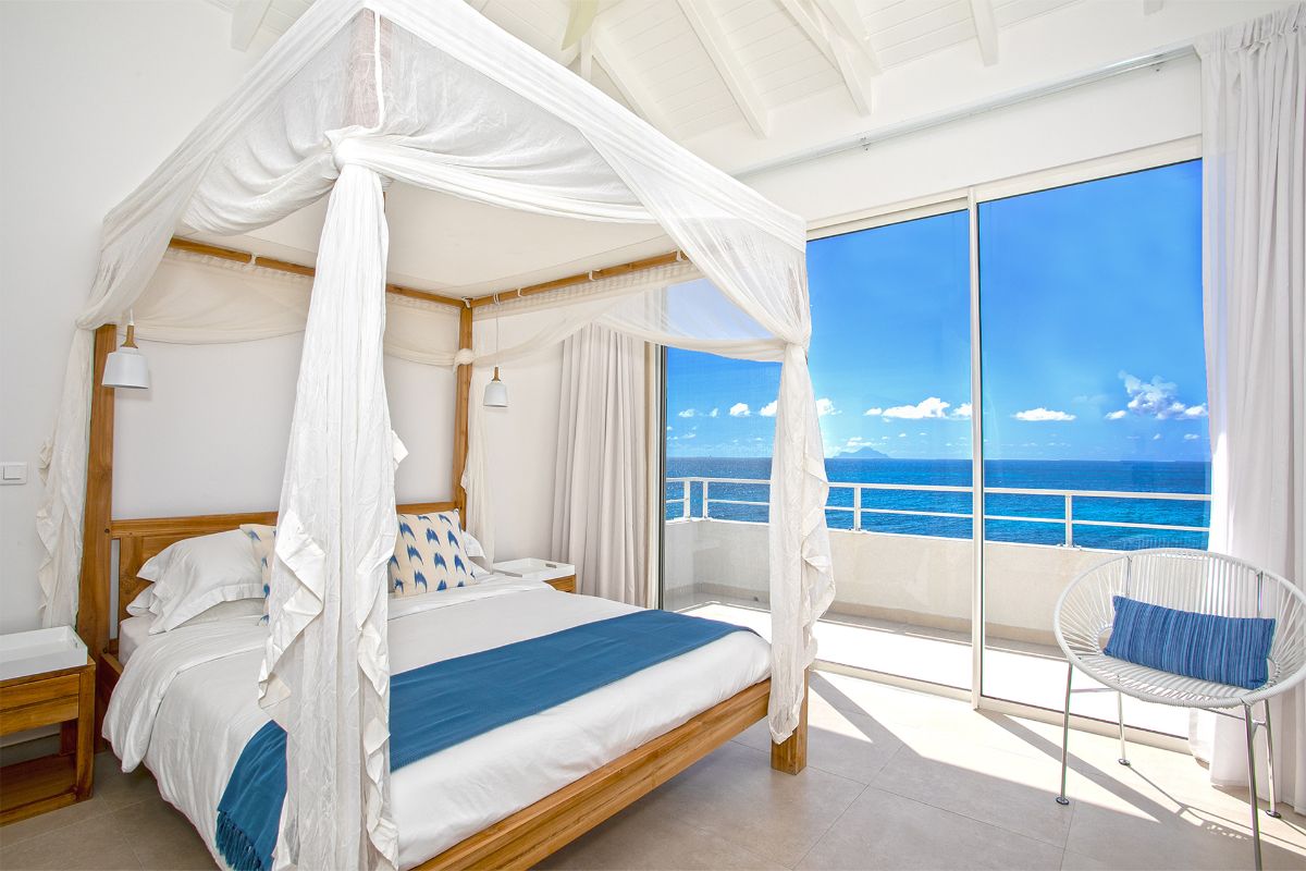 Villa Aqua features four beautifully designed bedrooms, each offering serene sea views, elegant furnishings, and en-suite bathrooms. The master and second bedrooms are located on the main level, both featuring queen-size four-poster canopy beds, spacious walk-in closets, and private sea-view terraces with sun loungers—perfect for morning coffee or quiet reflection. The master suite also includes a luxurious en-suite bathroom that opens to an outdoor spa shower for an indulgent alfresco experience.