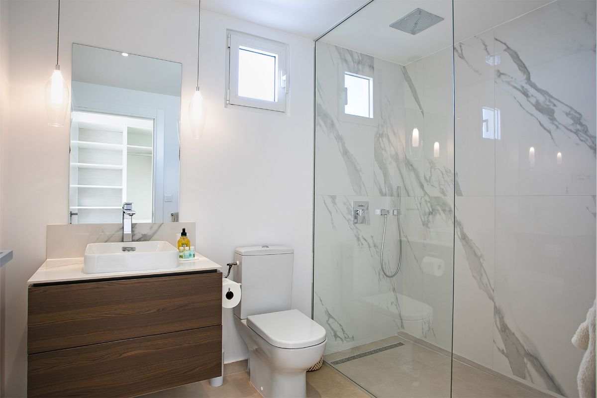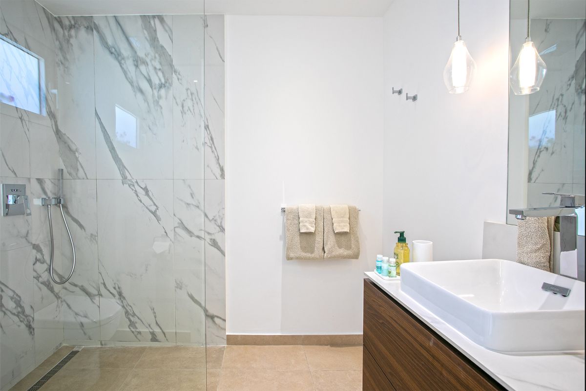 Upstairs, two additional queen-size bedrooms continue the villa’s modern design aesthetic with sea-view balconies, walk-in closets, and stylish en-suite bathrooms featuring glass-walled rain and handheld showers. Each room combines minimal elegance with the soothing tones of natural wood and soft ocean-inspired accents, creating a sense of calm that mirrors the sea beyond.