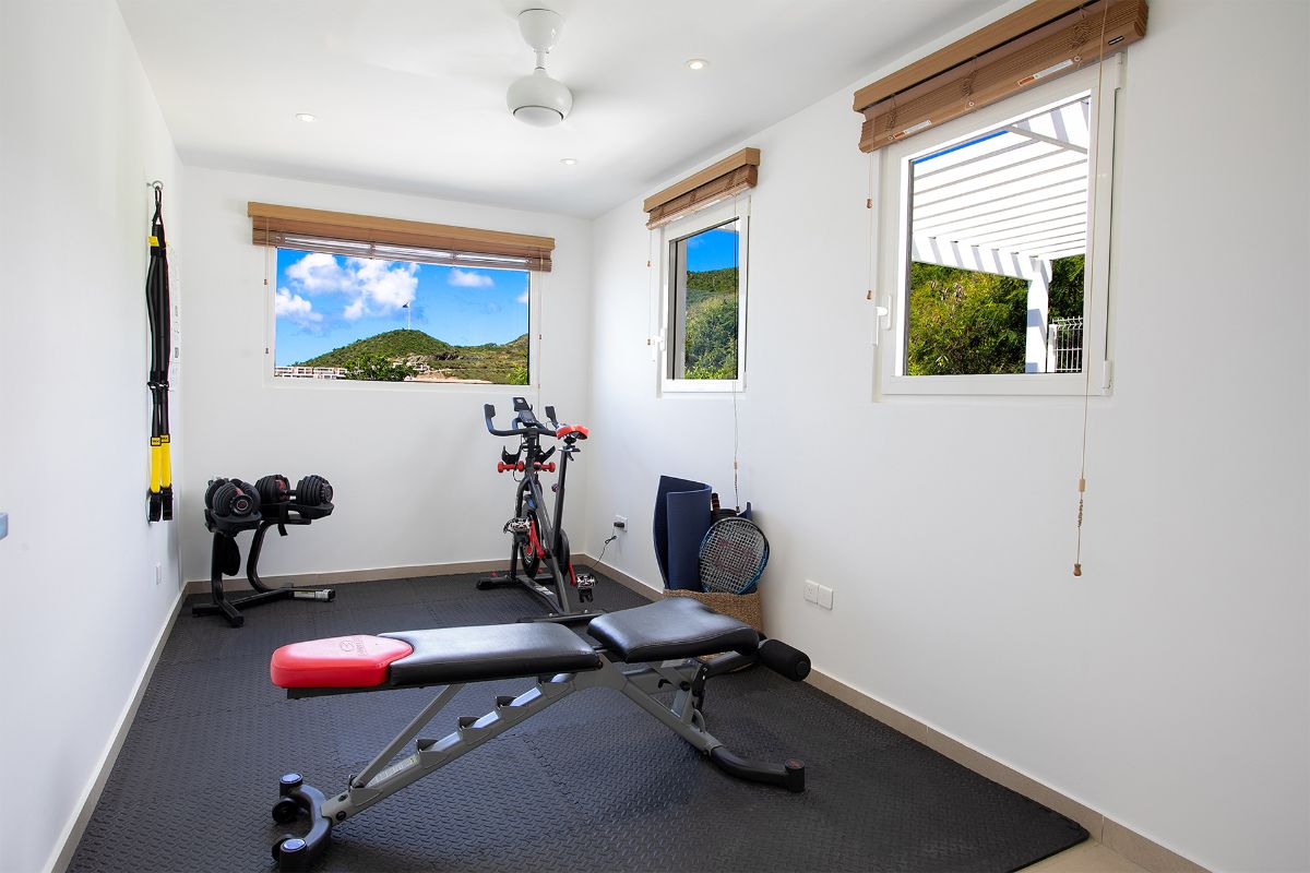 An exercise room equipped with a stationary bike, bench, and free weights is located to the rear of the main level, providing a convenient space to stay active during your stay.