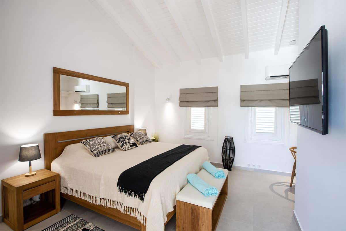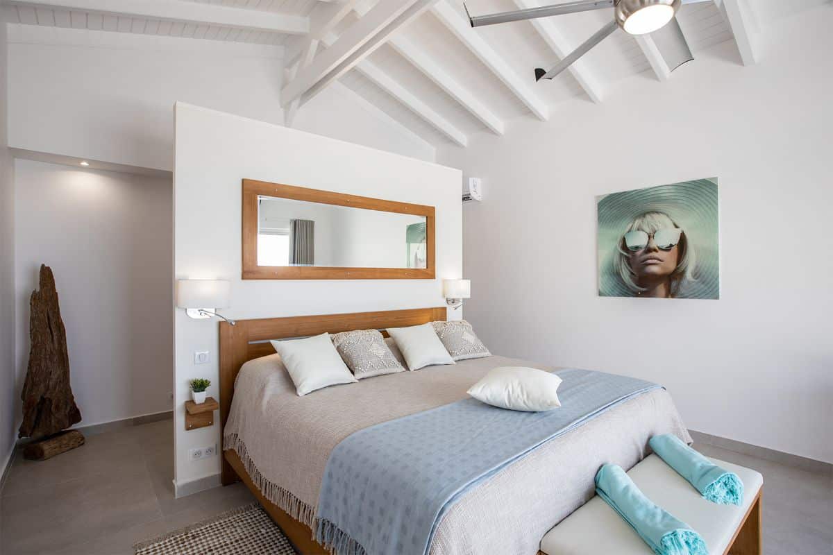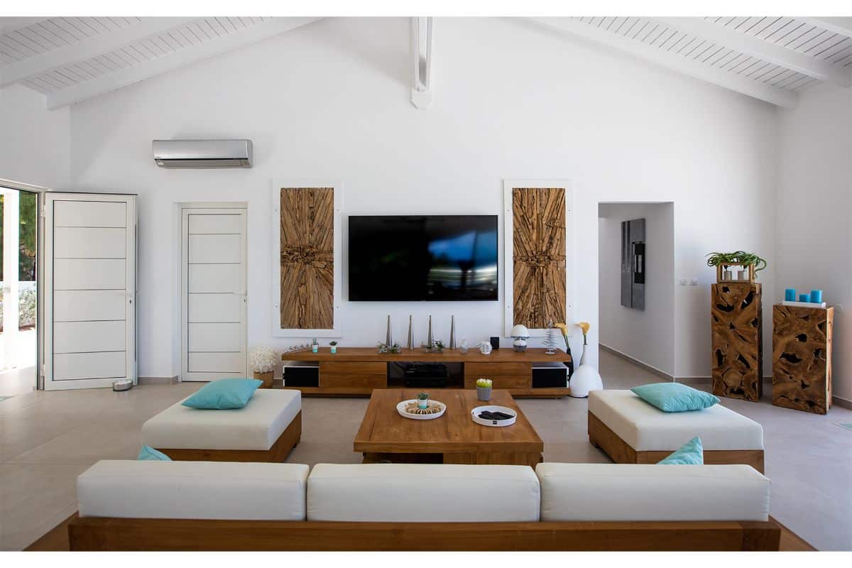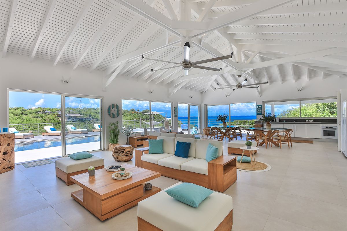 The villa’s open-plan interior is designed to maximize natural light and panoramic views. The main living area features a seamless flow between the kitchen, dining, and lounge spaces, all set against a stunning backdrop of the Caribbean Sea. The décor combines soothing neutral tones with soft blue accents, creating a calm and refreshing coastal atmosphere.