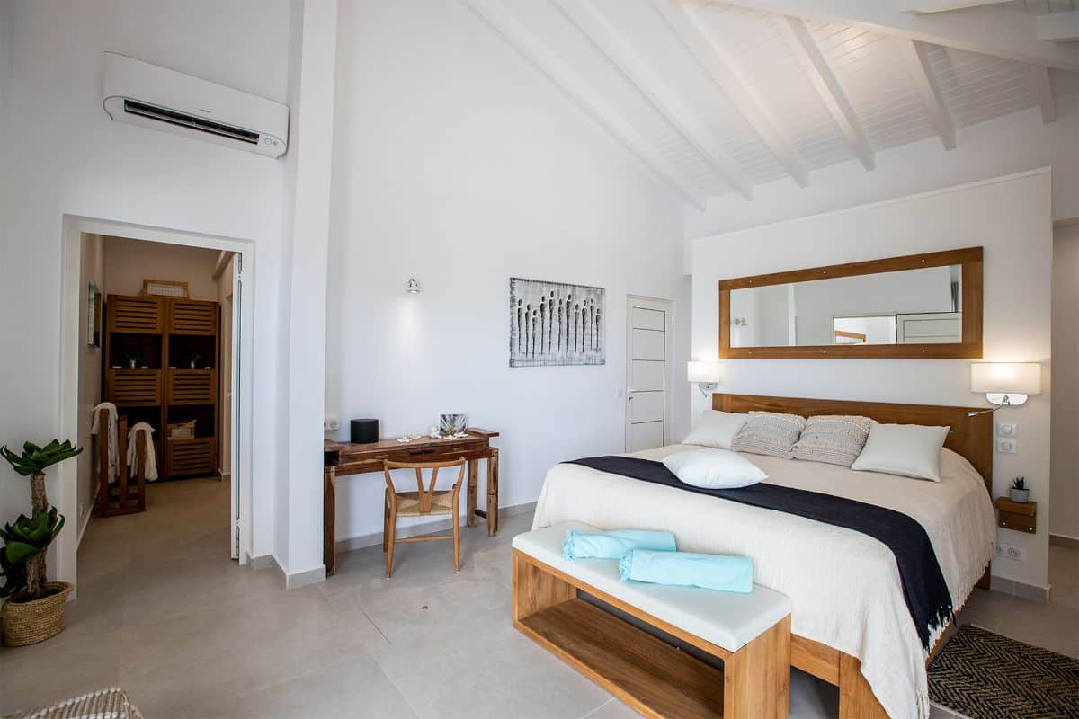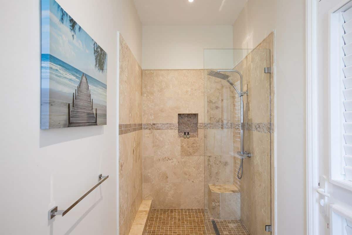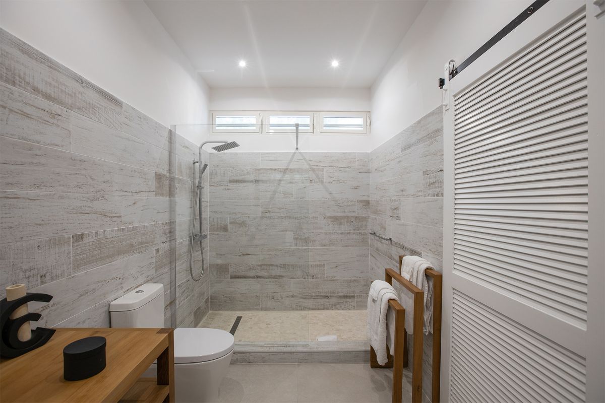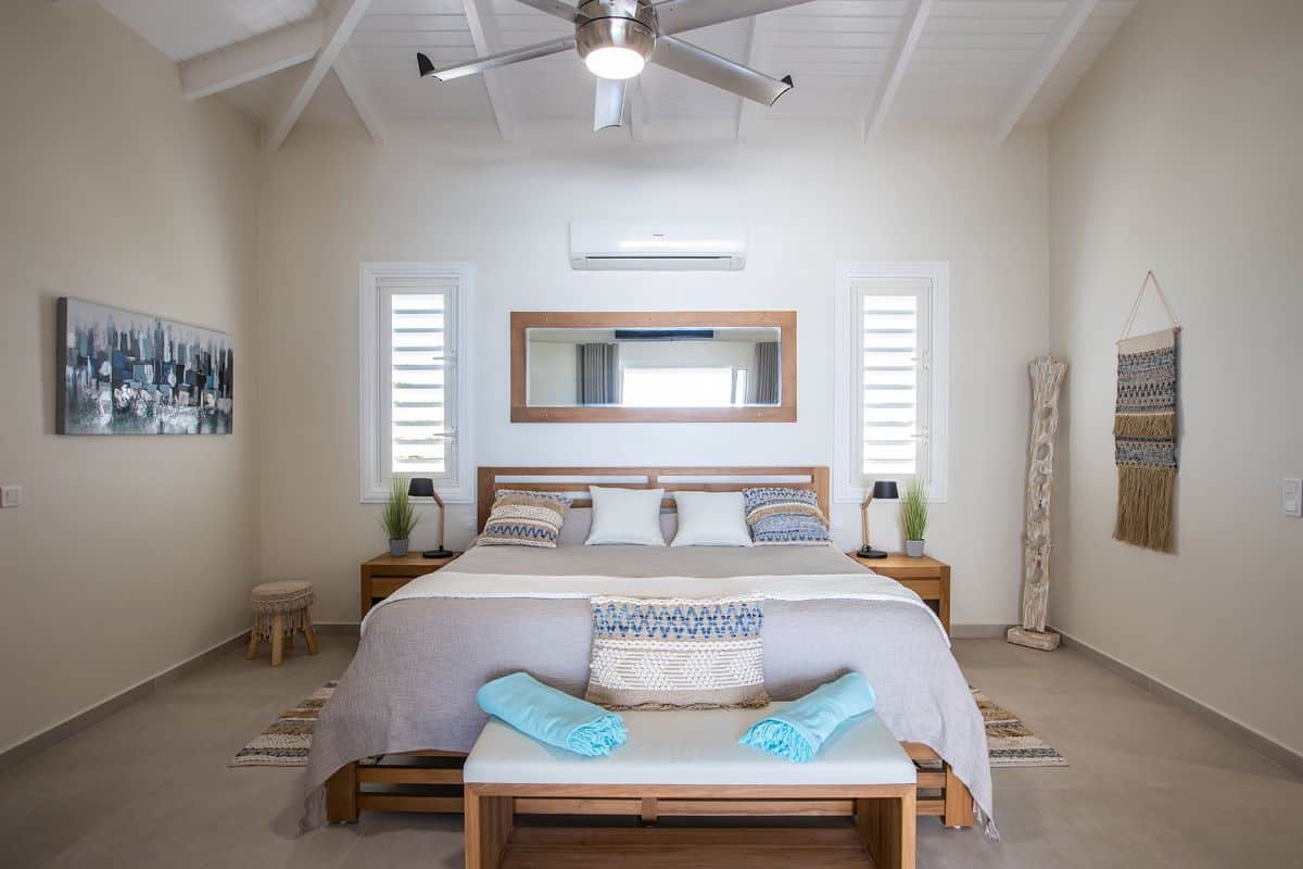The primary suite offers a peaceful private seating area just off the terrace, creating a perfect spot to enjoy the morning breeze or watch the sunset over the ocean. Three of the bedrooms have direct exterior access, offering guests a sense of seclusion while remaining close to the main living areas. The remaining bedrooms are connected internally to the villa’s central living space, making them ideal for families or groups traveling together. Each bedroom is thoughtfully appointed with modern amenities and tasteful décor, ensuring every guest enjoys restful comfort.