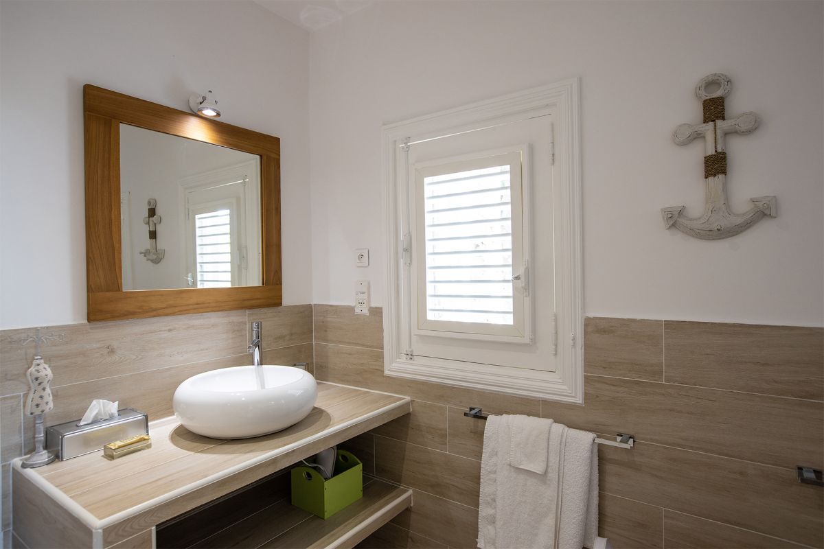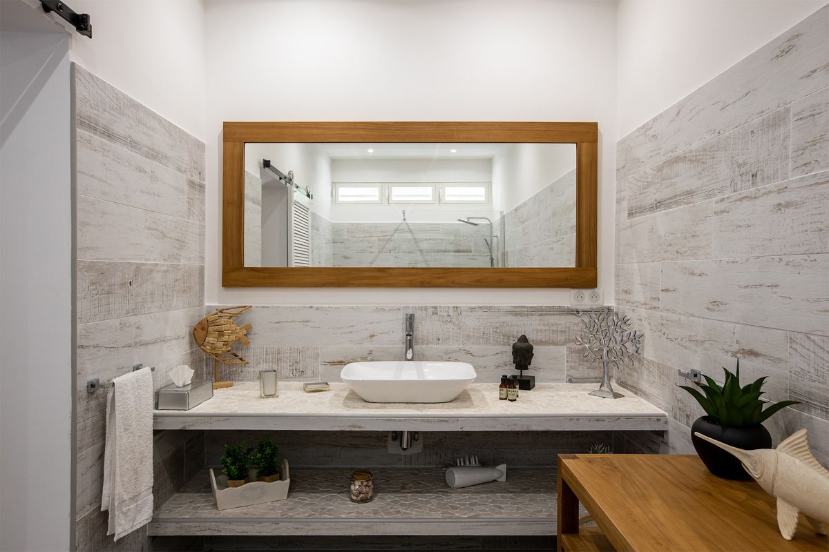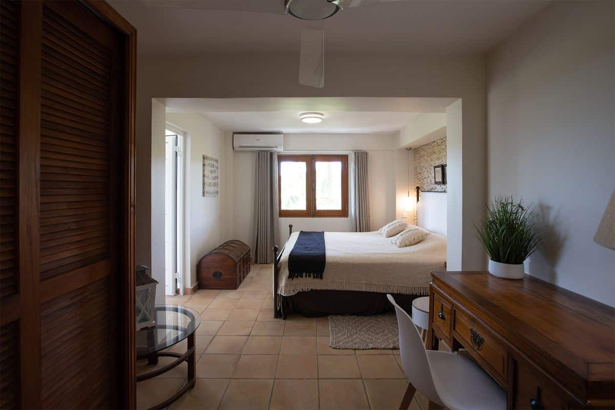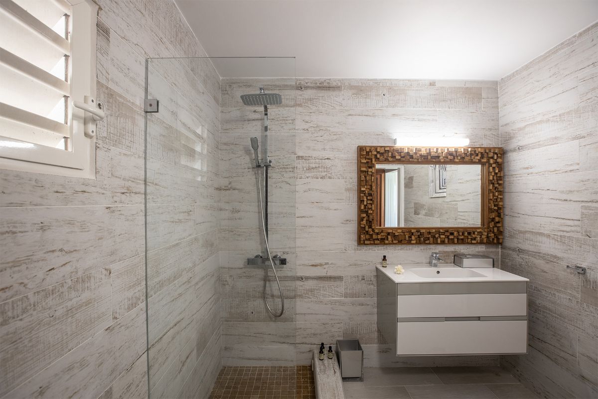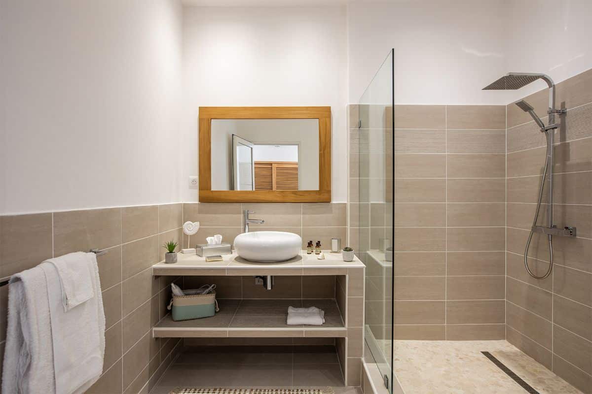 The primary suite offers a peaceful private seating area just off the terrace, creating a perfect spot to enjoy the morning breeze or watch the sunset over the ocean. Three of the bedrooms have direct exterior access, offering guests a sense of seclusion while remaining close to the main living areas. The remaining bedrooms are connected internally to the villa’s central living space, making them ideal for families or groups traveling together. Each bedroom is thoughtfully appointed with modern amenities and tasteful décor, ensuring every guest enjoys restful comfort.
