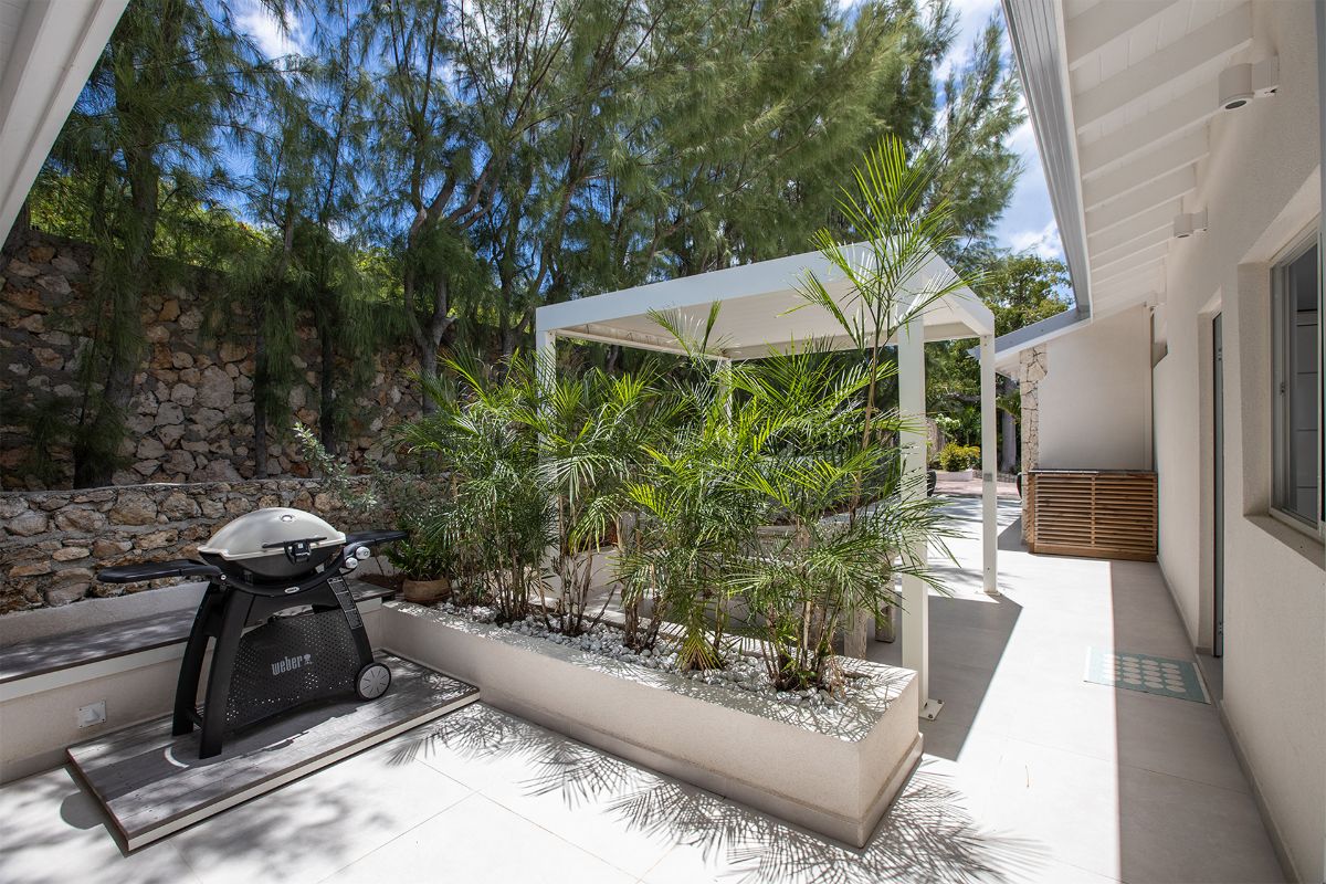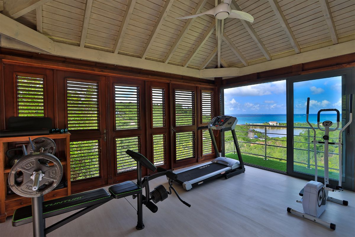 For outdoor dining and entertaining, the villa includes a fully equipped outdoor kitchen and barbecue area. A hammock gently sways beside the pool, inviting guests to unwind under the Caribbean sun or stars. Fitness enthusiasts will appreciate the private gym, offering the opportunity to stay active while surrounded by breathtaking scenery. Shaded and open-air seating areas throughout the property provide plenty of spots to relax, socialize, or simply soak in the tranquil ambiance.