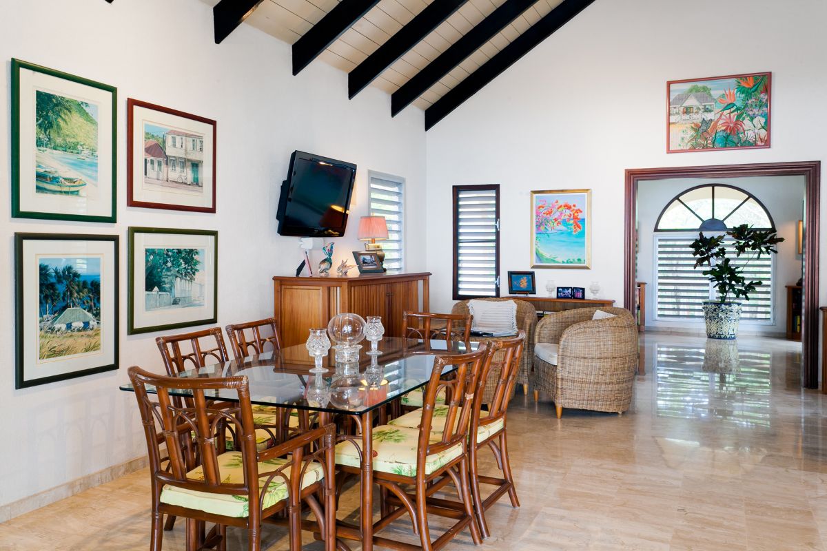 The villa’s outdoor spaces are where the Caribbean truly comes to life. A large swimming pool sits gracefully between the house and the beach, offering a private oasis for cooling off or soaking up the sun. The surrounding terrace and covered gallery provide multiple seating and dining areas, ideal for al fresco meals, lounging with a good book, or simply enjoying the tranquil rhythm of the waves. From sunrise to sunset, the views are captivating, with the ocean stretching endlessly before you.