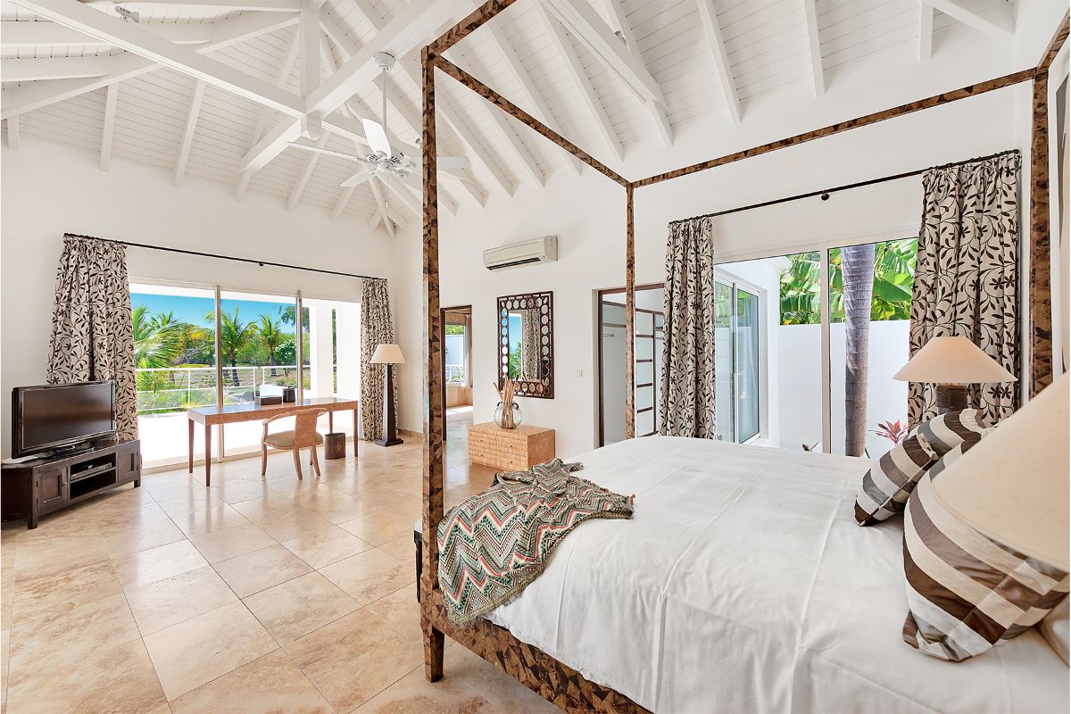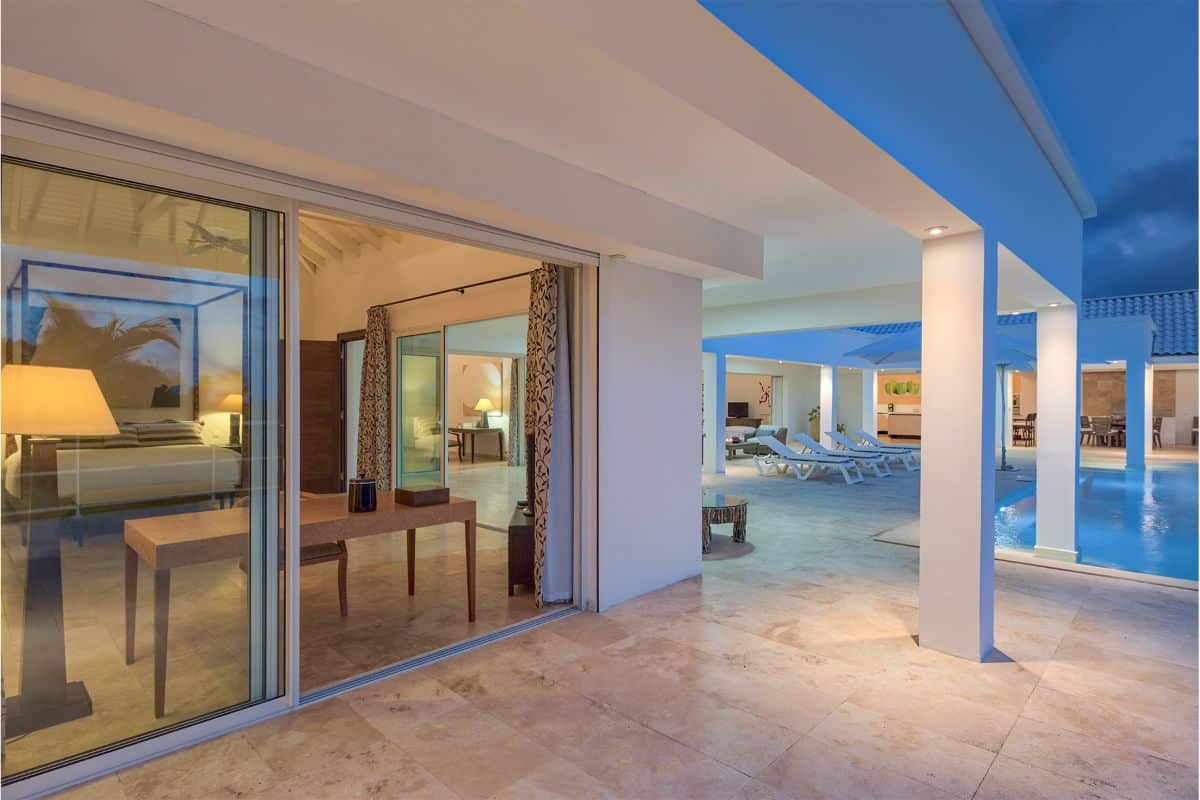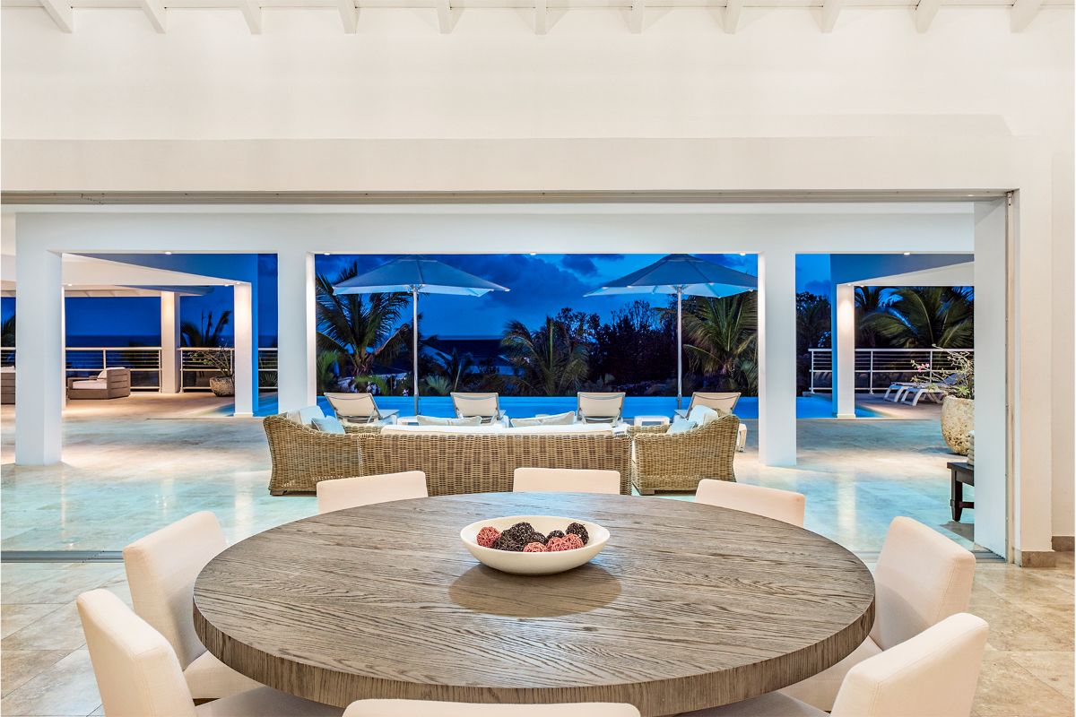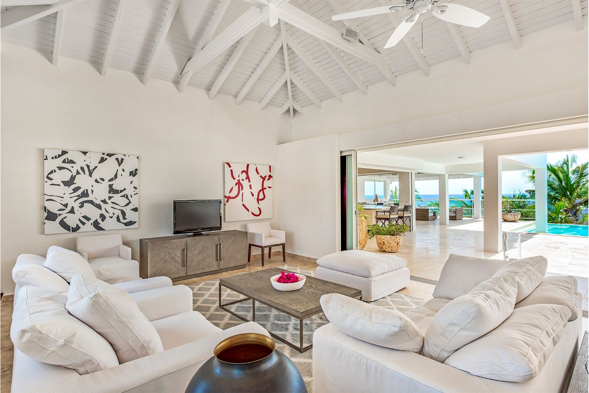 The villa’s interior design embodies modern Caribbean elegance with an effortless, open flow. The spacious living room is bright and inviting, with floor-to-ceiling glass doors that slide completely into the wall, blending the indoor and outdoor spaces. The soft sand-toned travertine floors extend across both areas, creating a seamless transition to the terrace. Contemporary designer furnishings, warm dark wood accents, and textured art pieces infuse the space with sophistication and comfort. The neutral palette of cream, off-white, and taupe enhances the calm atmosphere, while natural light and sea breezes complete the sense of serenity.