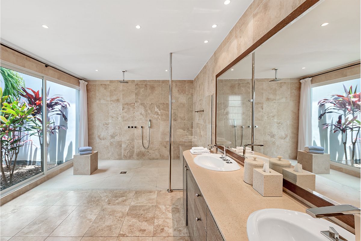 Both of the villa’s spacious and equally sized bedrooms are tranquil sanctuaries, designed for complete relaxation. Each room features cream-colored bedding, polished travertine floors, and custom wood detailing that evoke understated luxury. The décor is simple yet refined, creating a peaceful environment that encourages rest and rejuvenation. The en-suite bathrooms are true spa-style retreats, beautifully designed with natural woods, travertine stone, and stainless-steel fixtures. Each bathroom features a large walk-in shower, blending indulgence with modern functionality.