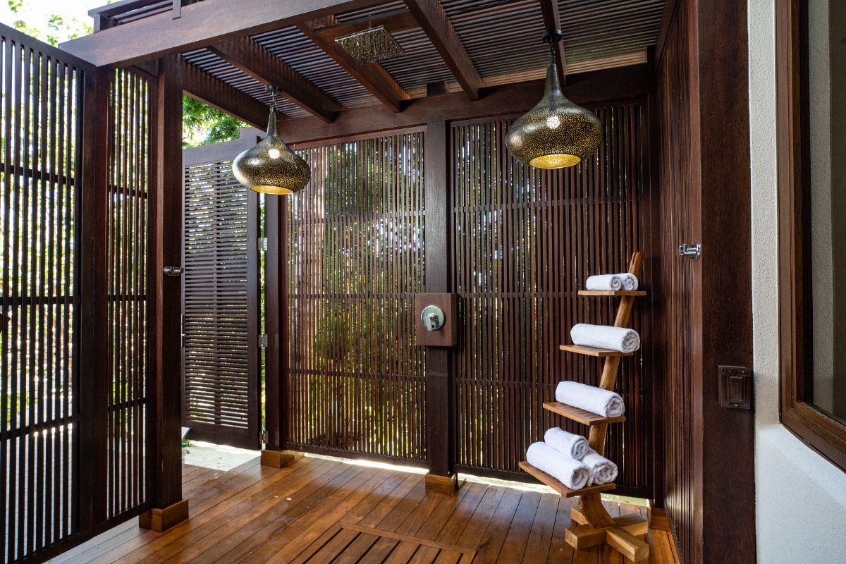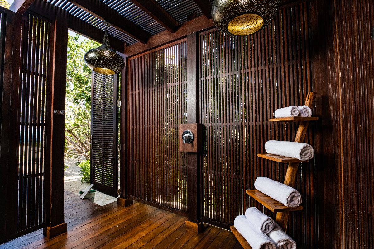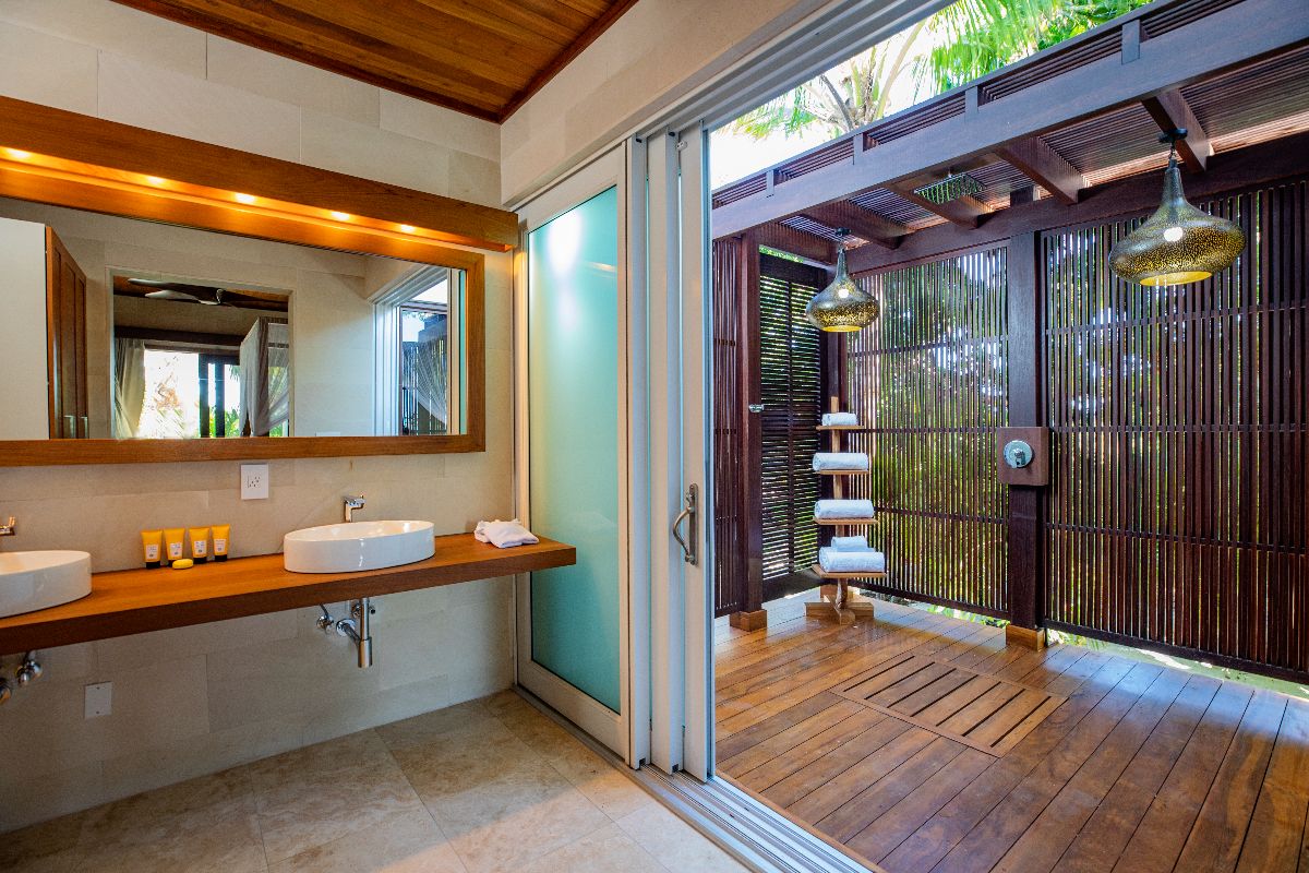 A defining feature of the villa is the ability to step straight from the bedroom onto the beach, creating a seamless start to each day. Outdoor bathrooms with louvred screens provide privacy while allowing guests to shower immersed in the natural surroundings — a distinctive and memorable element of the stay.