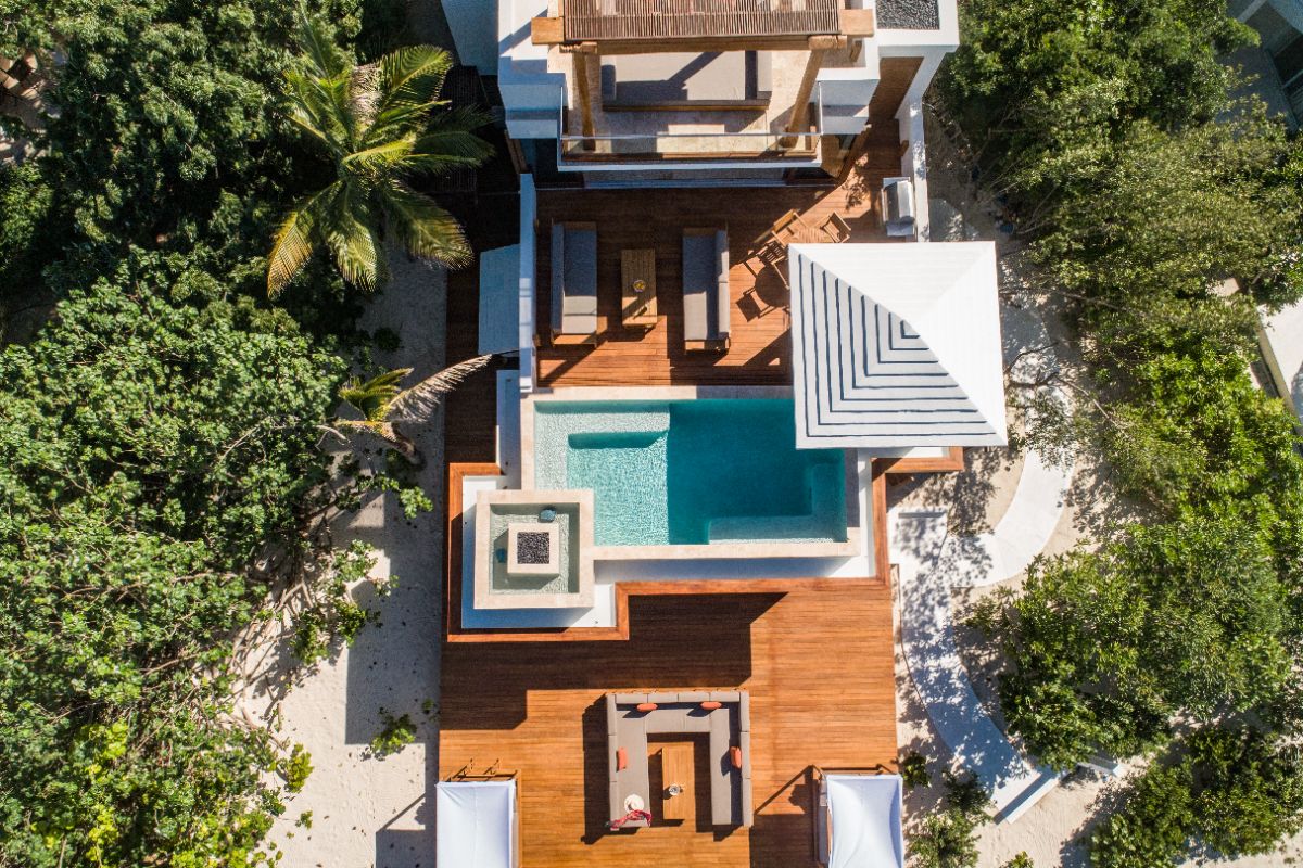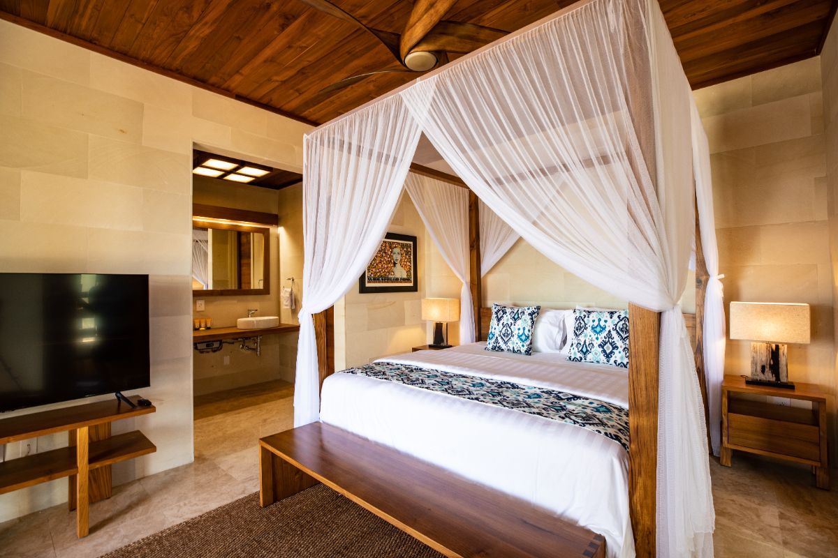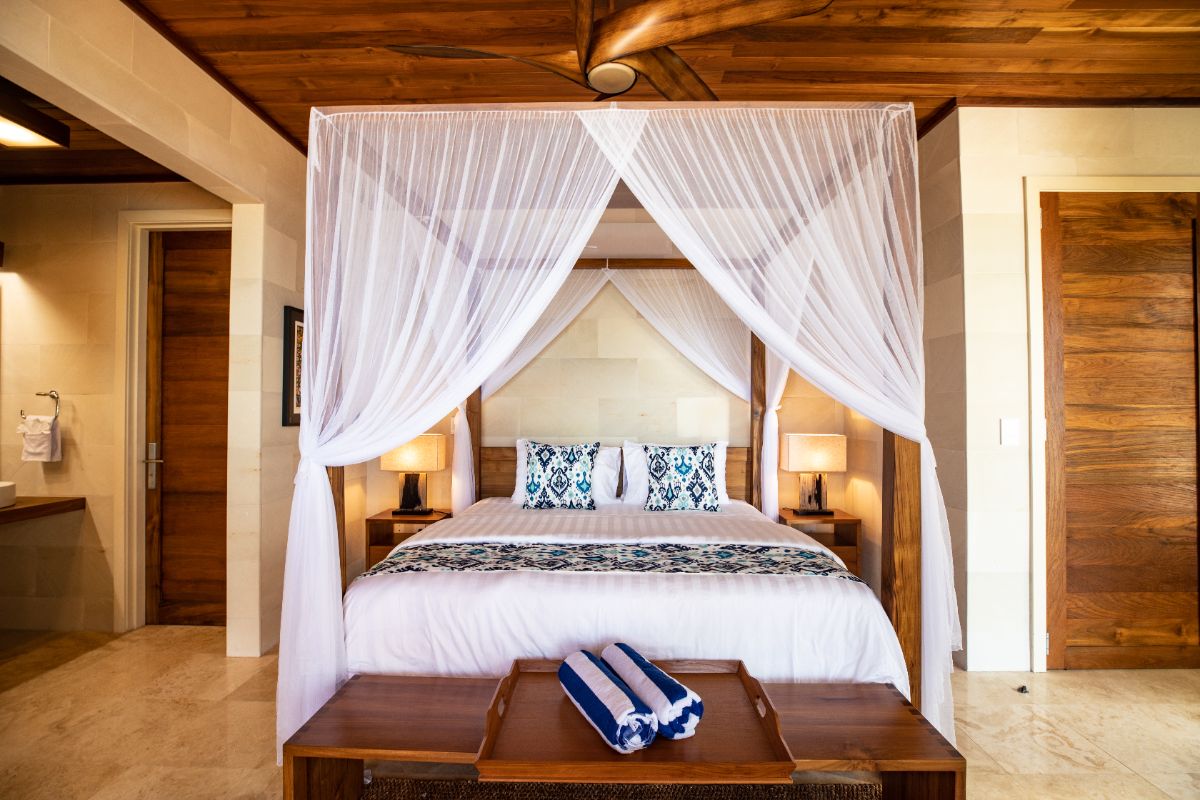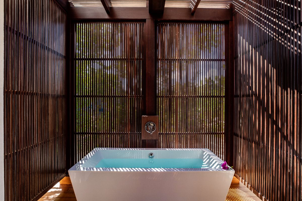 A defining feature of the villa is the ability to step straight from the bedroom onto the beach, creating a seamless start to each day. Outdoor bathrooms with louvred screens provide privacy while allowing guests to shower immersed in the natural surroundings — a distinctive and memorable element of the stay.
