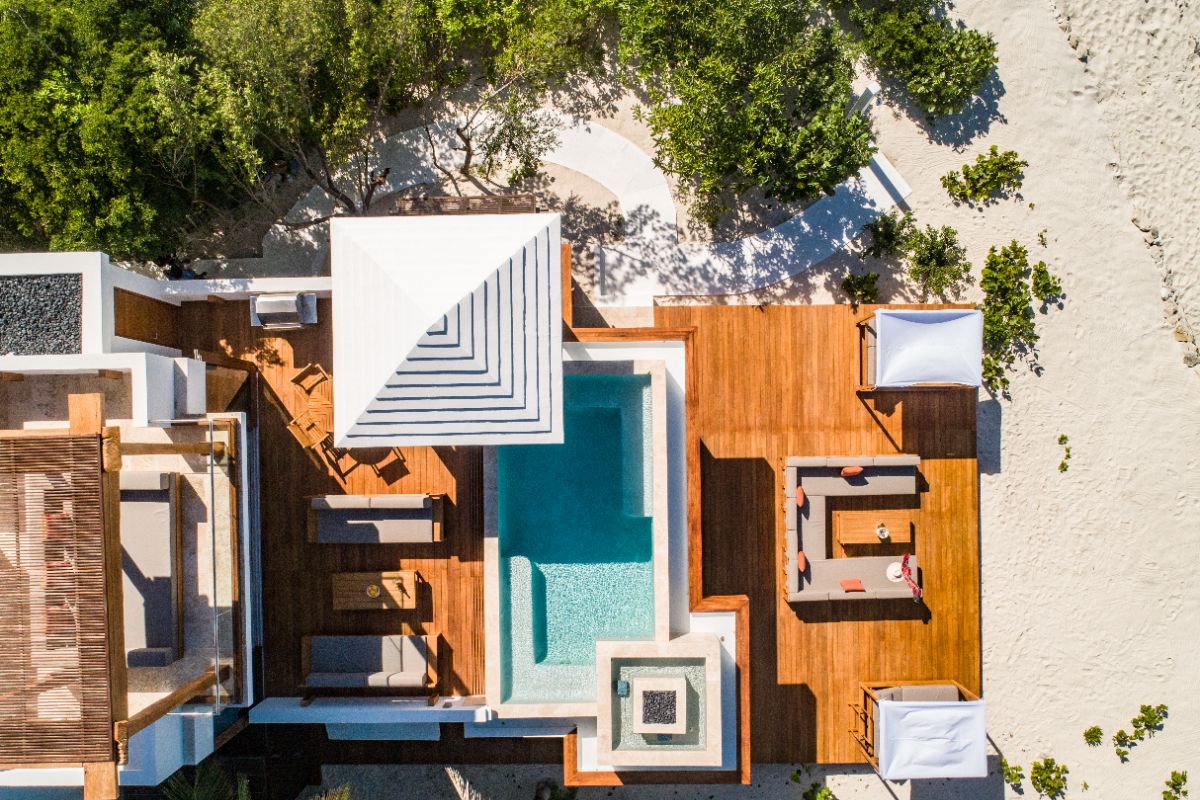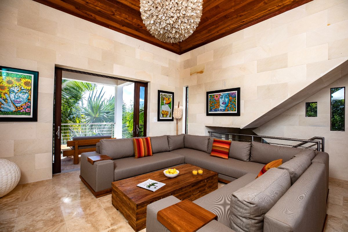Designed to blur the boundaries between indoors and outdoors, the villa embraces openness and ease. Here, inside flows into outside, gardens are soft white sand, and everyday moments — from morning coffee to sunset cocktails — unfold just steps from the water. Quirky architectural details and creative touches give the home its personality, while its elevated position and clever layout ensure both privacy and uninterrupted enjoyment of the beachfront setting.