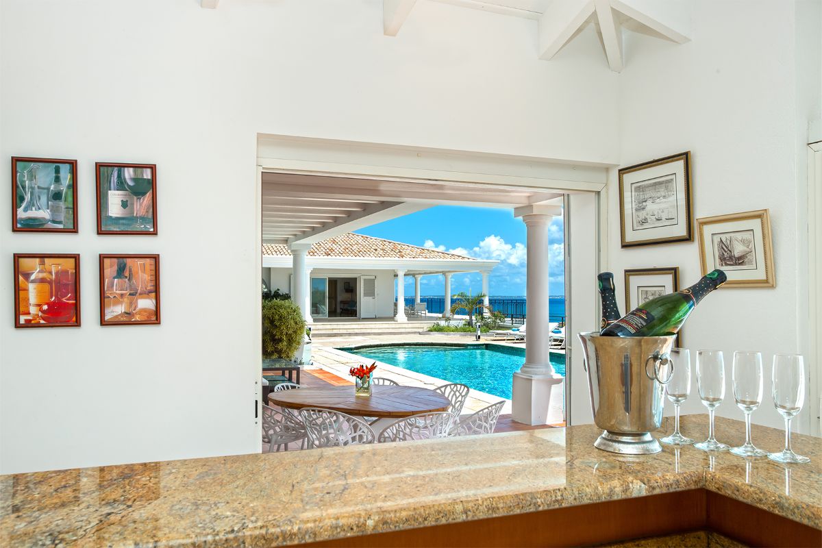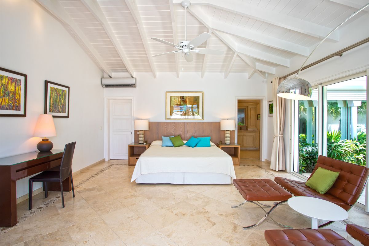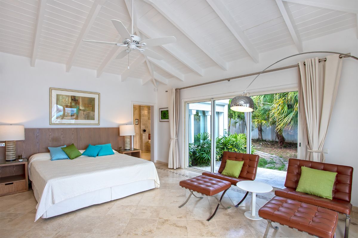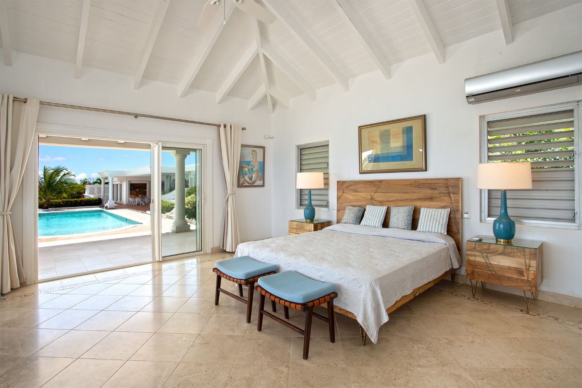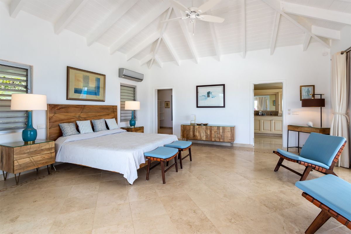 Inside, the villa captures the essence of indoor-outdoor Caribbean living. A spacious double living room opens to a formal dining area framed by graceful arches, while large doors and windows bring in sea breezes and sunlight throughout the day. The fully equipped kitchen, featuring granite countertops and a wide pass-through window, connects to the terrace and outdoor dining areas, making entertaining easy and enjoyable. The decor is minimalist yet comfortable, emphasising the villa’s connection to its surroundings and allowing the view to take centre stage.