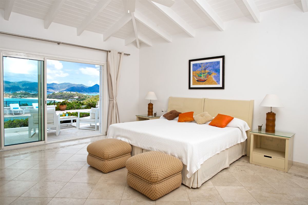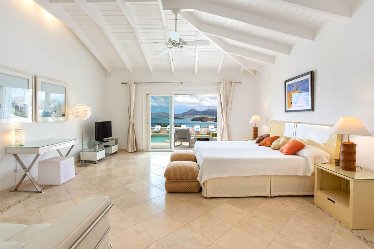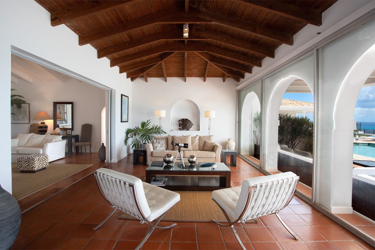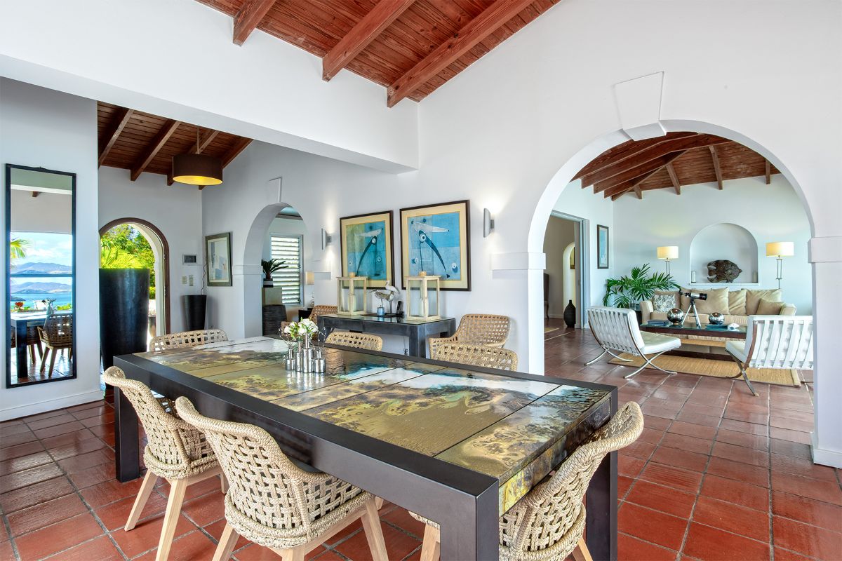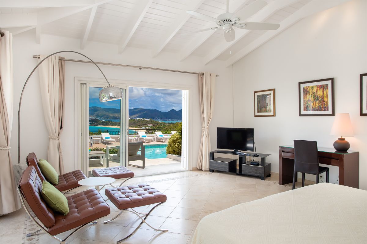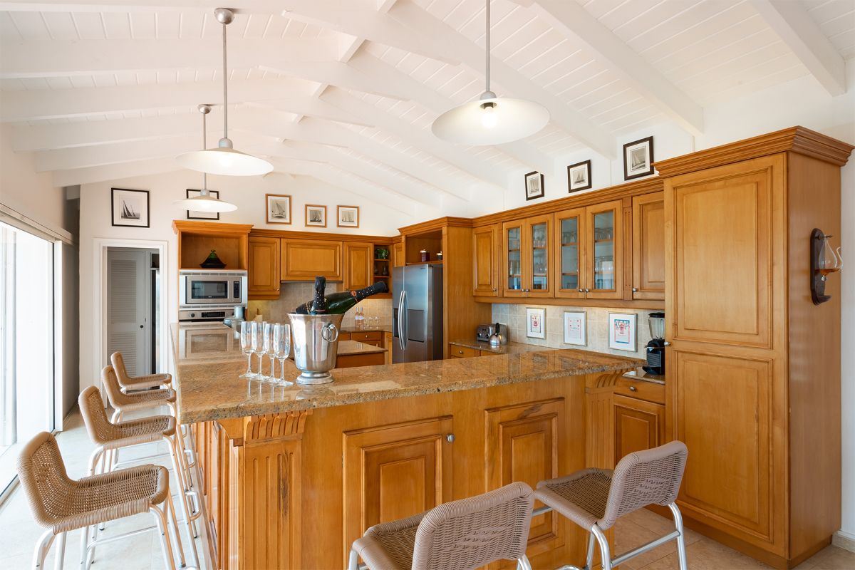 Inside, the villa captures the essence of indoor-outdoor Caribbean living. A spacious double living room opens to a formal dining area framed by graceful arches, while large doors and windows bring in sea breezes and sunlight throughout the day. The fully equipped kitchen, featuring granite countertops and a wide pass-through window, connects to the terrace and outdoor dining areas, making entertaining easy and enjoyable. The decor is minimalist yet comfortable, emphasising the villa’s connection to its surroundings and allowing the view to take centre stage.