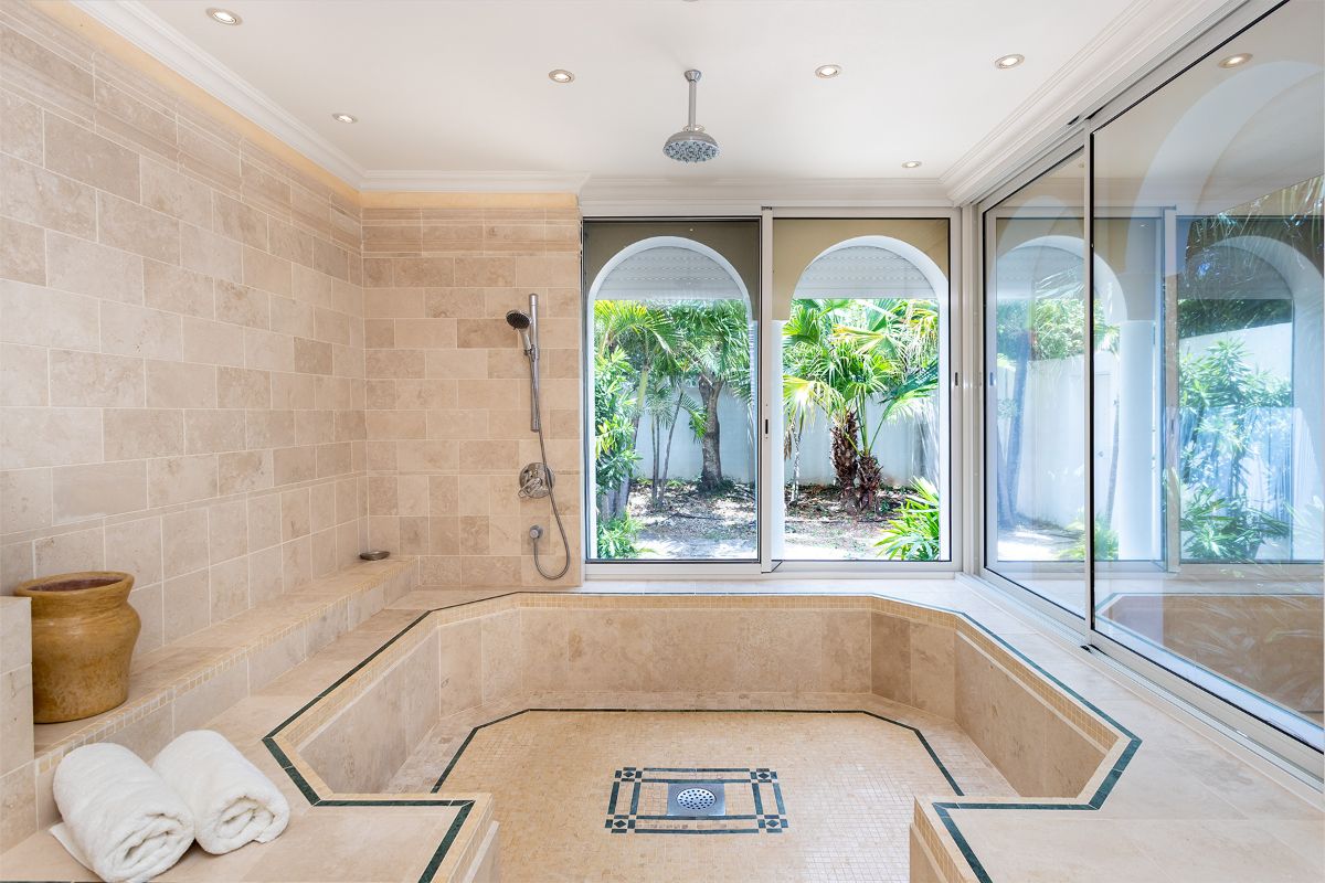 Villa Beaulieu offers three large primary suites, each designed for ultimate comfort and privacy. Finished in soft tones and Italian tumbled marble, the bedrooms open to their own private terraces with either a garden or ocean view. Each suite features an elegant en-suite bathroom with panoramic sea views, creating a sense of calm and connection to the outdoors. With plush bedding, natural textures, and thoughtful details, the bedrooms offer the perfect retreat after a day in the sun.