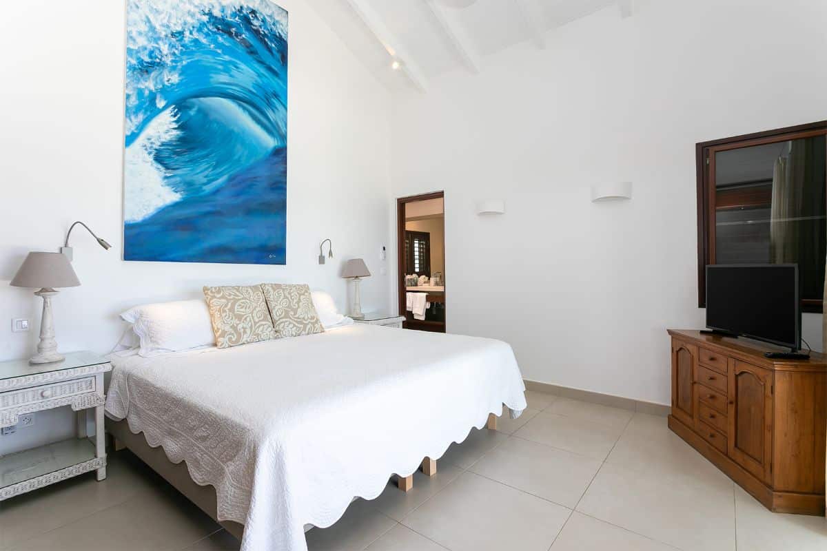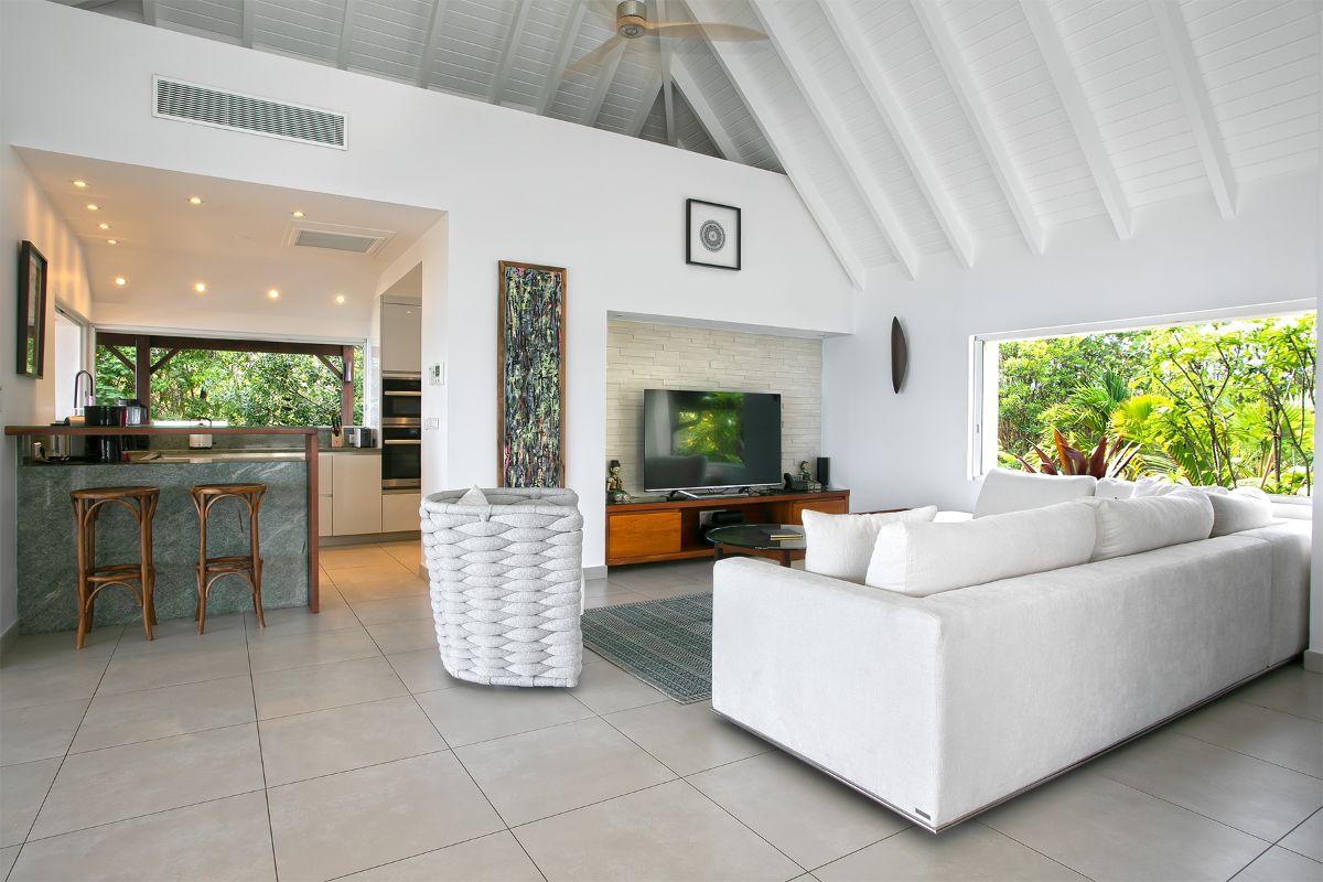 Inside, Blue Beach combines Caribbean warmth with understated sophistication. The open-air great room serves as the heart of the villa, designed to capture the sea breezes and the breathtaking views that stretch across Baie Longue. Furnished with rattan and teak pieces accented by tropical fabrics, this space invites guests to relax in total comfort. The fully equipped galley-style kitchen opens seamlessly to the great room and out to the terraces, making it easy to enjoy meals with a view.