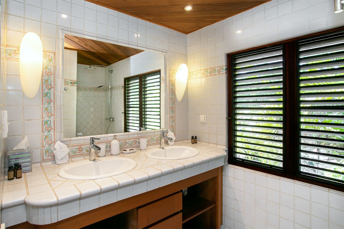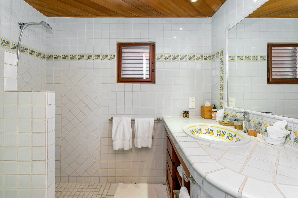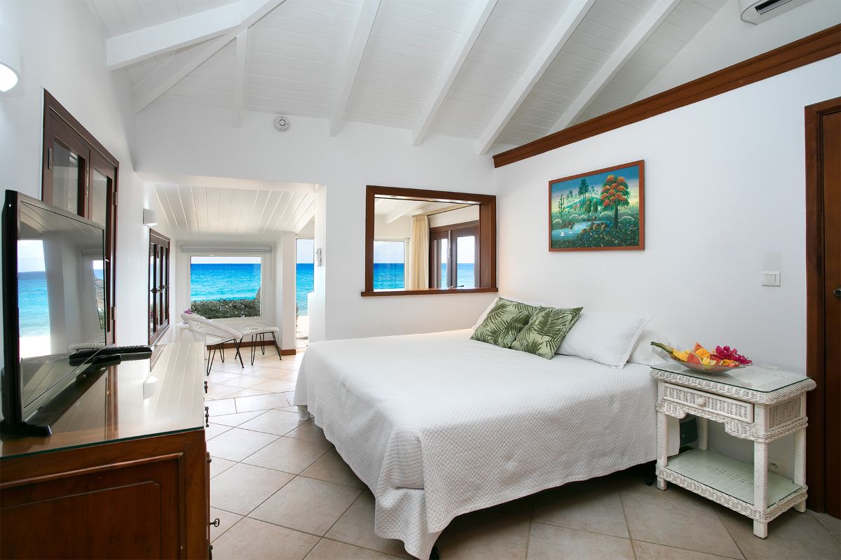At the opposite end of the terrace sits a charming two-bedroom cottage, complete with a private patio and stunning sea views. One of the bedrooms includes a small kitchenette for added convenience. The decor throughout the bedrooms is serene and romantic—white linens, custom mahogany Creole windows, and tiled en-suite bathrooms create a refined yet soothing atmosphere.