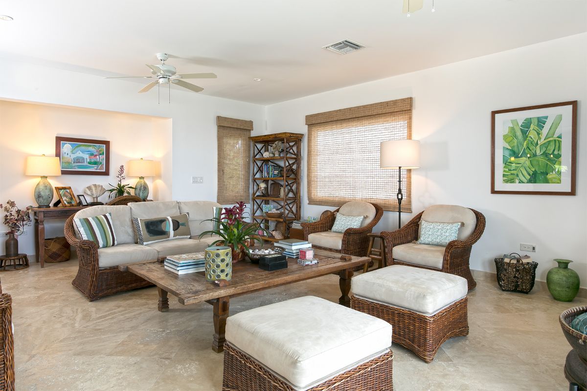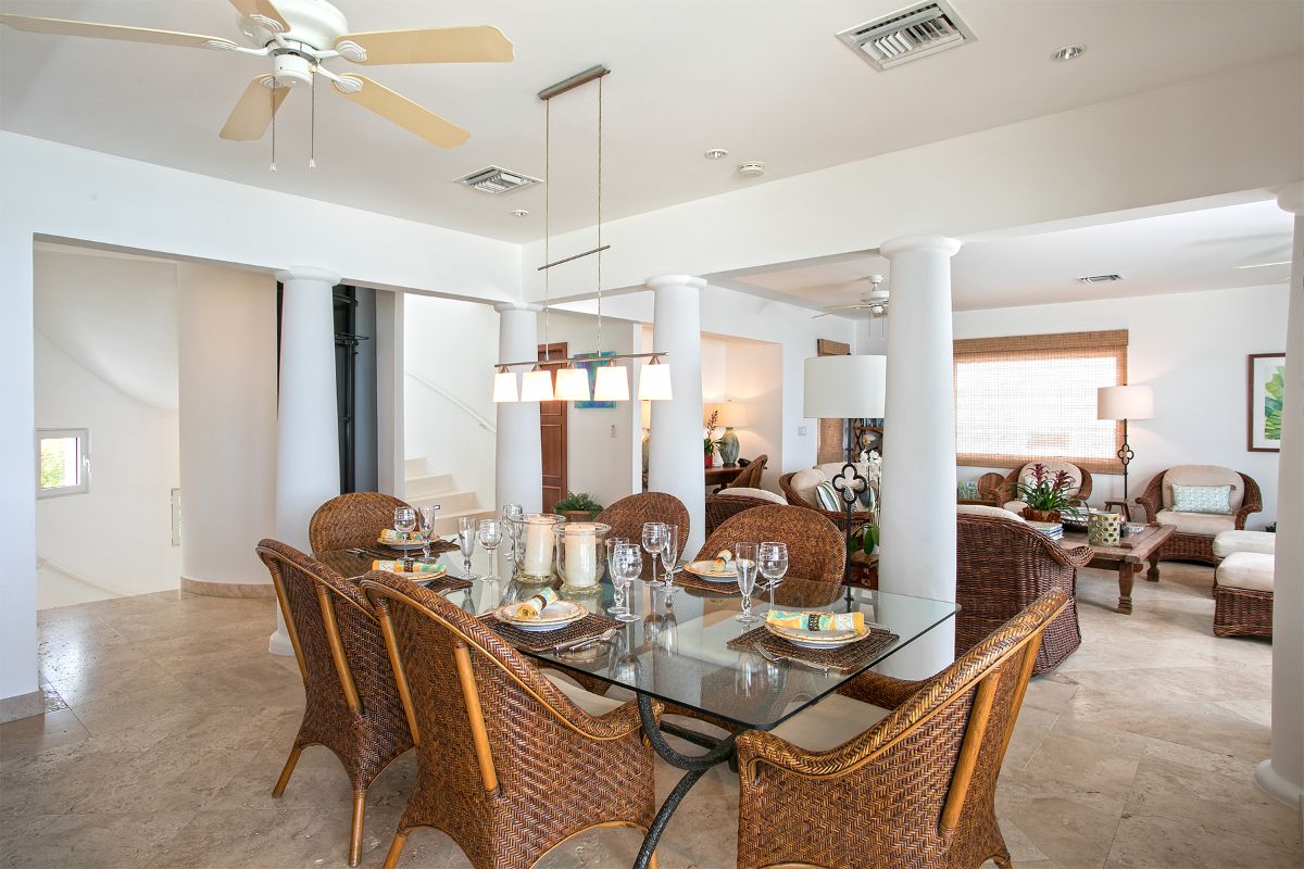 Inside, Blue Dove’s interiors are spacious, contemporary, and thoughtfully designed to reflect the relaxed elegance of the Caribbean. The fully air-conditioned condominium spans four floors, each connected by a central elevator and a graceful curved staircase. On the second floor, the open-plan living area features comfortable lounge seating, tropical wood and rattan furnishings, and elegant travertine flooring. Large wooden doors open onto a covered terrace, offering beautiful views of the Caribbean Sea and the beach below.