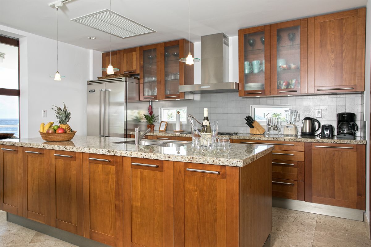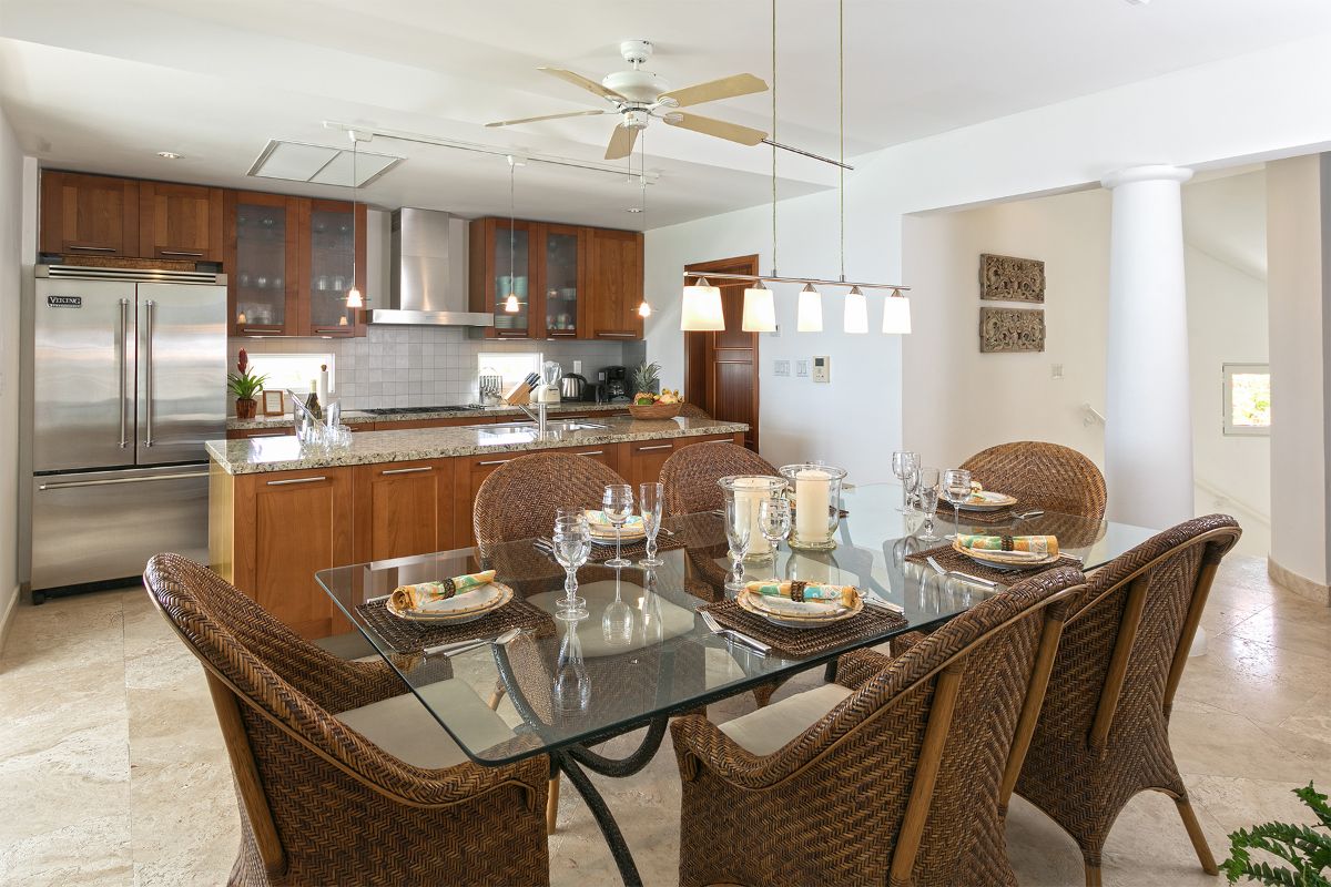 The adjoining dining area comfortably seats eight, making it ideal for casual dinners or festive gatherings. The modern kitchen is well equipped with stainless steel appliances, a central island, and ample counter space, perfect for preparing meals while enjoying the ocean breeze. Throughout the home, light tones and natural textures create a warm and inviting atmosphere that blends contemporary design with tropical comfort.