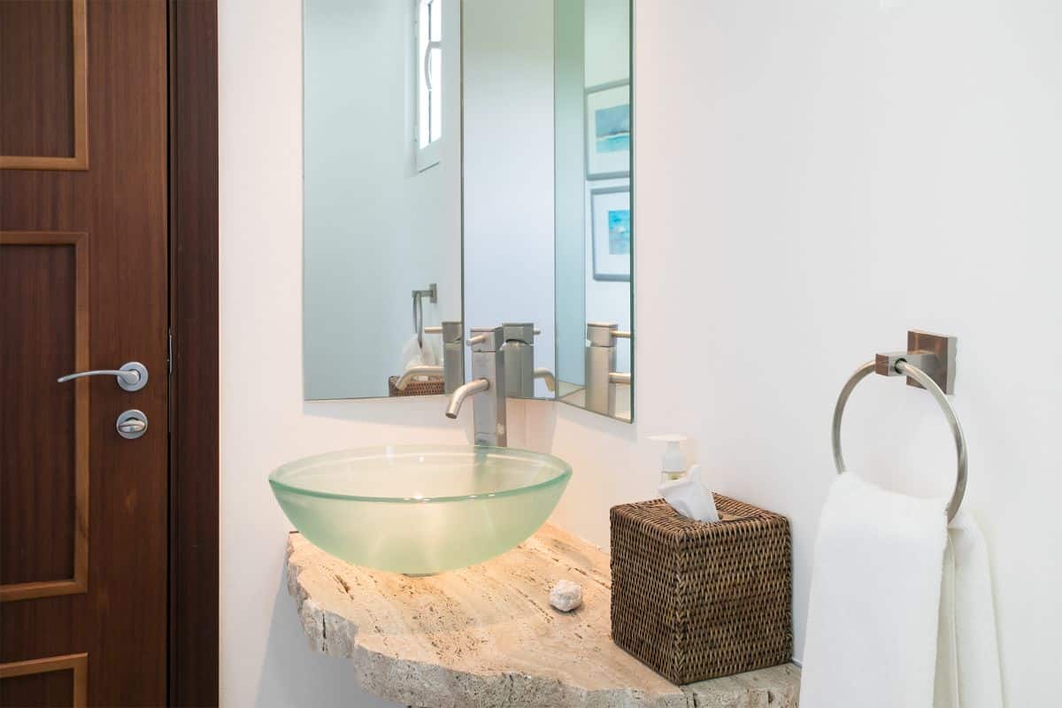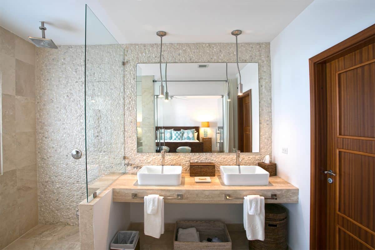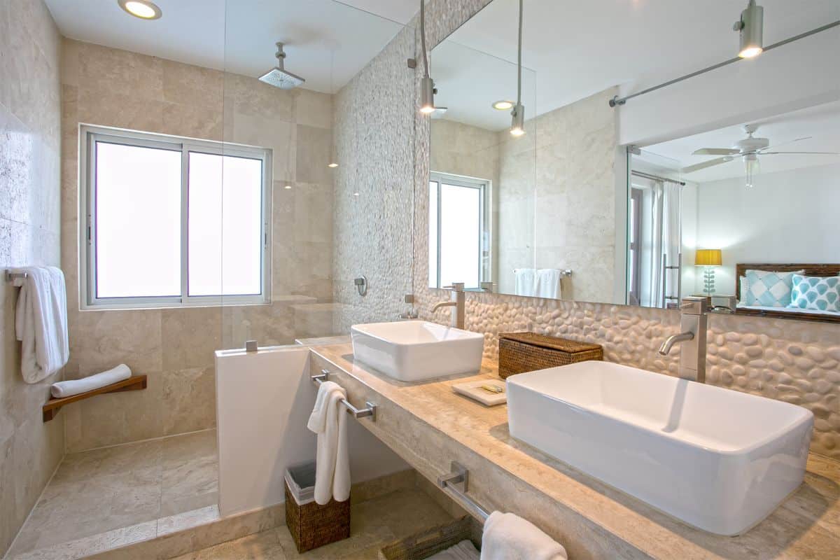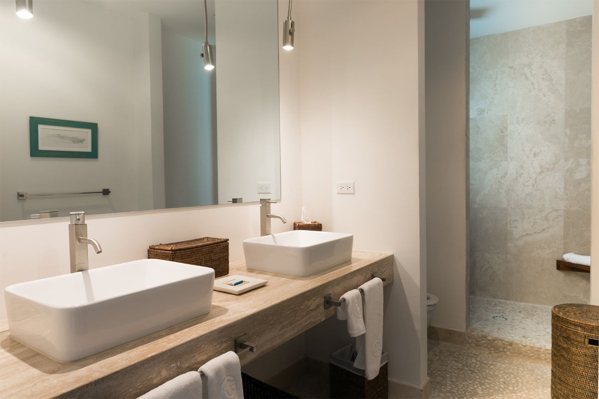 Blue Dove offers three beautifully appointed bedrooms, each featuring a king-size bed, en-suite bathroom, and private balcony with ocean views. Two of the bedrooms are located on the first floor, both featuring elegant pebble flooring, double vanities, and large open showers that create a spa-like ambience. The third, master bedroom occupies the top level, adjacent to the rooftop terrace. This serene suite opens onto its own sea-view balcony and includes a luxurious en-suite bathroom with double vanities and a spacious open shower.