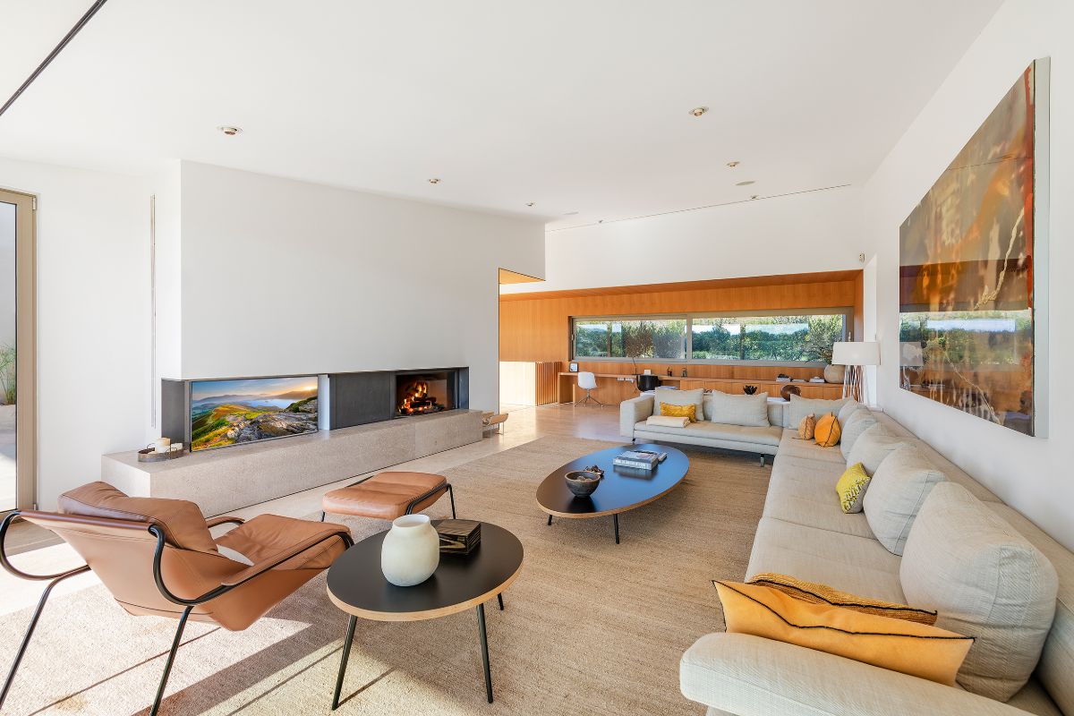 The living room is designed for relaxation, with soft sofa seating, a fireplace for cooler evenings, and views out to the terrace. A dedicated office area with a desk sits at the rear of the living room, providing a quiet space to work if needed. High-speed Wi-Fi is available throughout the villa, making it easy to stay connected.