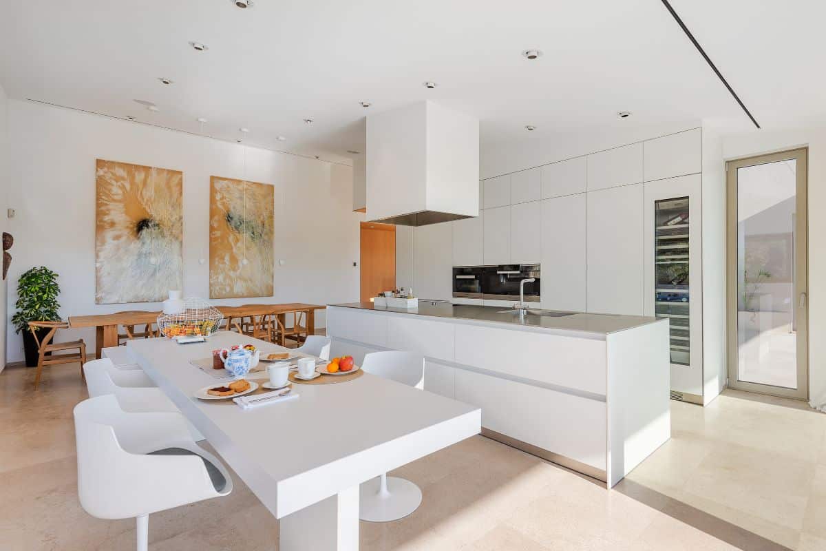 Inside, Can Estel Nou blends comfort and functionality with an open-plan layout that brings together the kitchen, dining, and living areas. The contemporary kitchen is fully equipped with integrated appliances and all the essentials for preparing everything from simple breakfasts to full family meals. A spacious dining area with ample seating sits alongside the kitchen, making it easy to serve meals or gather together at the end of the day.