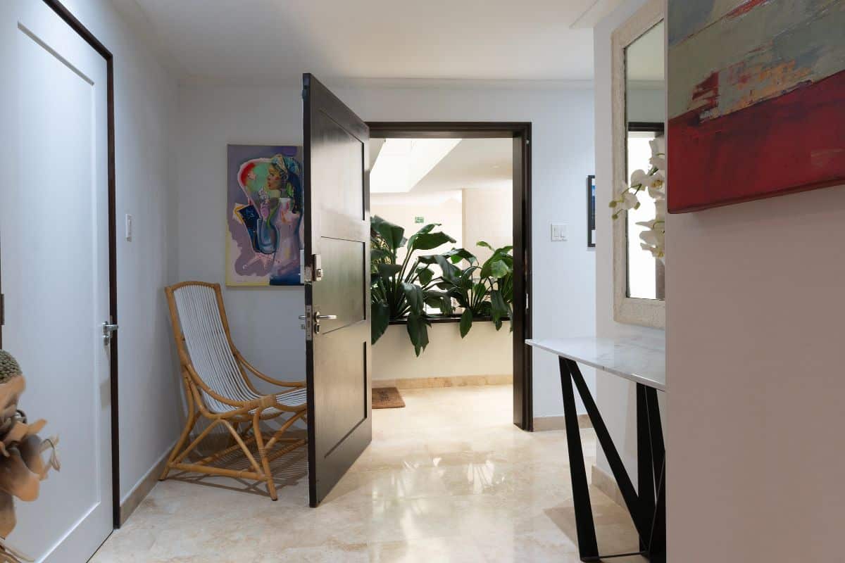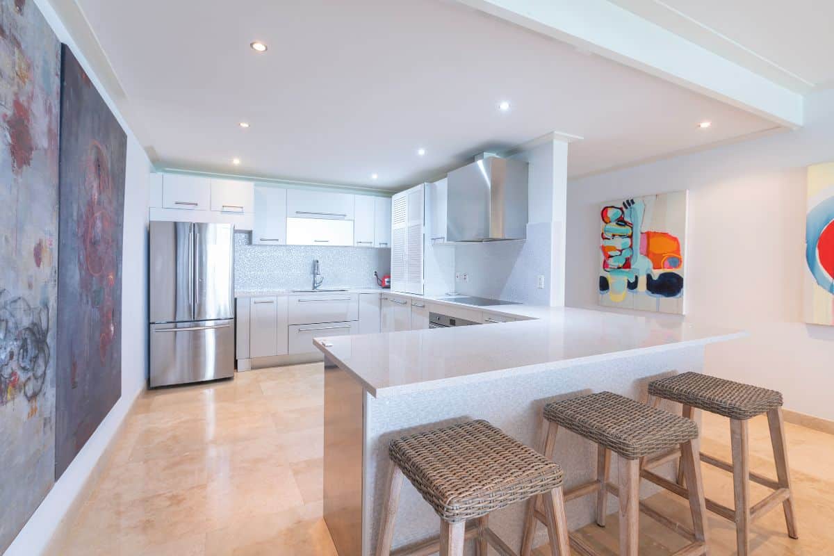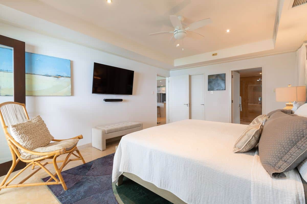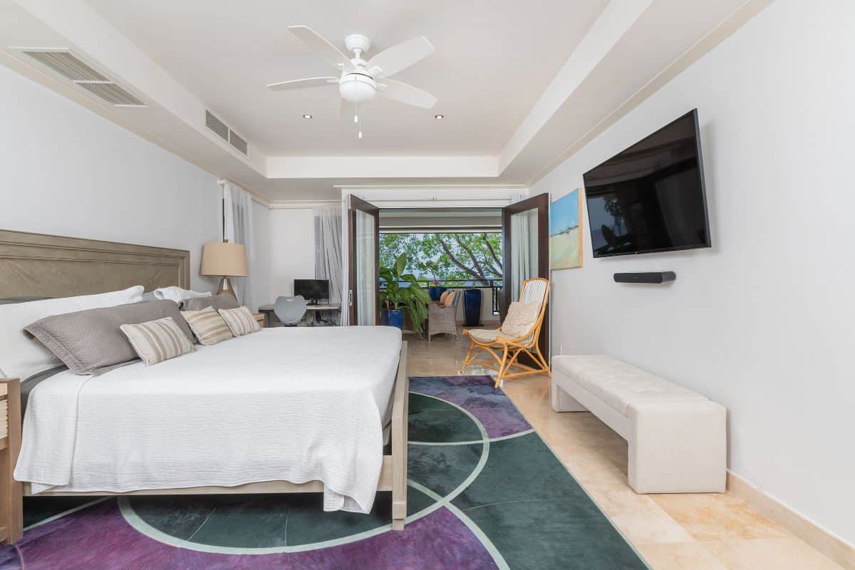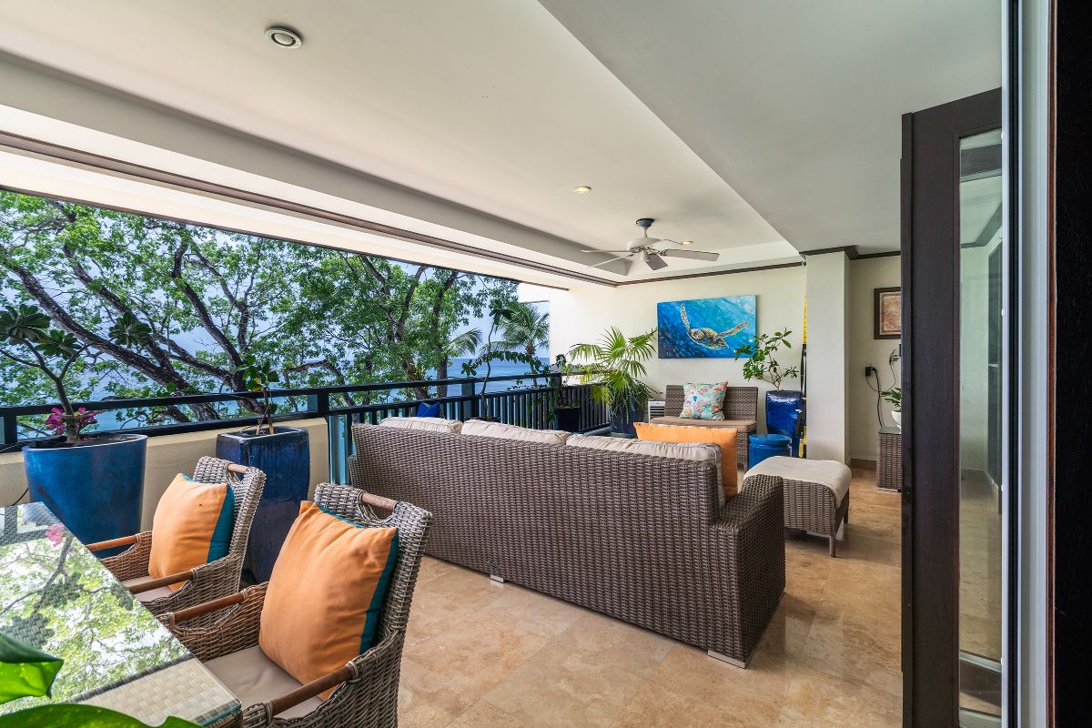 The expansive open-air terrace is one of the condo’s most impressive features. Overlooking the Caribbean Sea, it provides ample space for outdoor dining, sunbathing, and relaxed social seating. Whether enjoying breakfast with ocean views or watching the sunset with a drink in hand, the terrace is designed to be used throughout the day.