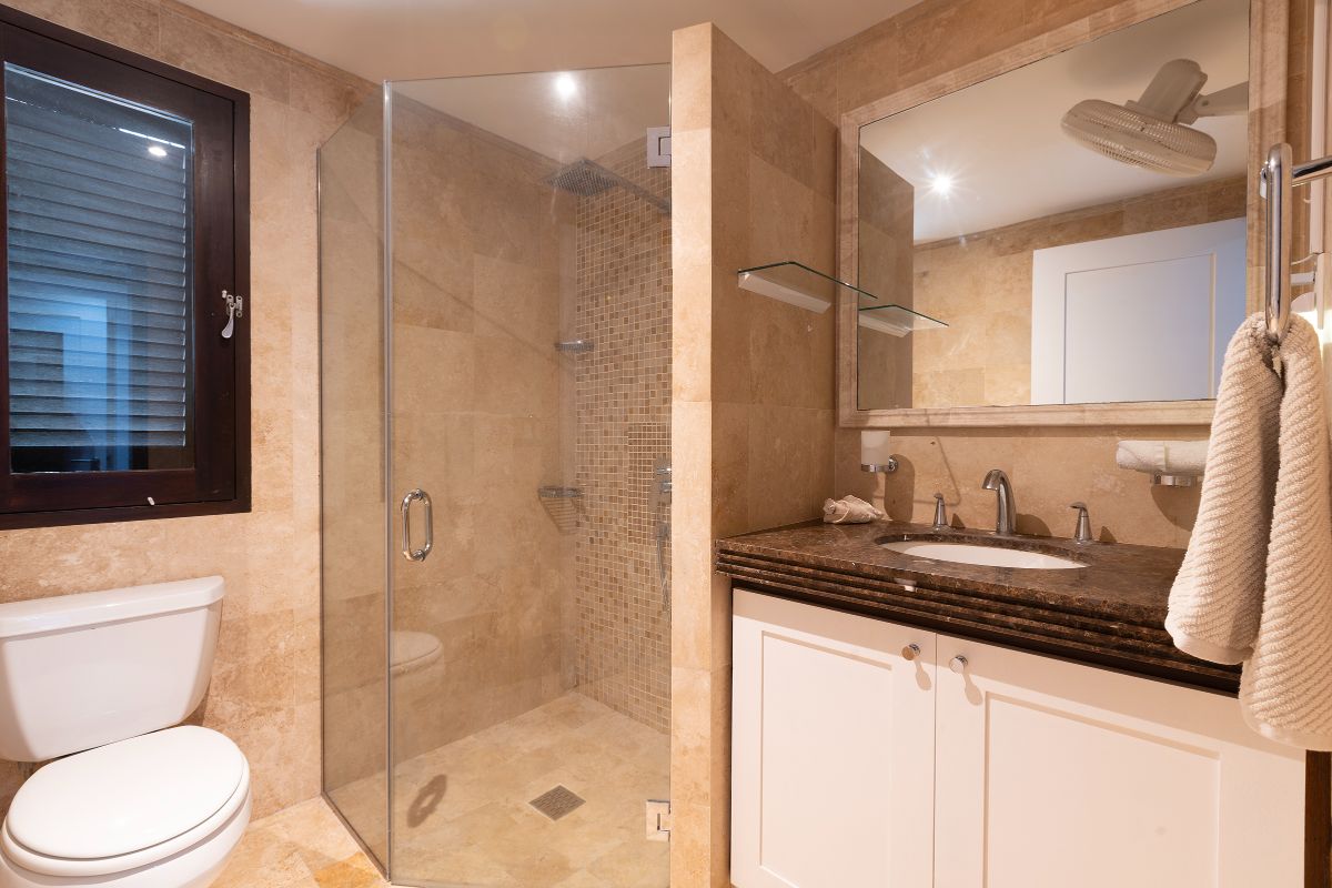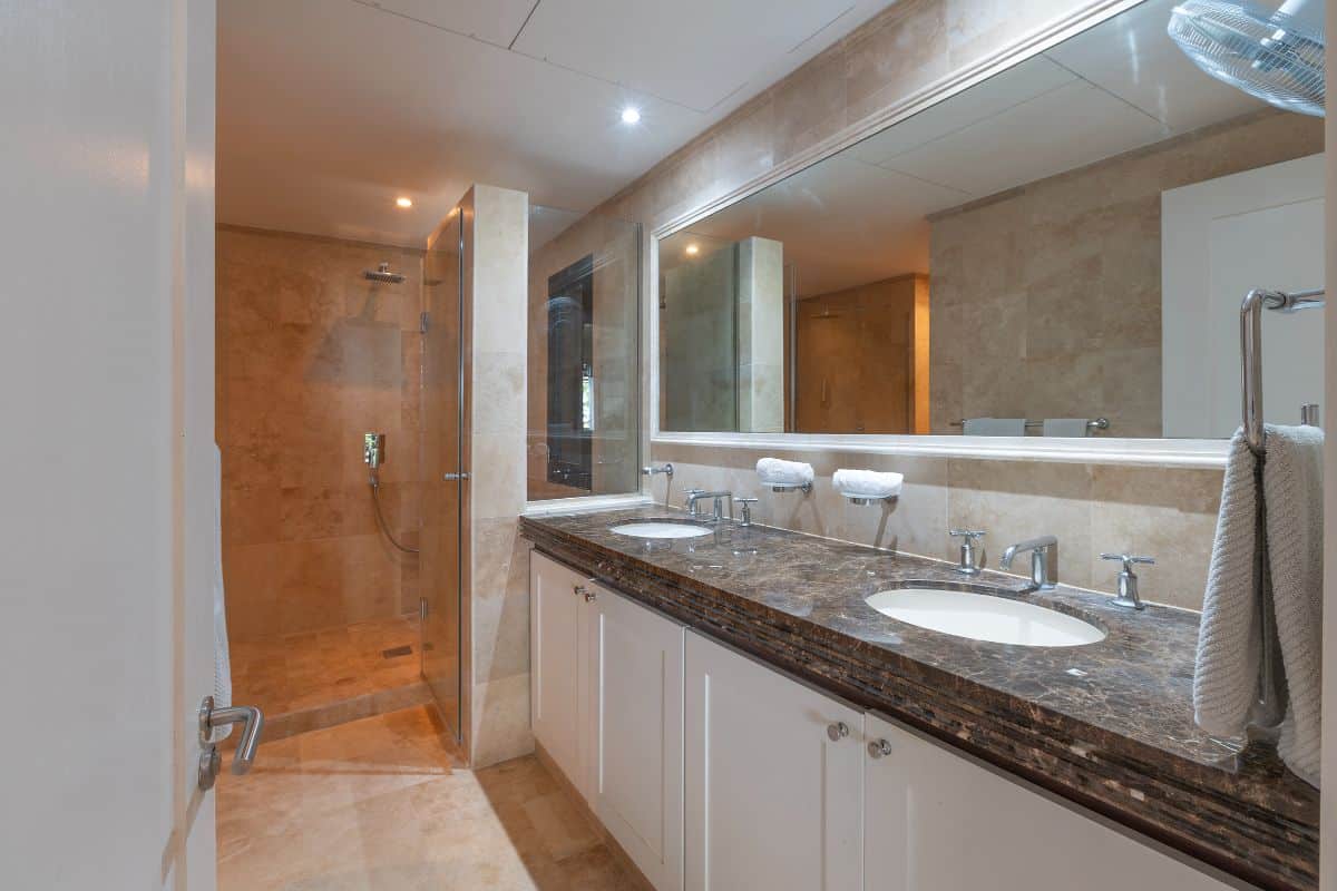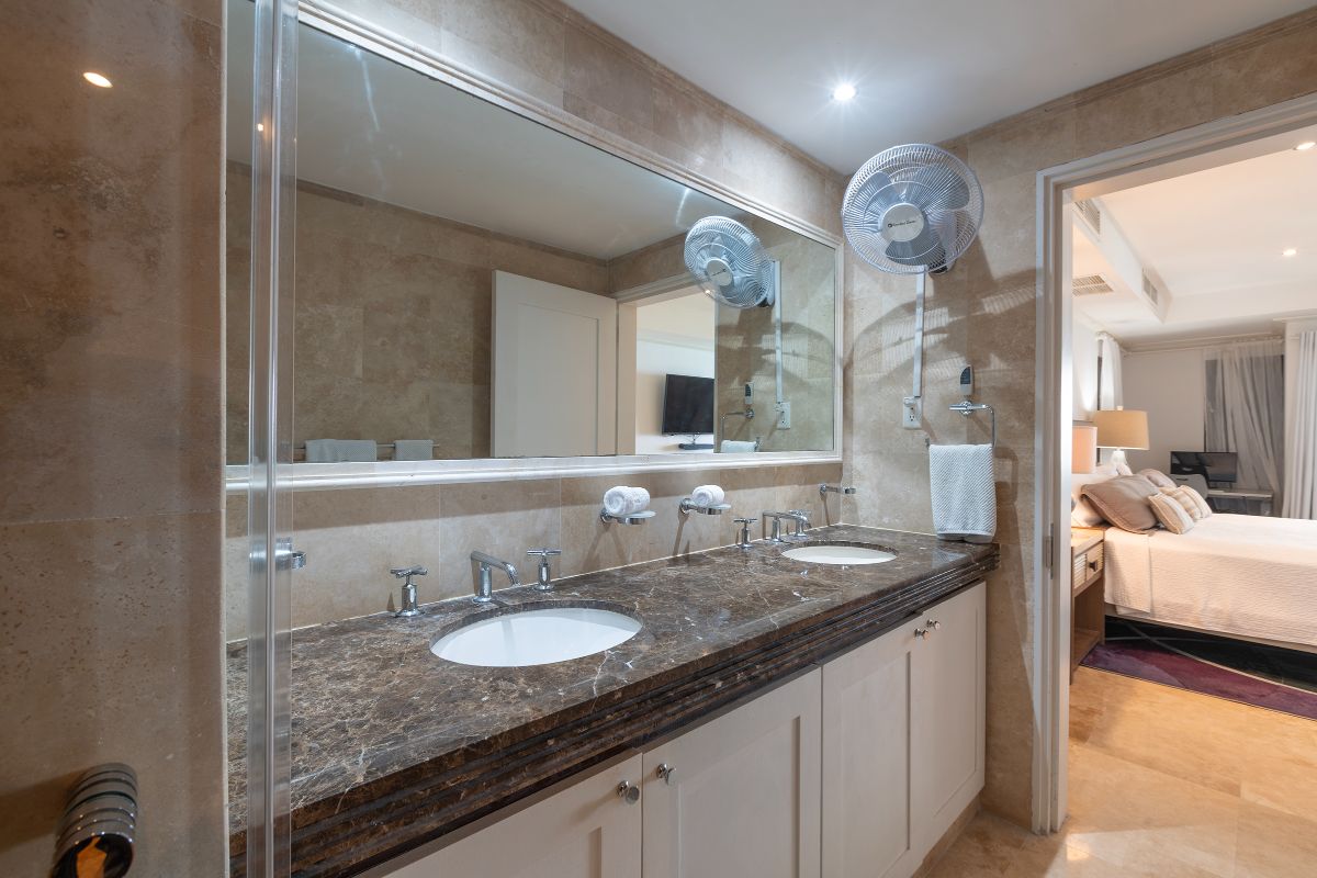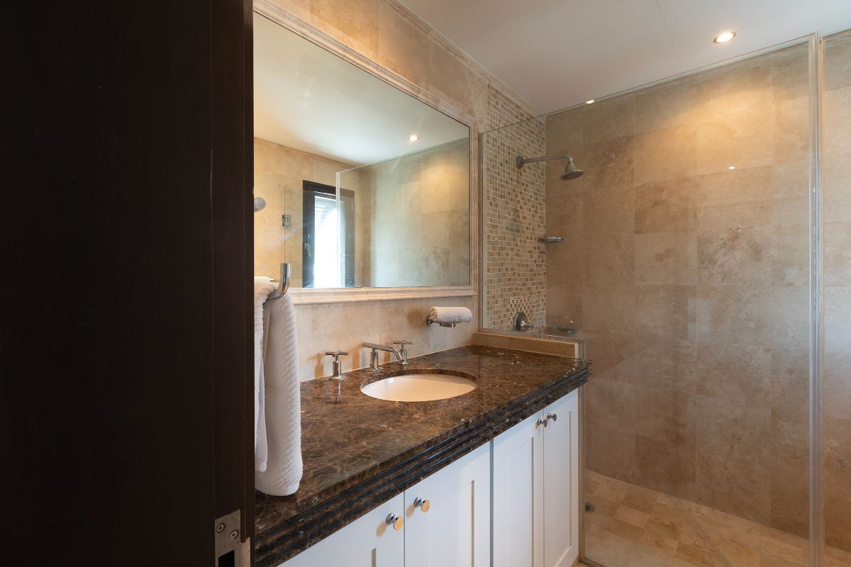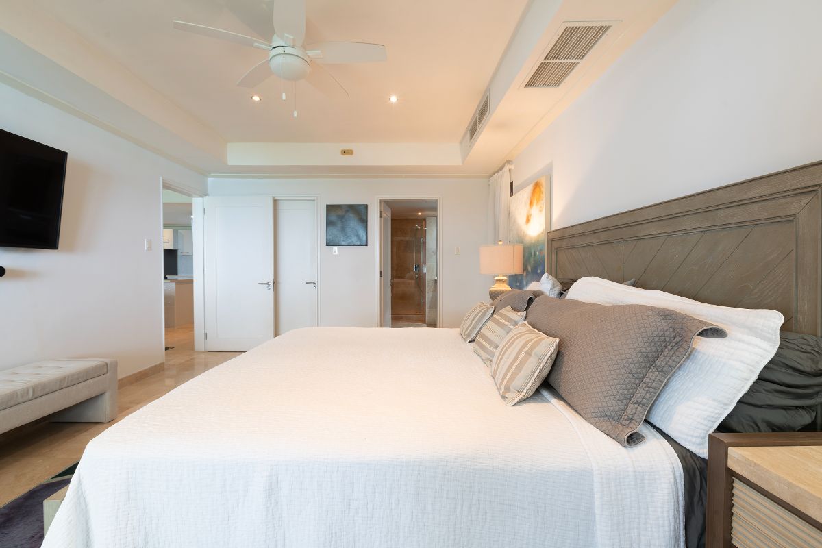 The condo features three beautifully appointed bedrooms, each with its own en-suite bathroom and air conditioning. The primary suite is a standout, offering breathtaking sea views, direct access to the main terrace via sliding doors, and a spacious walk-in wardrobe. Its luxurious en-suite bathroom includes a large double rain shower, double vanity, and toilet, creating a private spa-like retreat.