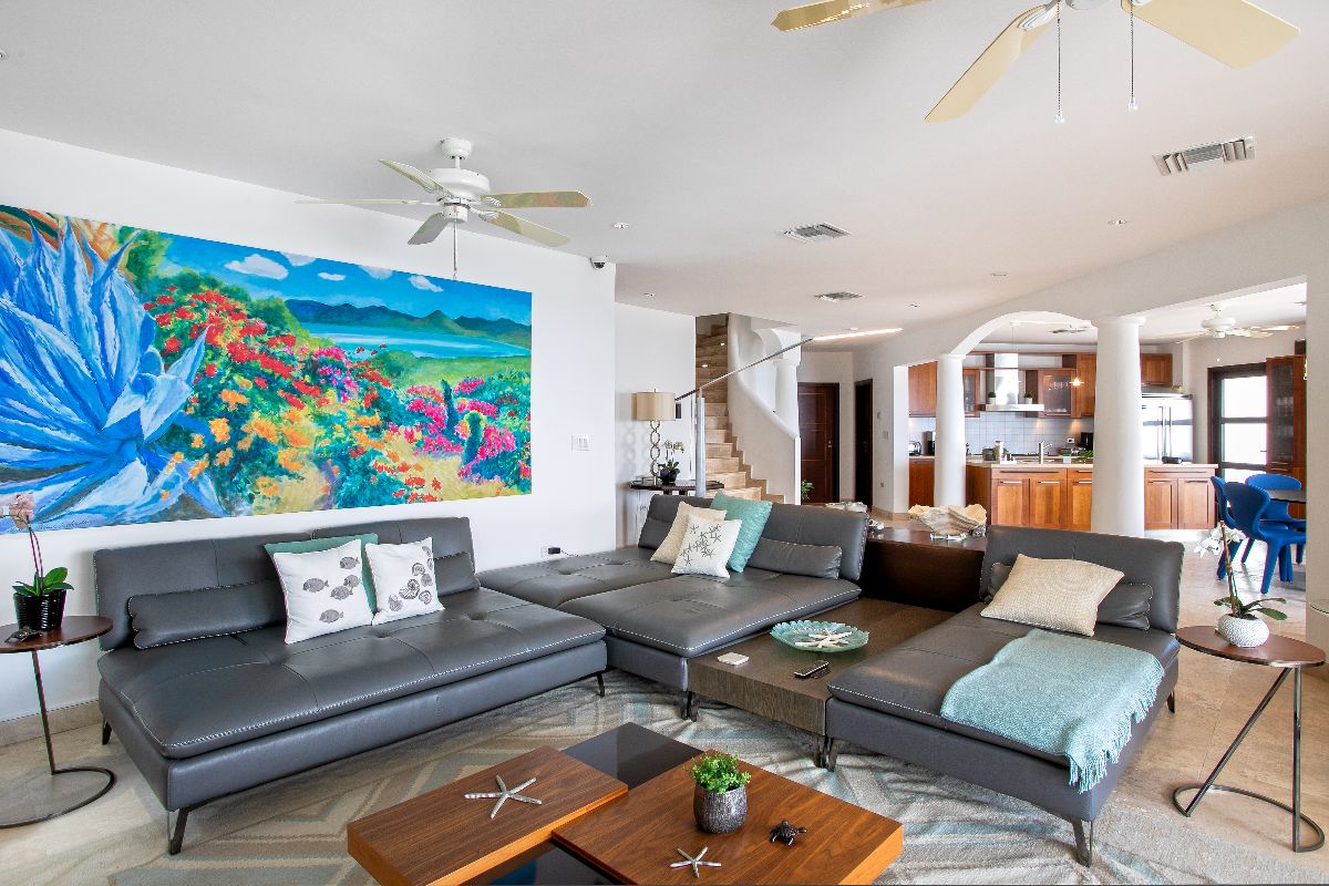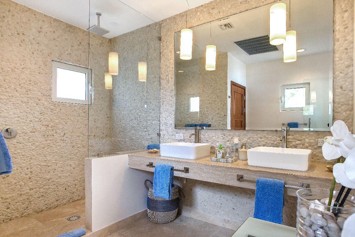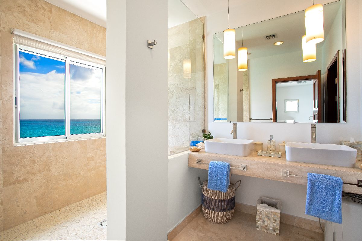 The villa’s outdoor spaces are designed for relaxation and connection. The expansive terrace features a stunning infinity-edge pool that seems to flow directly into the Caribbean Sea. A unique in-pool round seating area allows guests to enjoy the water while taking in the panoramic views. Comfortable loungers, shaded dining areas, and soft tropical breezes create an ideal atmosphere for sunbathing, socialising, or quiet contemplation. Fans and natural ventilation ensure a cool and comfortable experience year-round.