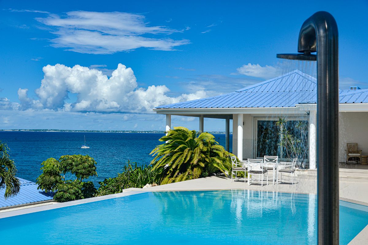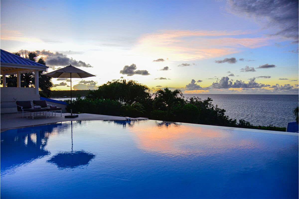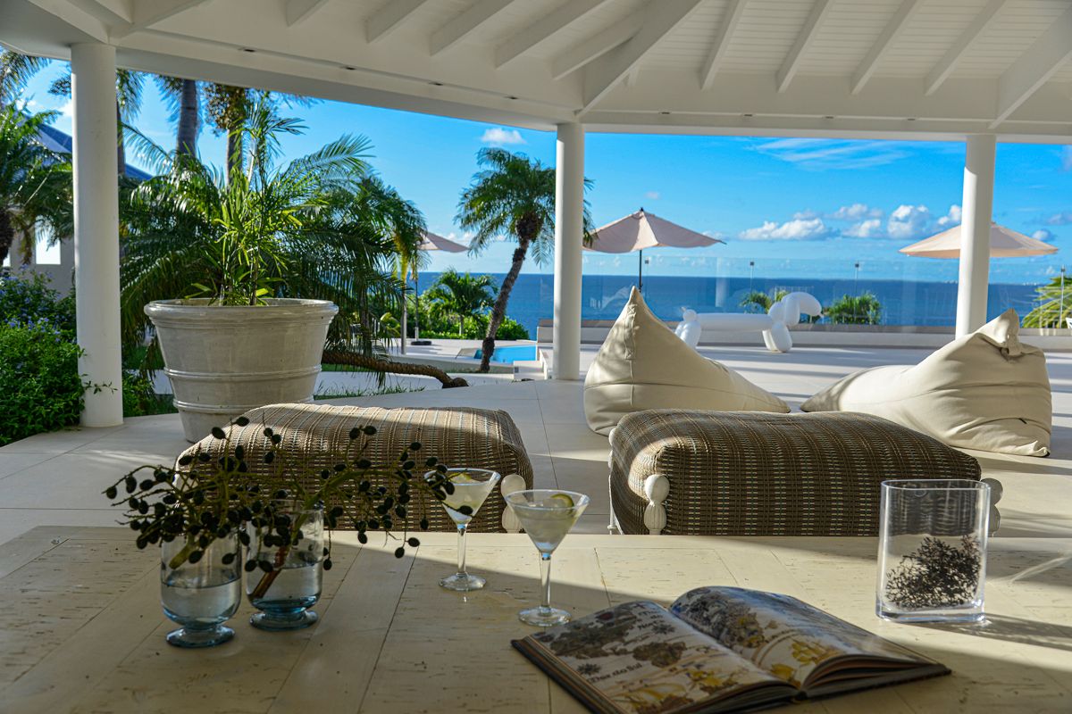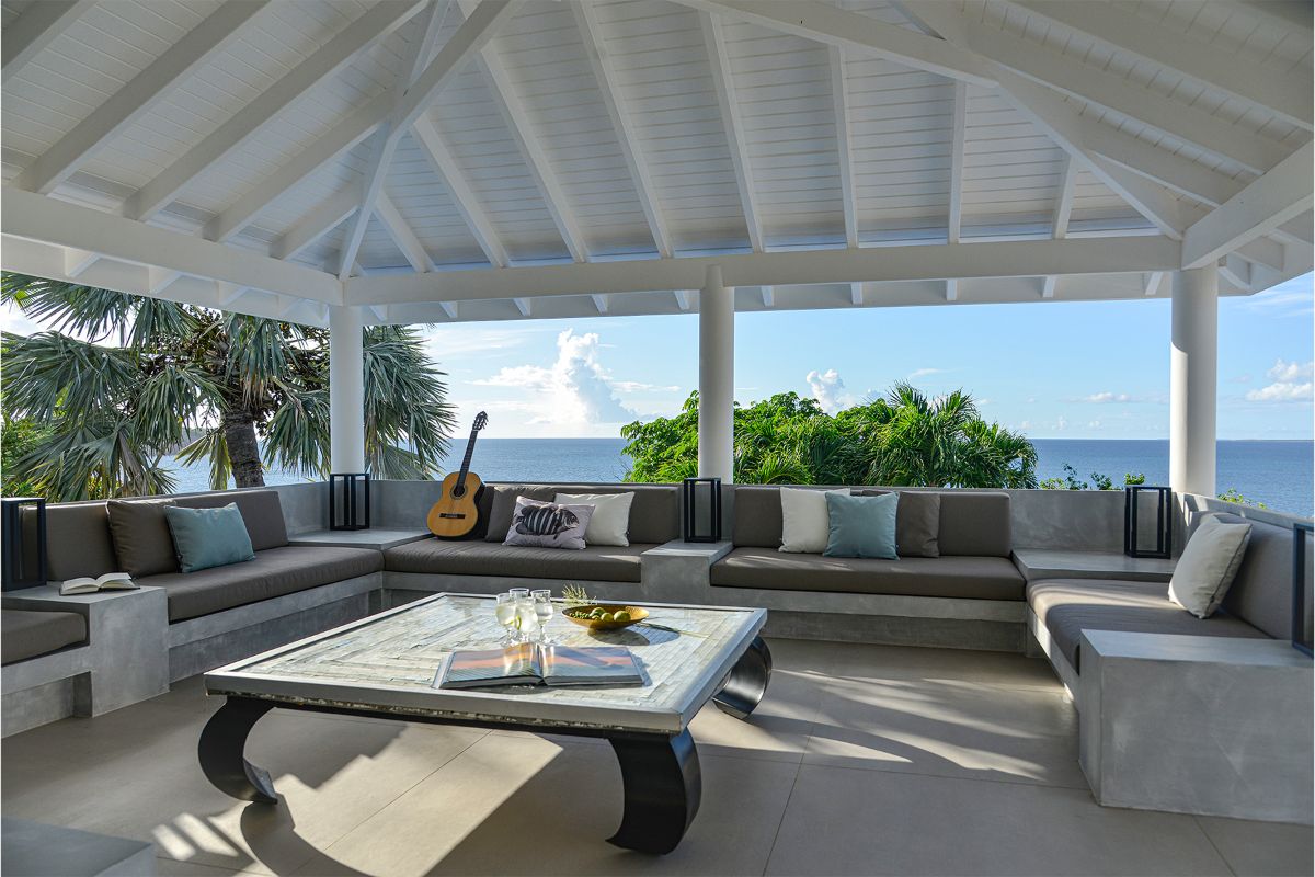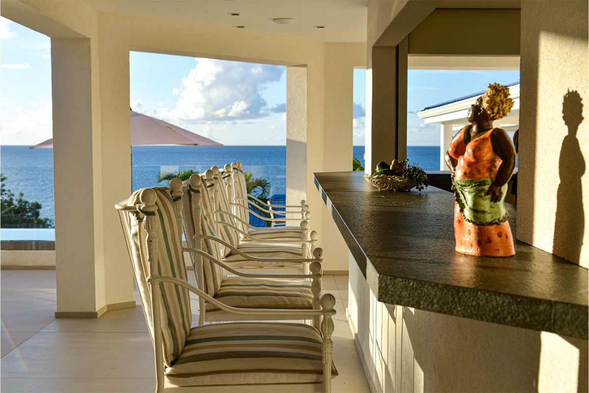 The villa’s expansive terrace serves as the heart of the home — a stunning outdoor sanctuary with endless views of the Caribbean Sea. A sparkling infinity pool invites you to take a dip under the warm island sun, while a gazebo positioned at the cliff’s edge offers a romantic spot to enjoy sunset views of Anguilla in the distance.
