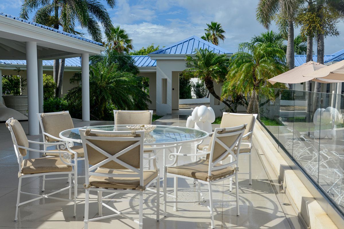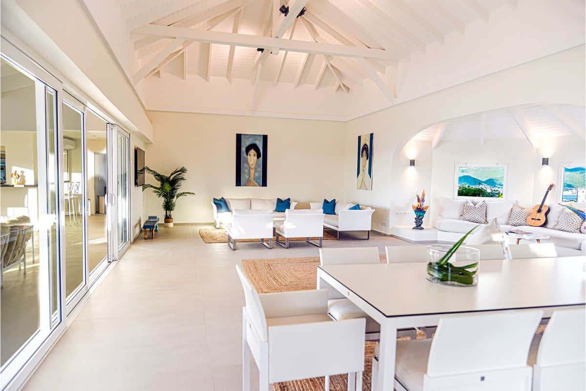 The air-conditioned family room provides a cool retreat, complete with a dining table for indoor meals and artwork by celebrated local artist Natalie Lepine, whose pieces reflect the vibrant culture of Saint Martin.