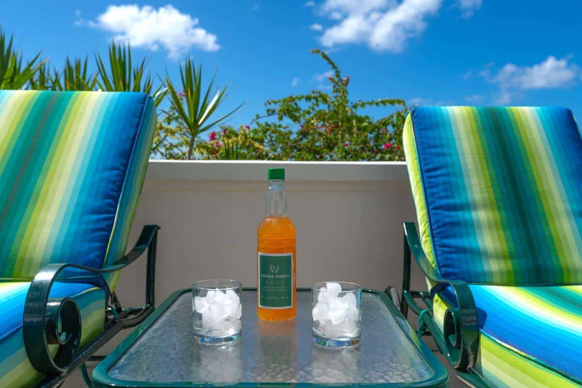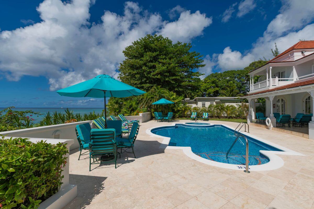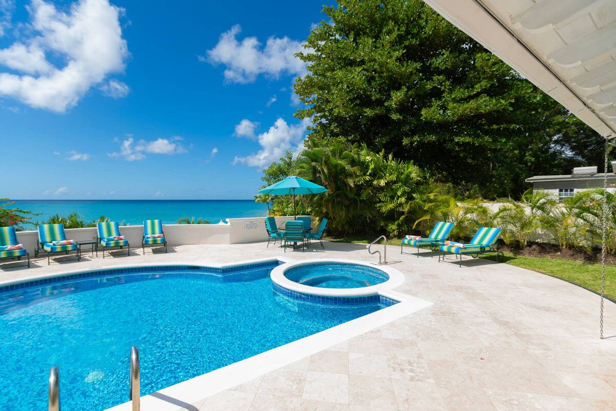The outdoor spaces at Fosters House are a highlight of the property. An elevated pool deck offers privacy and uninterrupted views over the turquoise sea and coral-sand beach below. Sun loungers and shaded areas invite guests to relax by the pool or enjoy a cocktail while taking in the scenery.