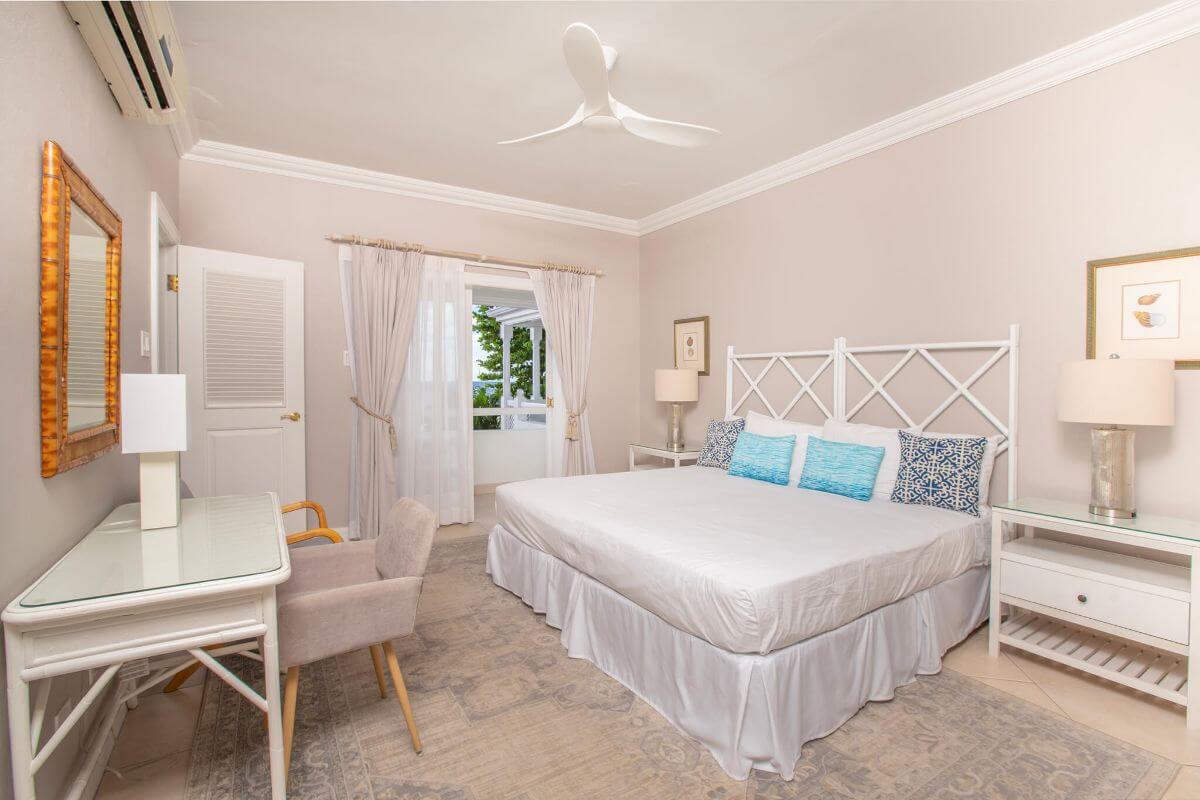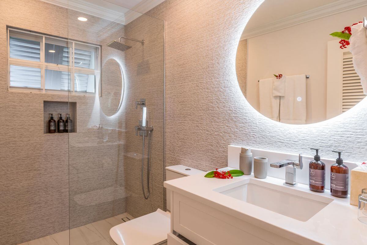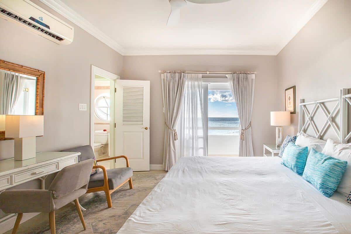 The villa features five spacious, air-conditioned bedrooms, each with its own en-suite bathroom. Four bedrooms are located on the upper level and open onto private balconies with stunning views of the Caribbean Sea. These rooms offer a peaceful retreat where guests can enjoy cooling breezes and panoramic ocean vistas.