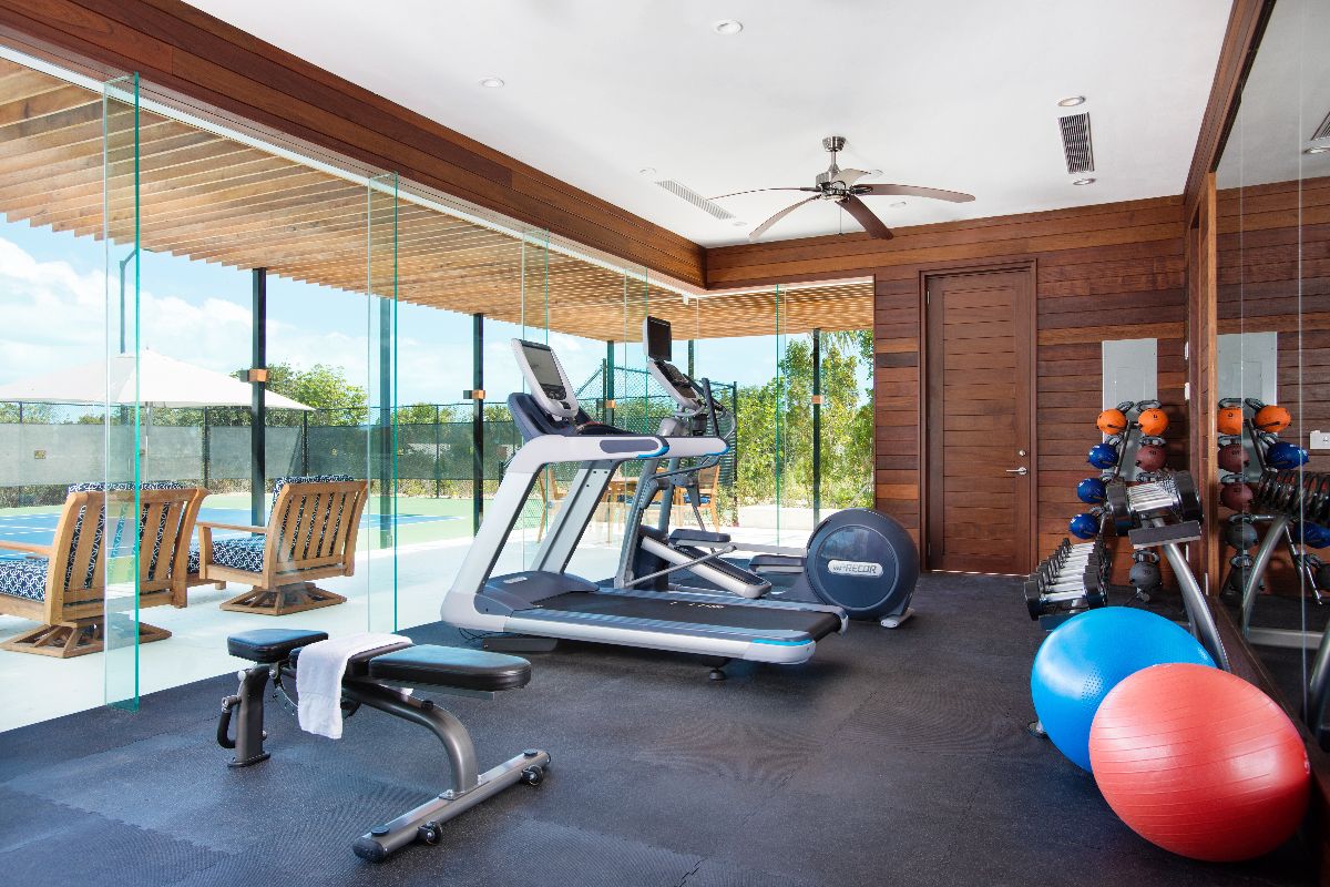 A fully equipped gym allows guests to maintain their wellness routines, while air conditioning, a house alarm system, and automated mosquito control enhance comfort and peace of mind.