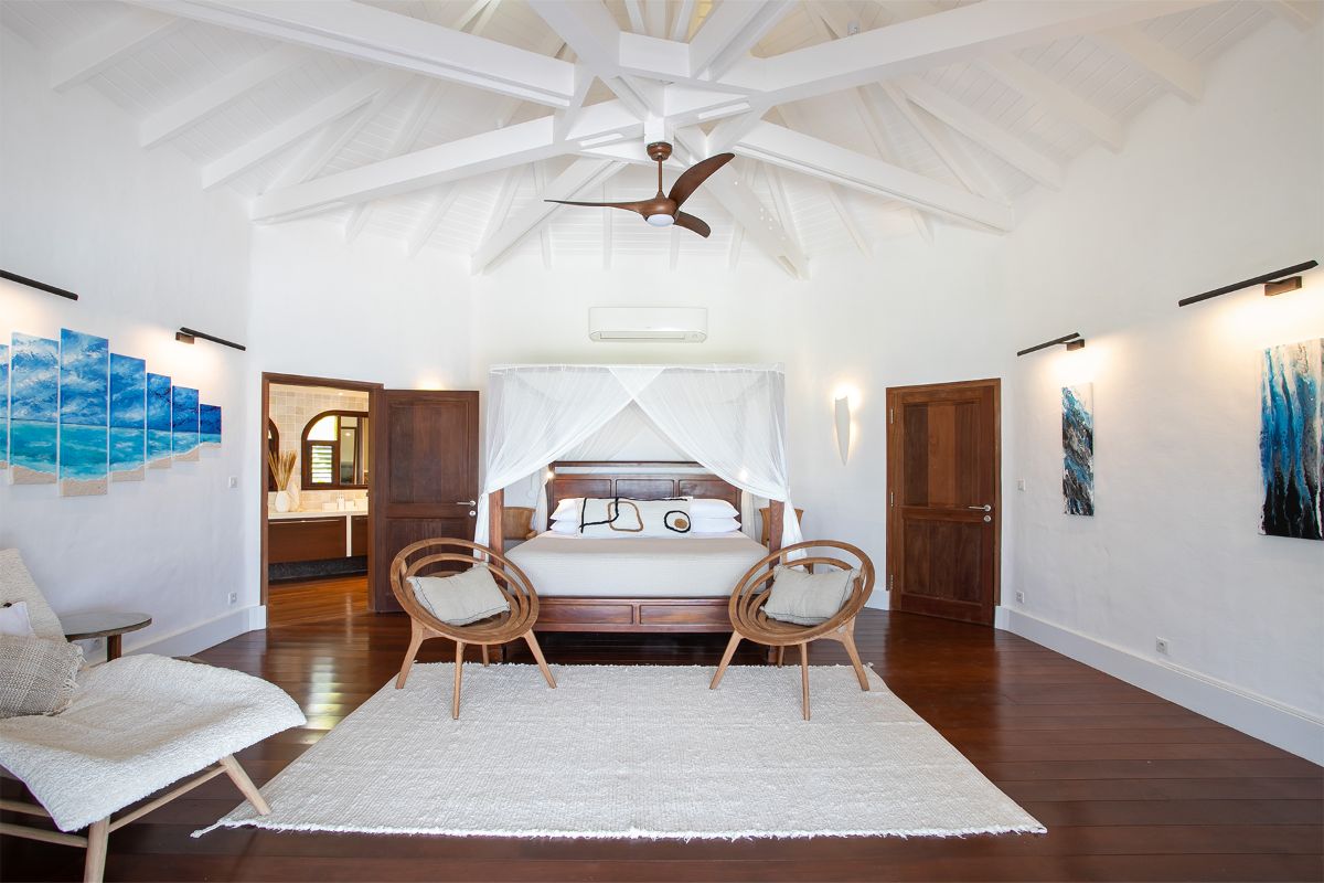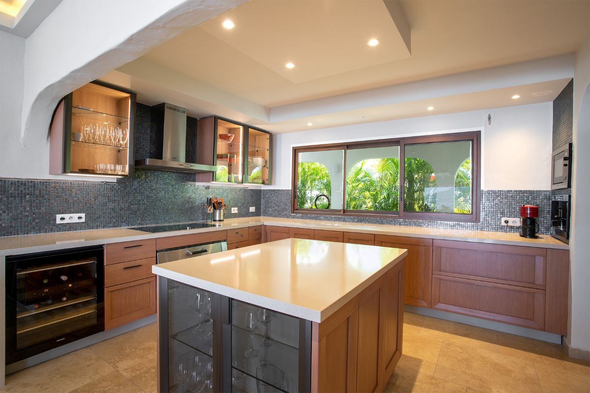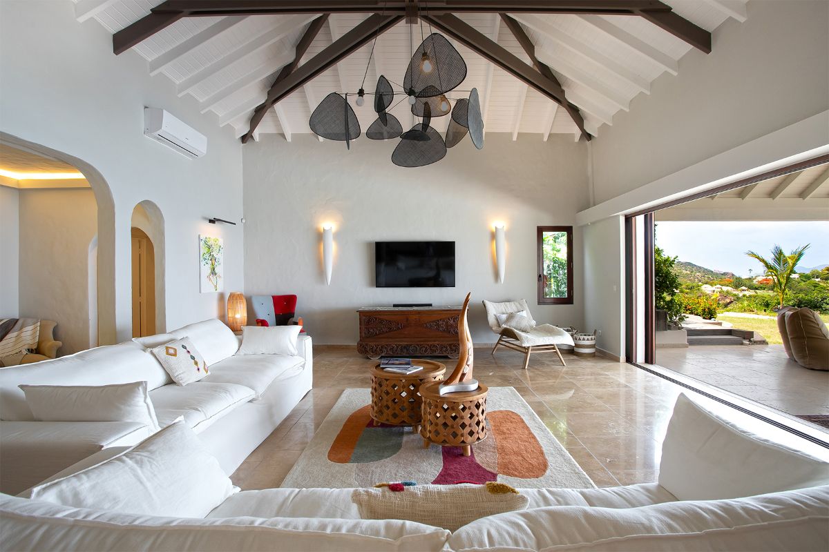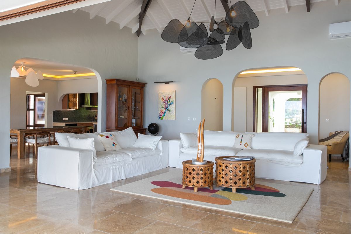 Step inside La Vue Folle, and you’re immediately drawn to its high ceilings, airy layout, and seamless flow. The spacious living room welcomes guests with plush seating, a large TV, and an advanced sound system—ideal for relaxing in comfort while escaping the Caribbean sun. Natural light filters through expansive glass doors, accentuating the home’s warm Mediterranean influences.