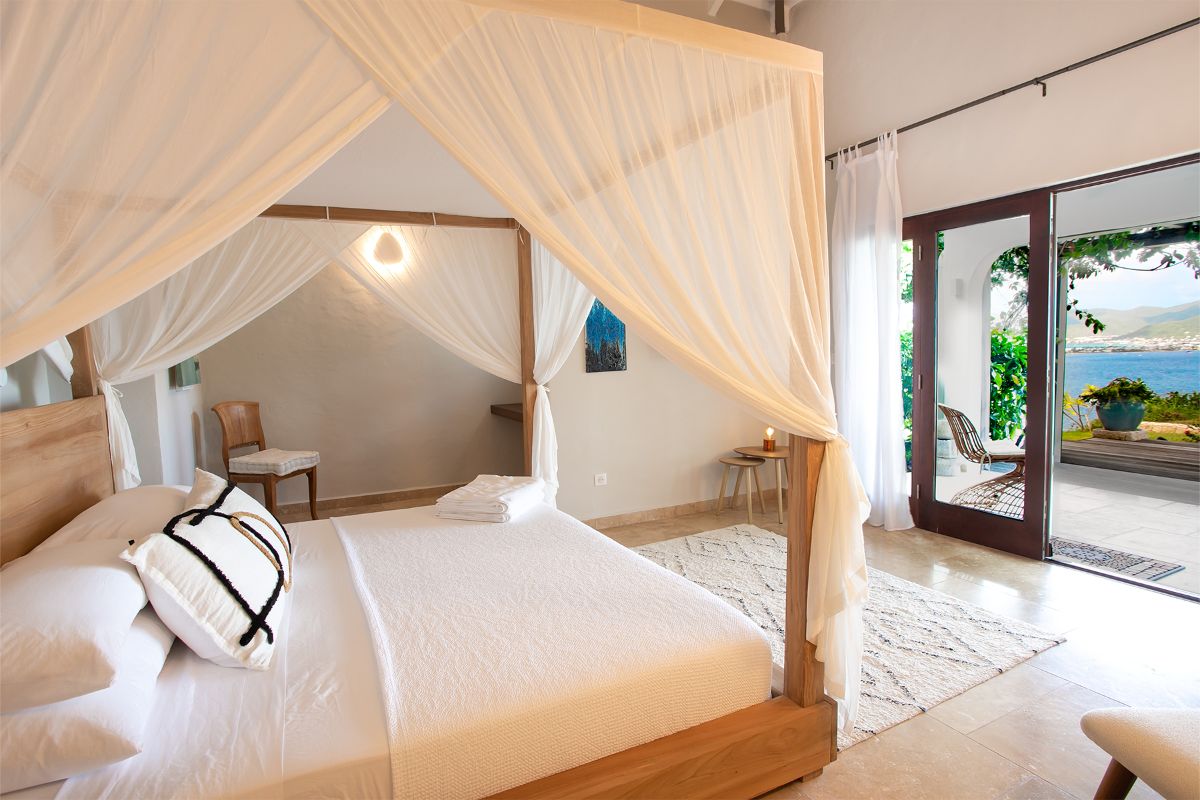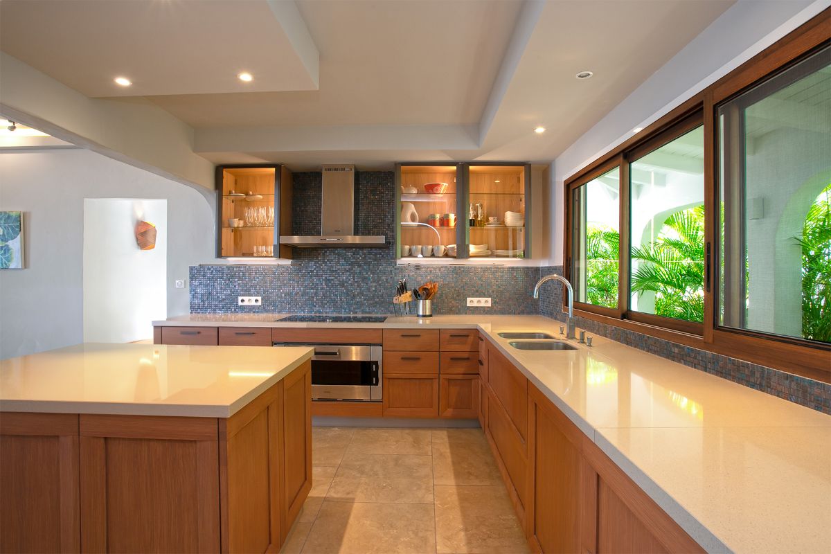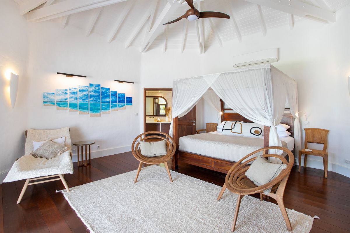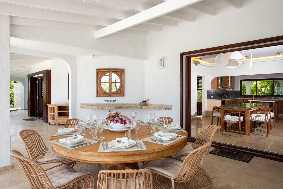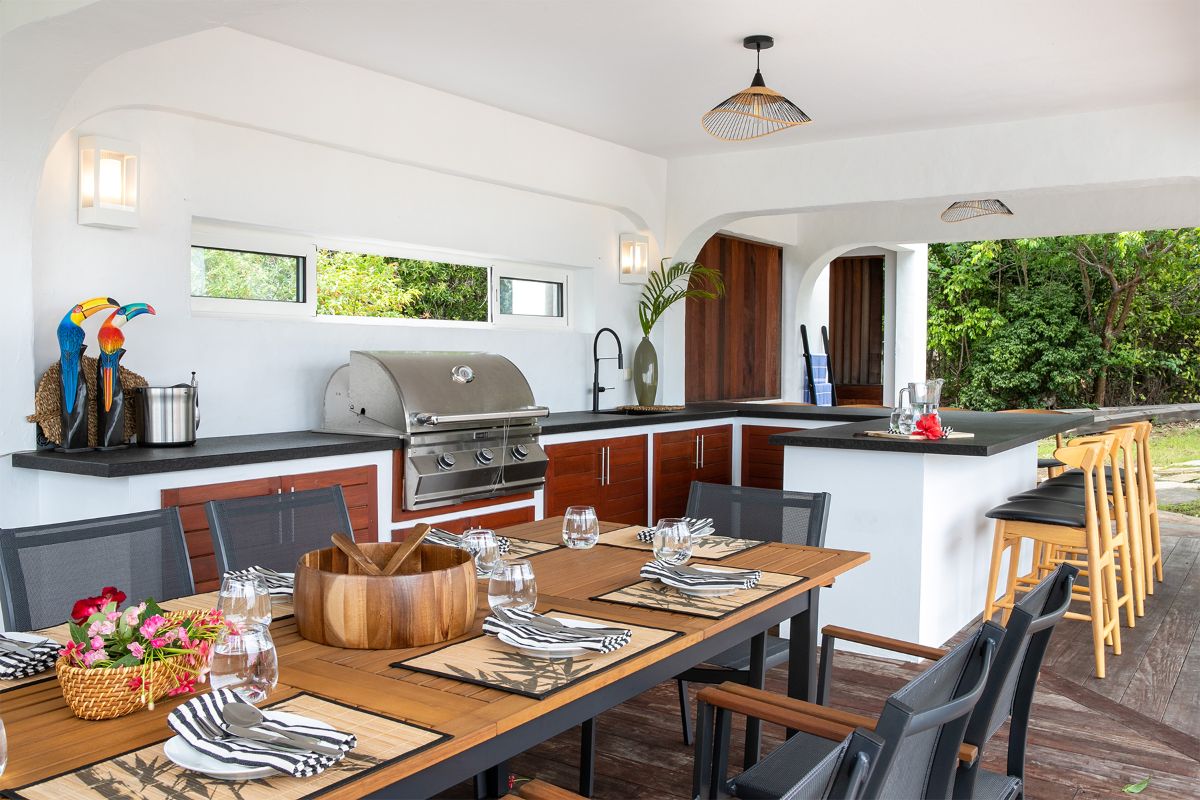 Step inside La Vue Folle, and you’re immediately drawn to its high ceilings, airy layout, and seamless flow. The spacious living room welcomes guests with plush seating, a large TV, and an advanced sound system—ideal for relaxing in comfort while escaping the Caribbean sun. Natural light filters through expansive glass doors, accentuating the home’s warm Mediterranean influences.