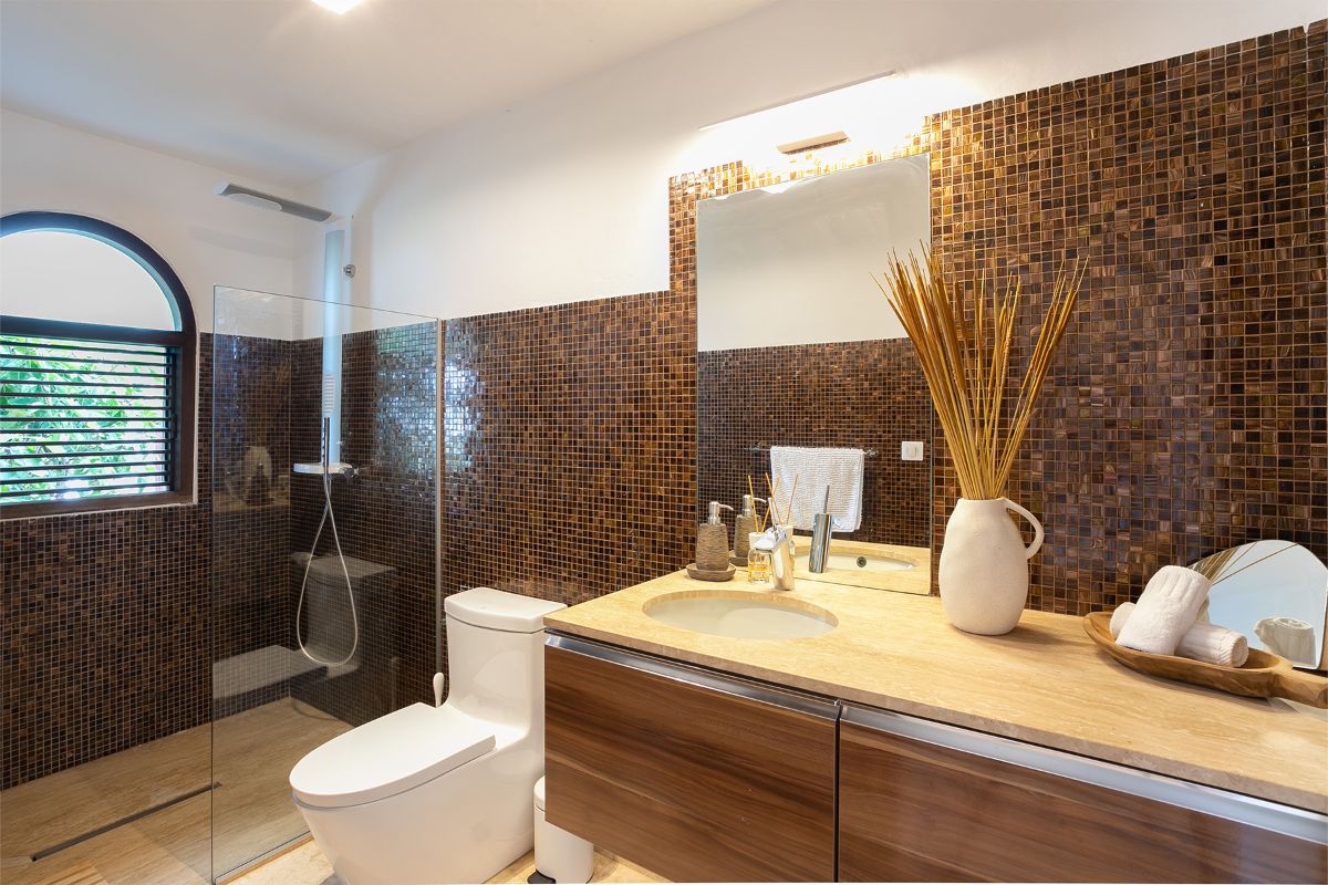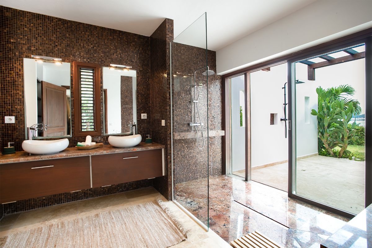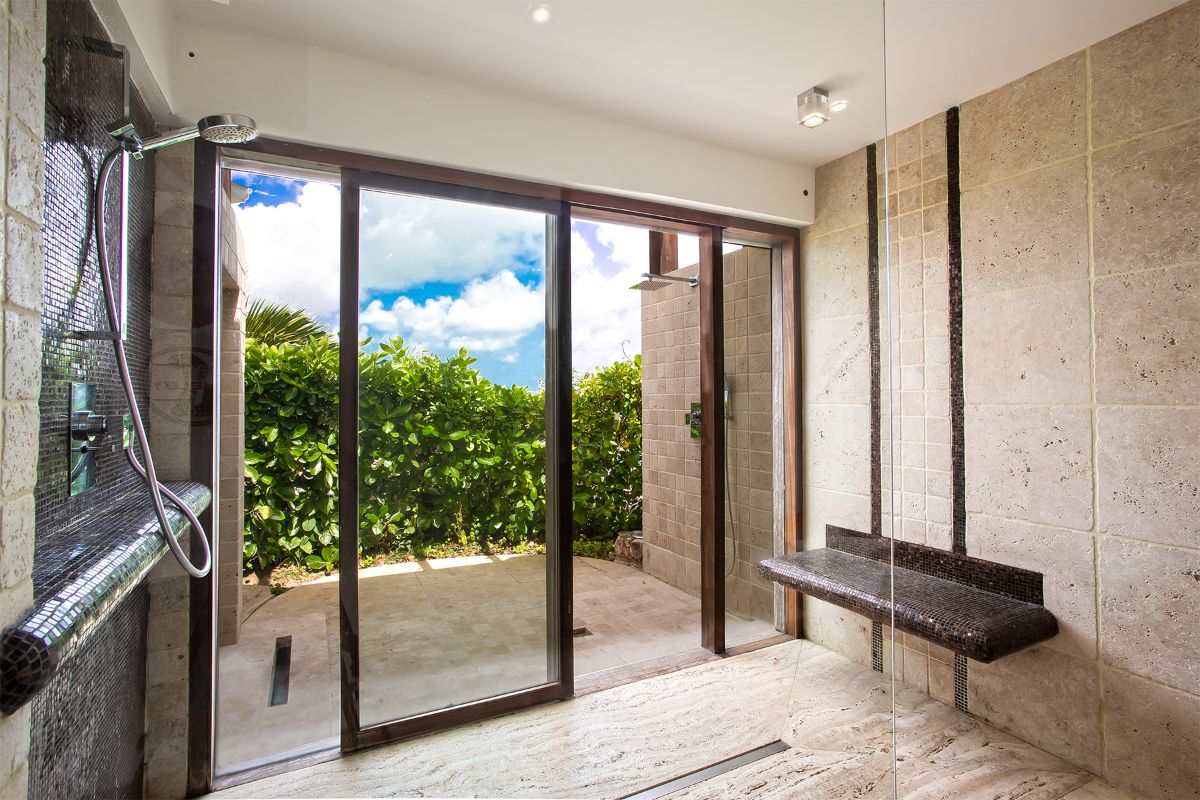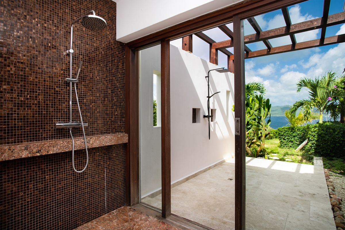 La Vue Folle boasts three luxurious bedrooms, each designed as a personal retreat with king-sized beds, spacious closets, and private terraces. The primary suite offers both indoor and outdoor access, featuring a lavish ensuite with a jacuzzi overlooking stunning views, double sinks adorned with artistic mismatched tiles, and dual showers—one indoor and one outdoor—allowing guests to bathe in harmony with nature.