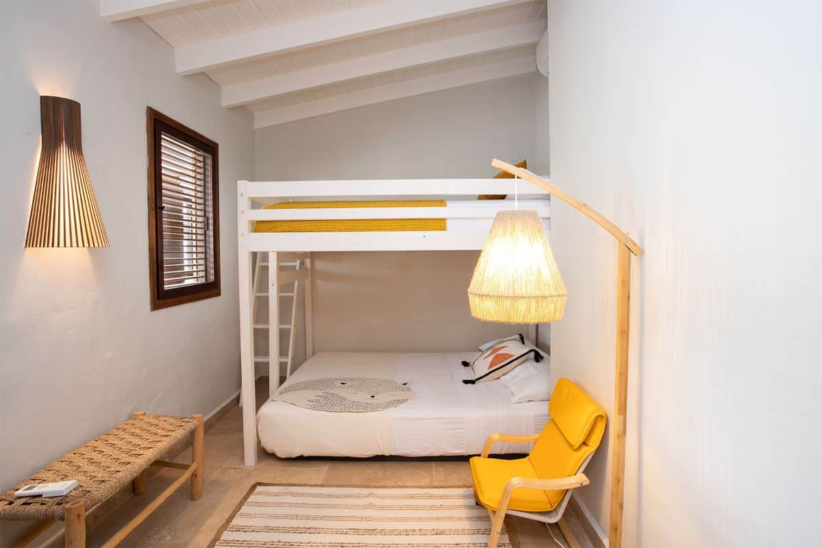 The second bedroom, adjoining the living area, includes a king bed and a built-in bunk bed, ideal for families. It opens to a private outdoor oasis enveloped in lush foliage. The third bedroom, accessed via its own entrance near the villa’s front, is equally inviting with soaring ceilings, a cosy low bed, and both indoor and outdoor showers, echoing the villa’s connection to the natural environment.