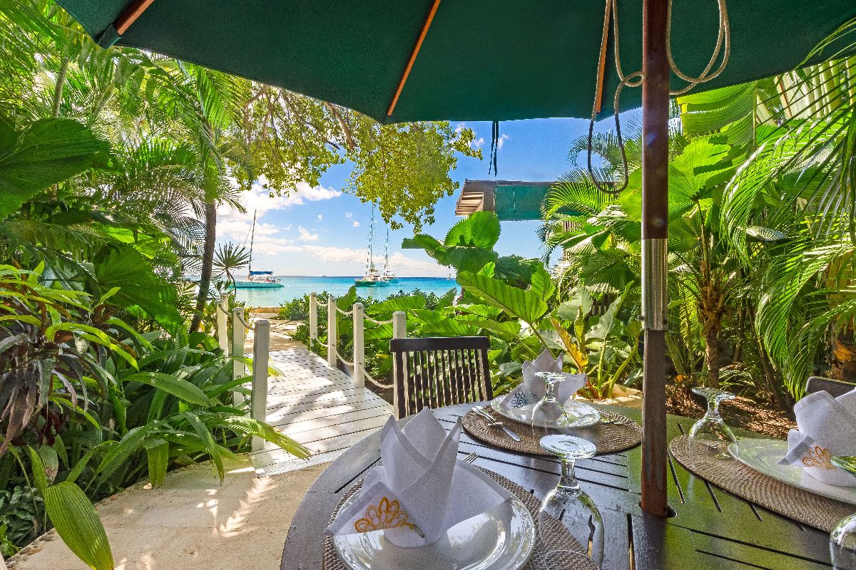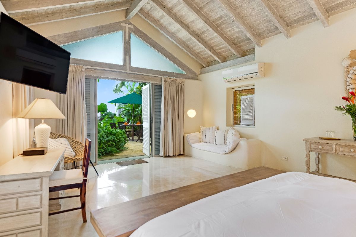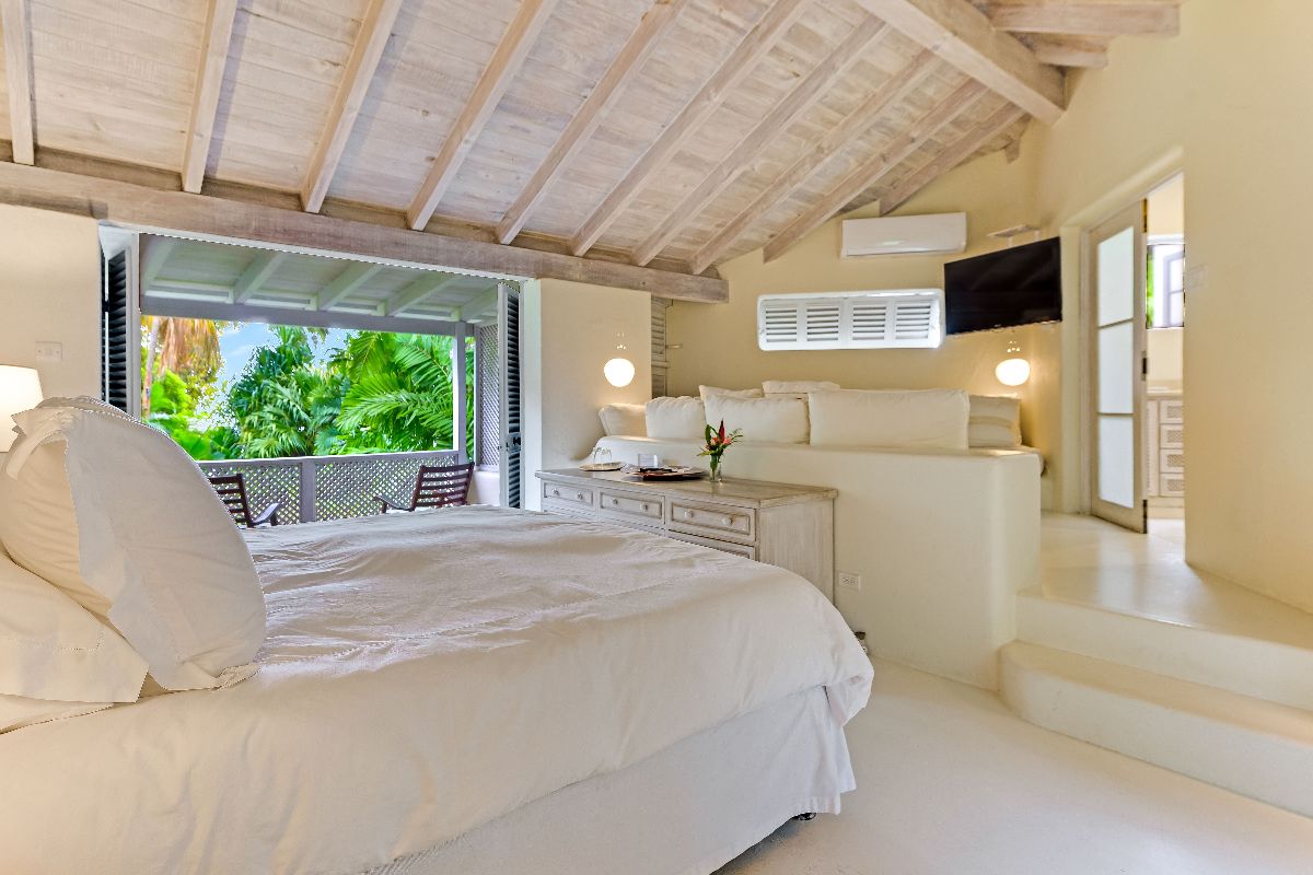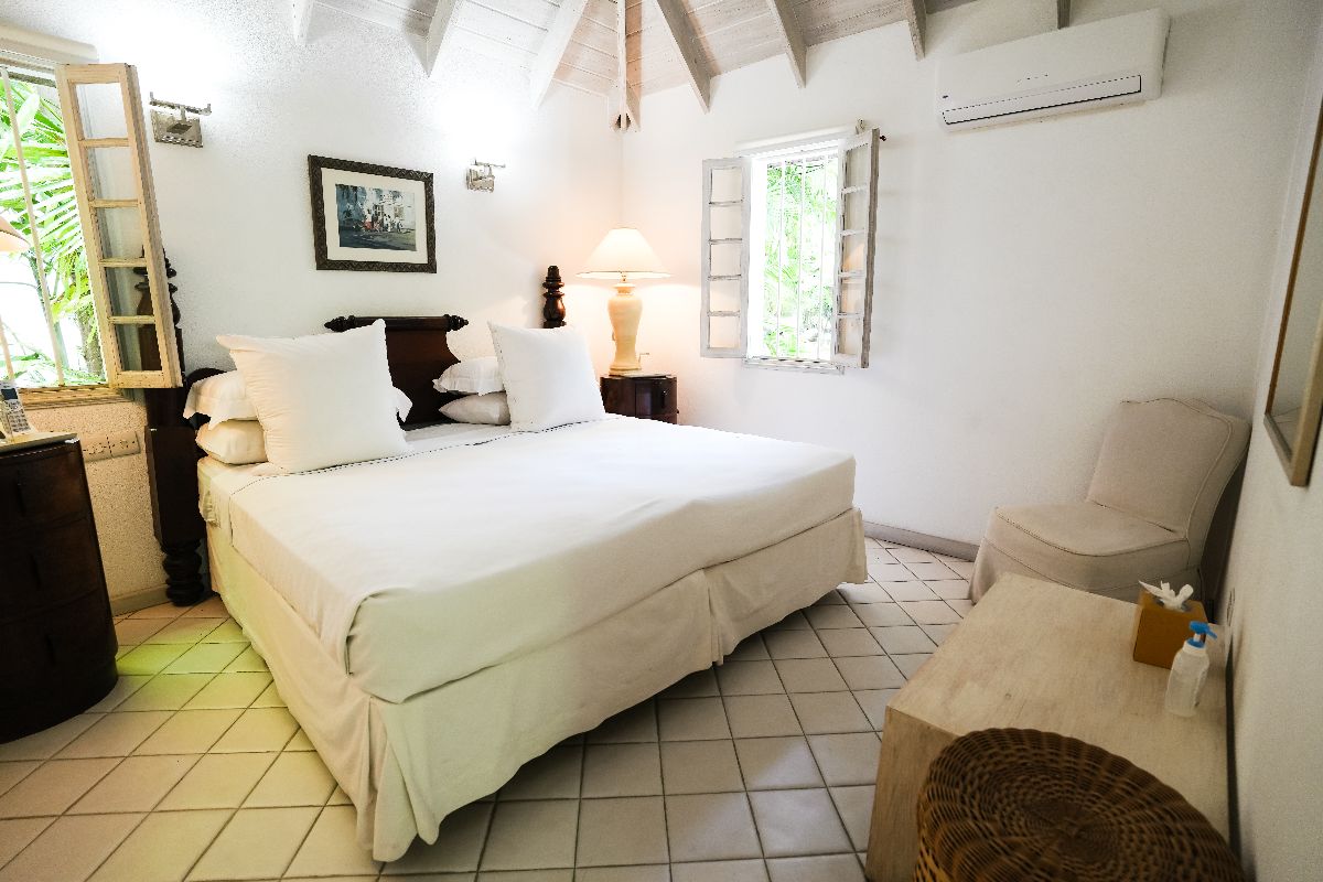 The main house features four beautifully appointed air-conditioned suites, each with its own private bathroom. Three suites are located on the ground floor, while one occupies the upper level. All bedrooms overlook the lush gardens and the sparkling Caribbean Sea, providing tranquil retreats with cooling breezes and picturesque views.