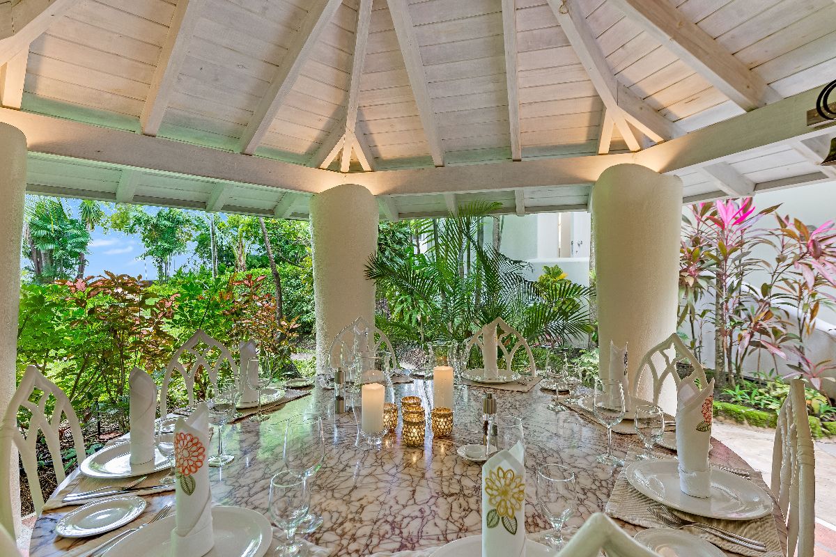 The separate dining pavilion enhances the sense of space and allows guests to enjoy meals in a setting that feels both intimate and connected to the surrounding gardens.
